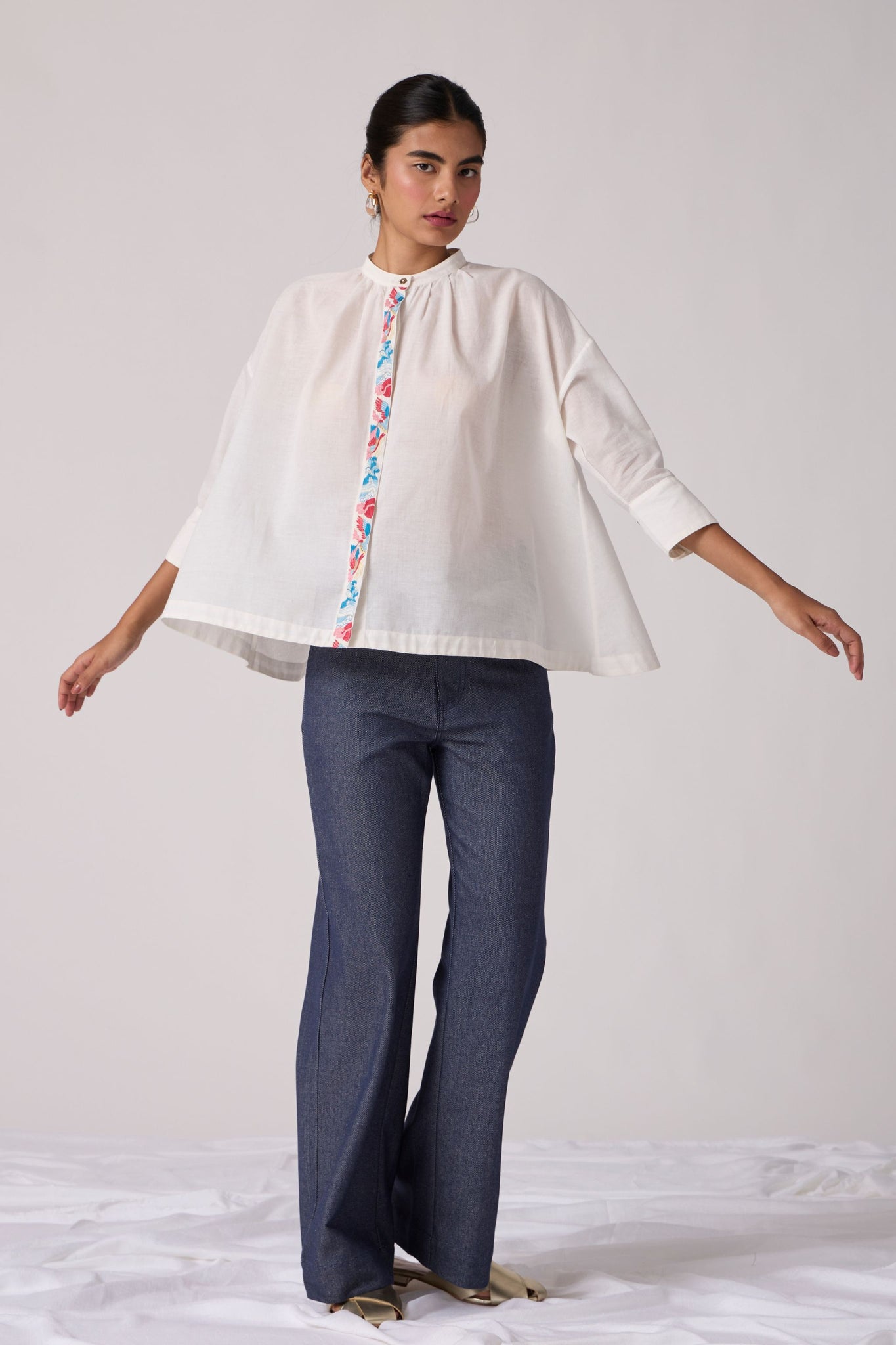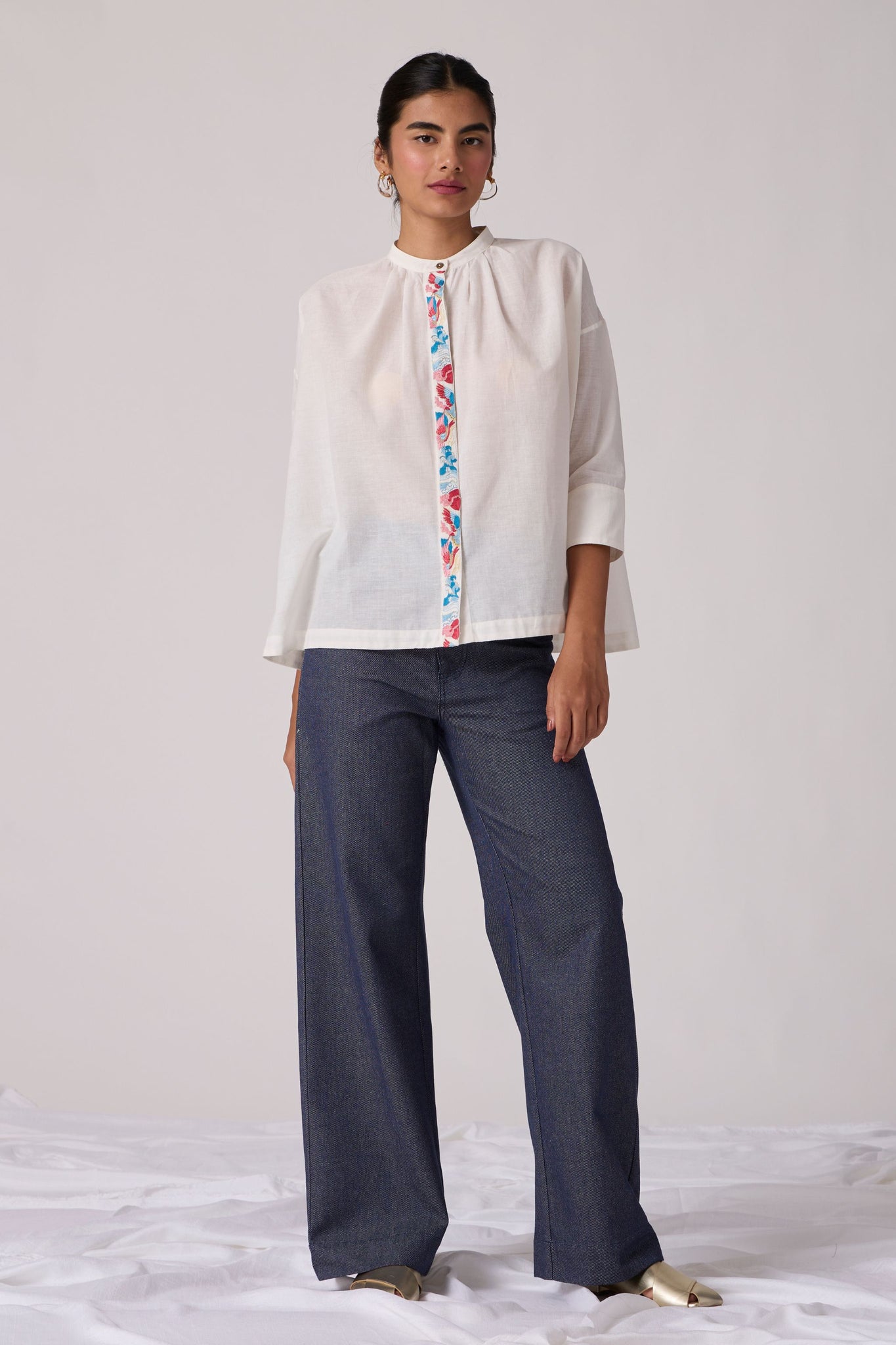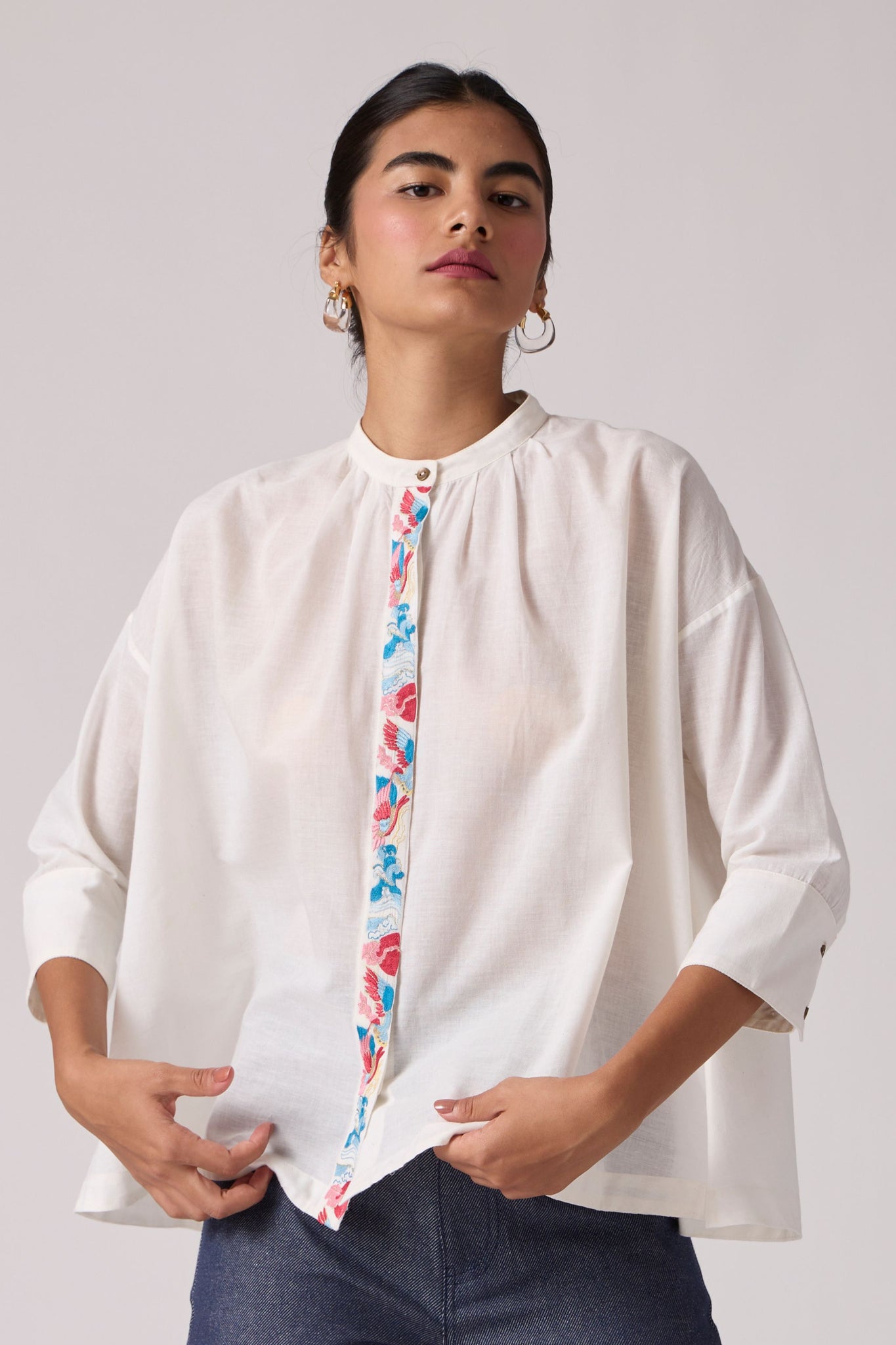 Flared top with a slim band collar. Concealed button placket with a single button revealed at top. Gentle gathers into the front neck. Three quarter length sleeves featuring a wide cuff with three button fastening. Crafted from khadi.