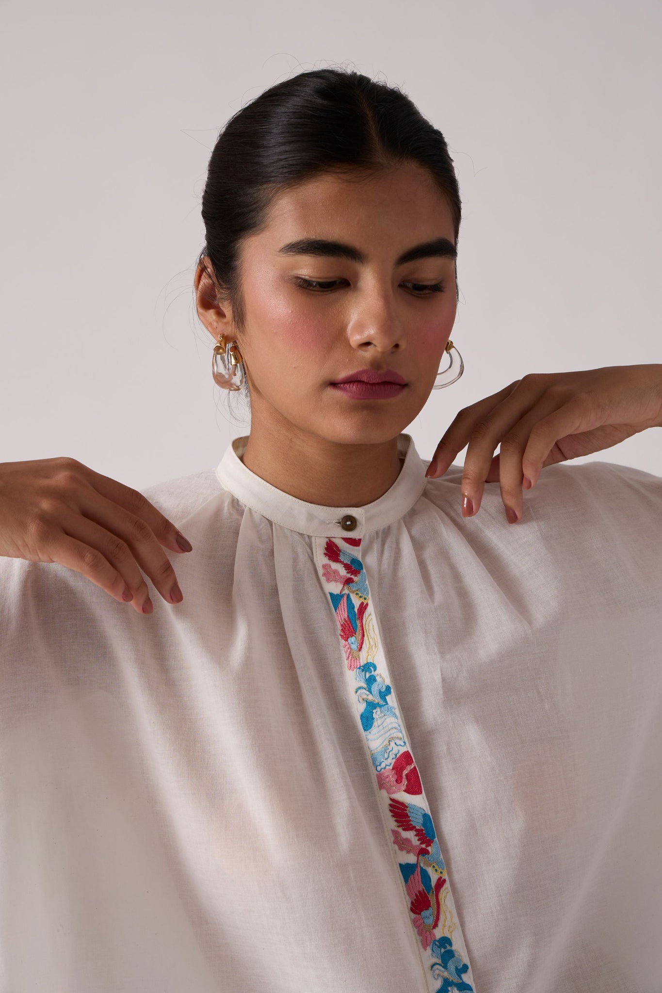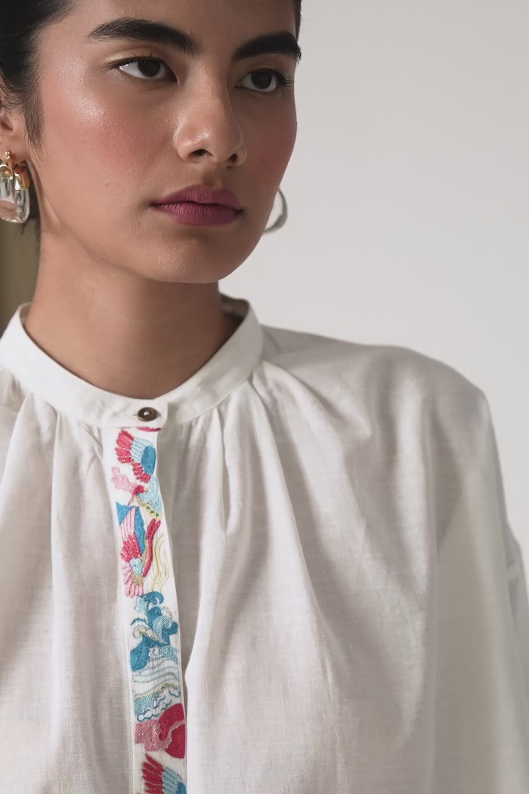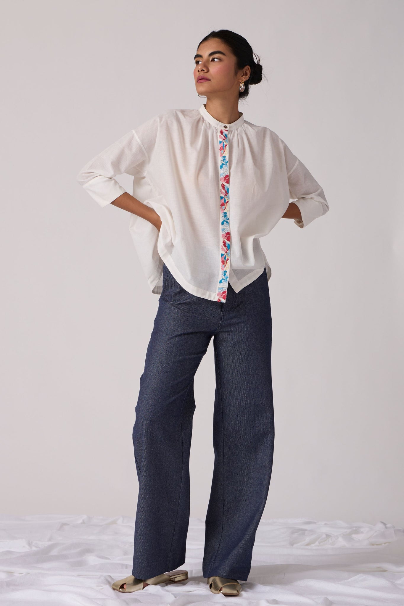Flared top with a slim band collar. Concealed button placket with a single button revealed at top. Gentle gathers into the front neck. Three quarter length sleeves featuring a wide cuff with three button fastening. Crafted from khadi.