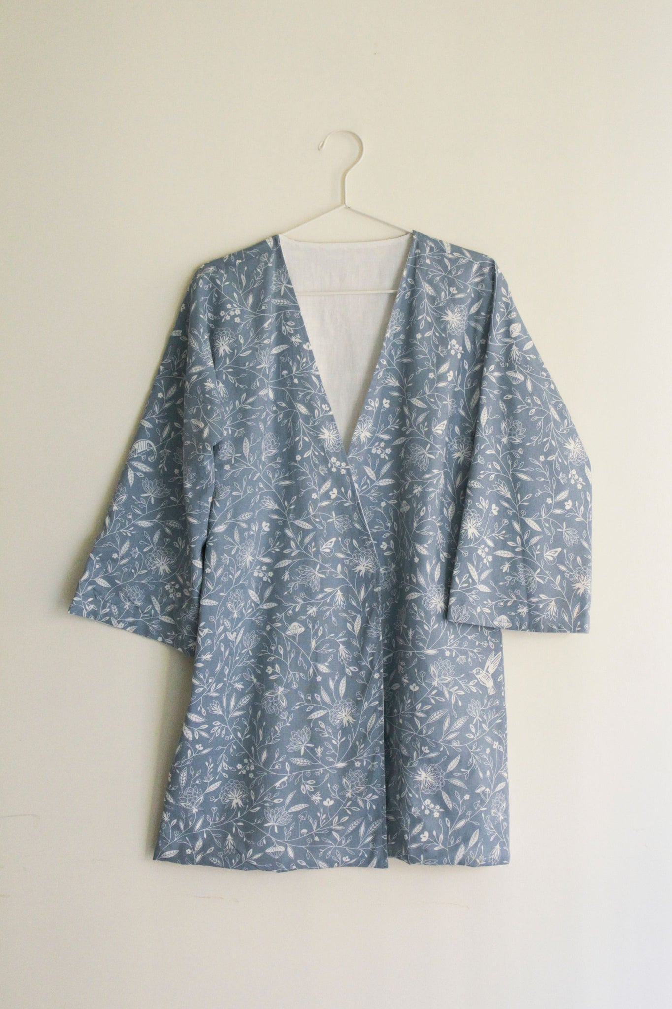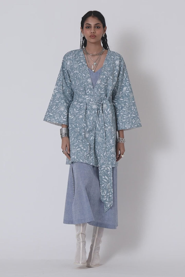 Kimono-inspired reversible jacket. Signature print in handwoven cotton on one side. Vintage hand embroidered floral motifs on the other. Drop shoulder.