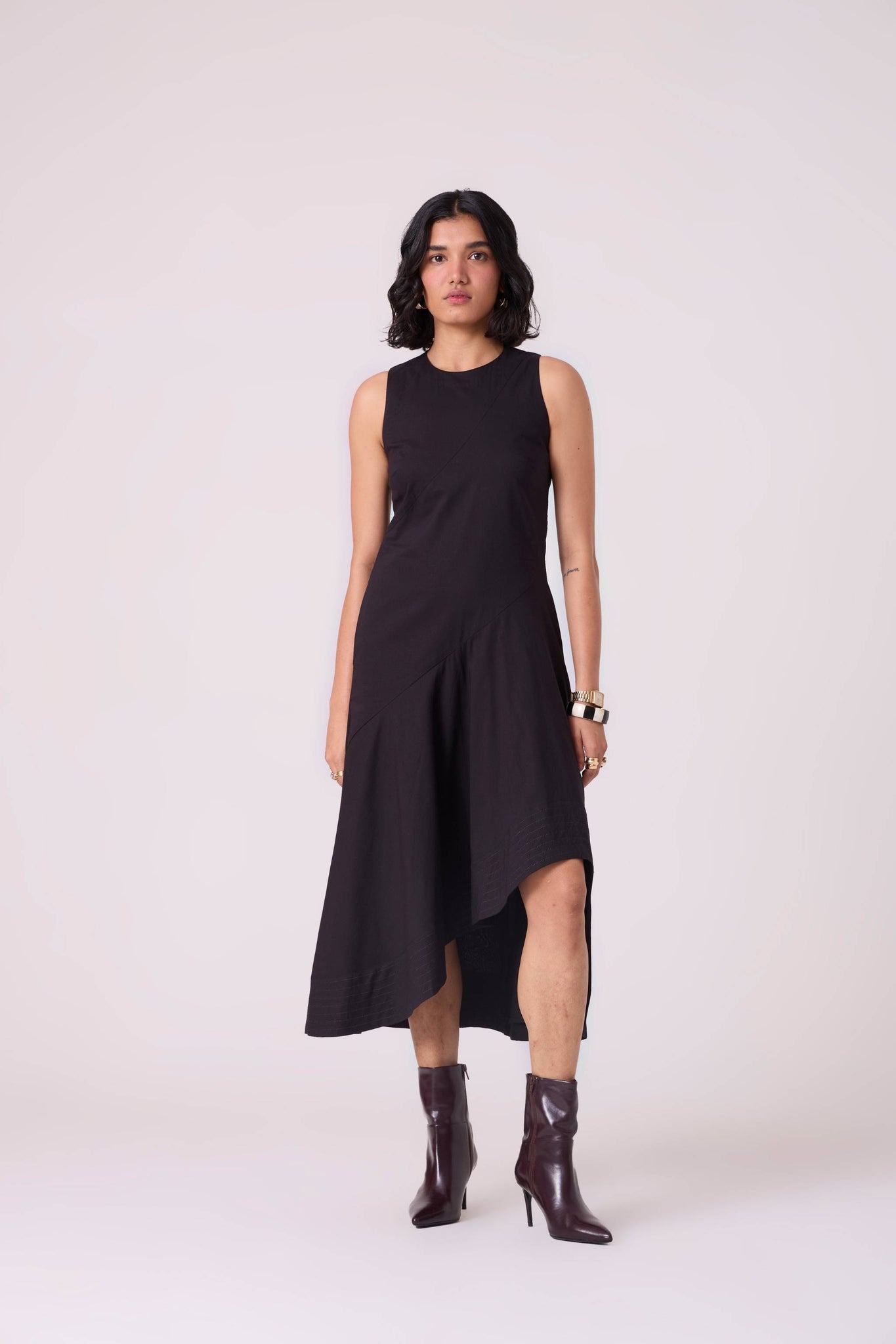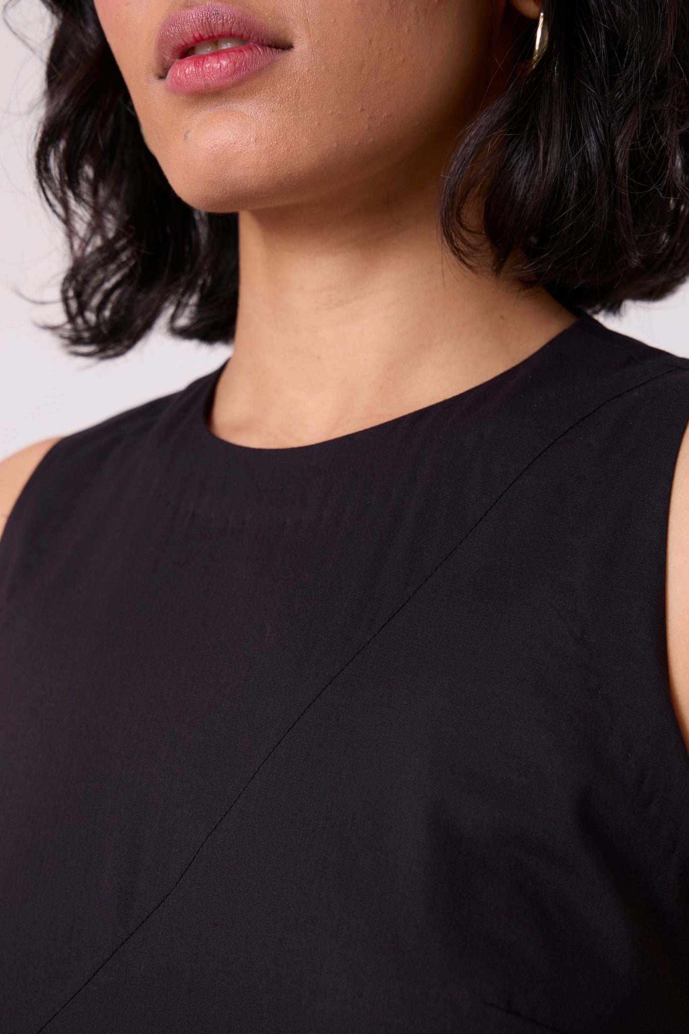 A sleeveless draped silhouette that moves effortlessly. The high-low hem introduces an unexpected shape, while contrast stitching reinforces its clean, modern flow.