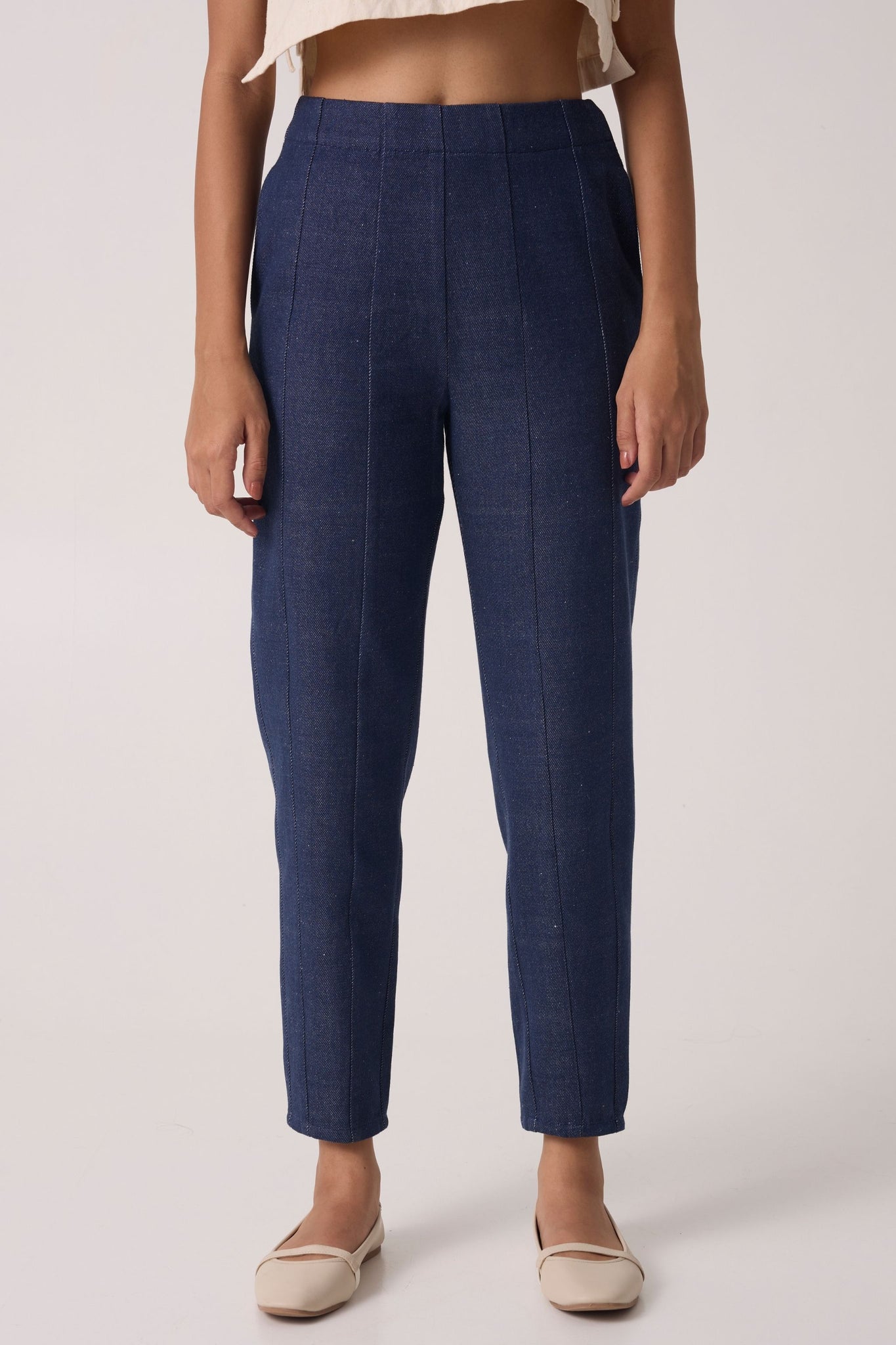 High-rise denim pants with paneling. Inseam pockets and a side zipper fastening.