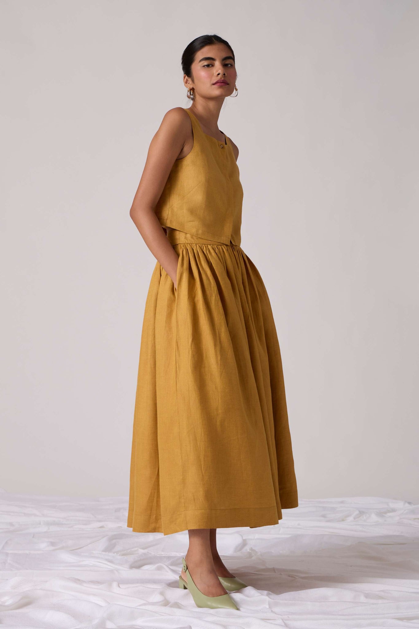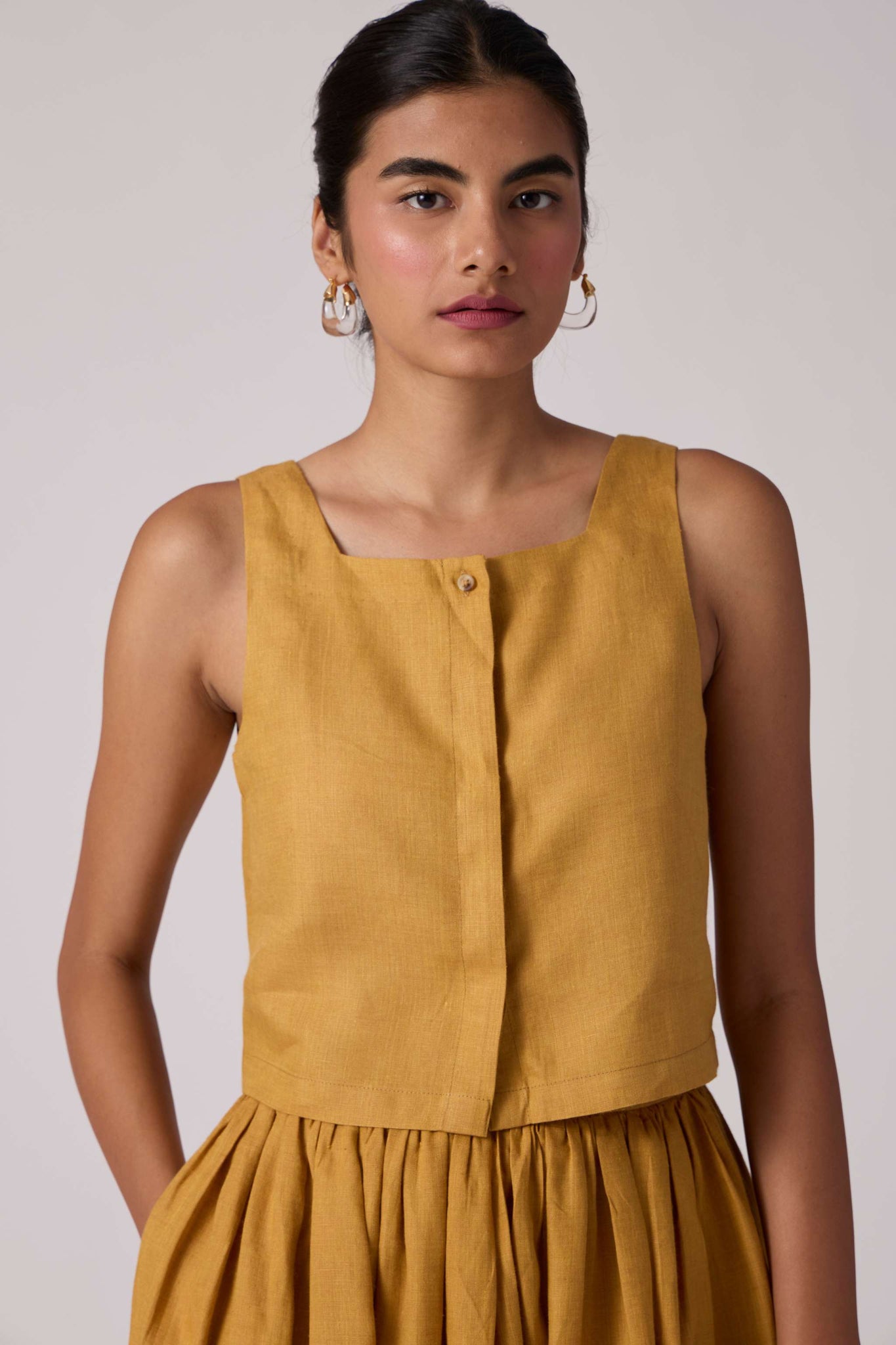 Crop top with high square neckline and broad straps. Concealed placket. Tailored darts in the front and back to give shape where you might want it. Cut from lush organic linen.