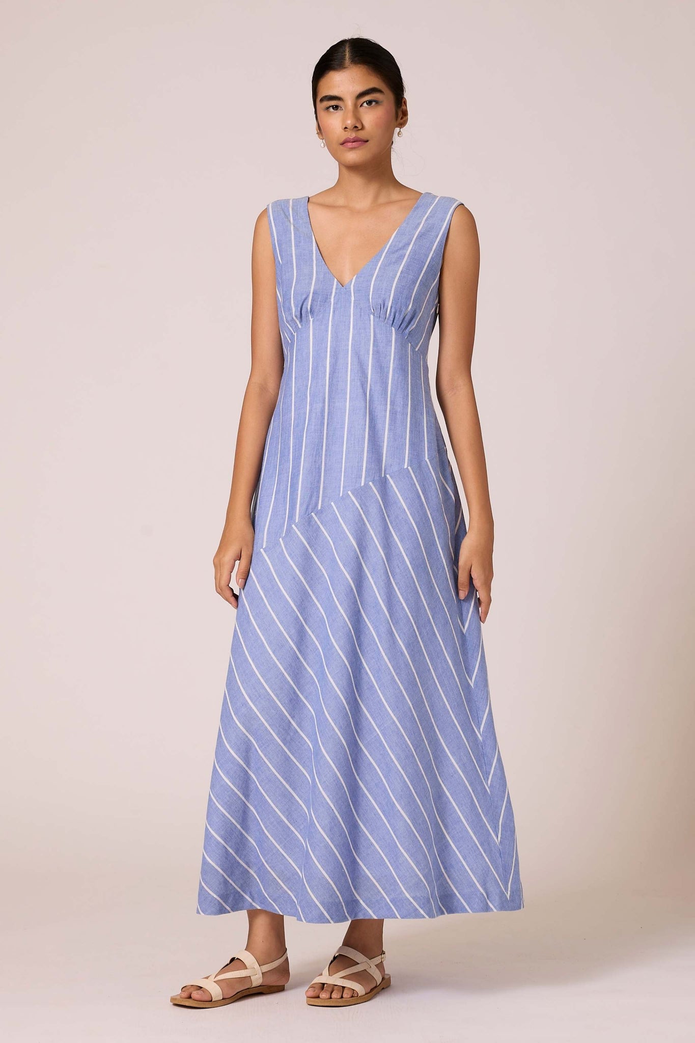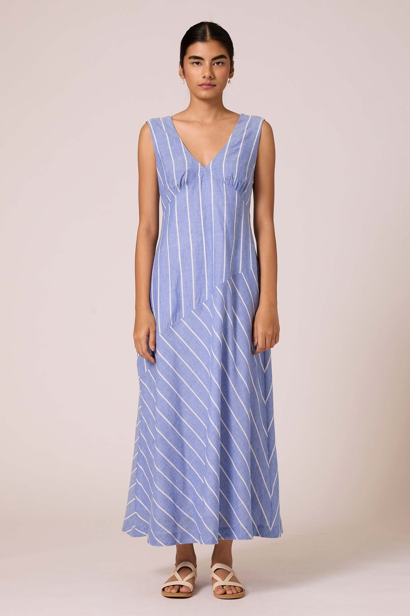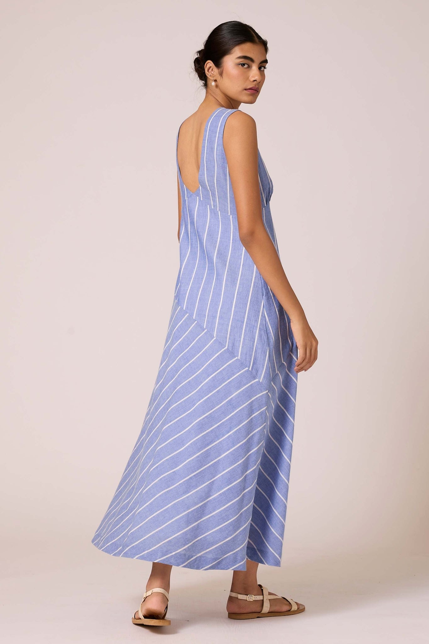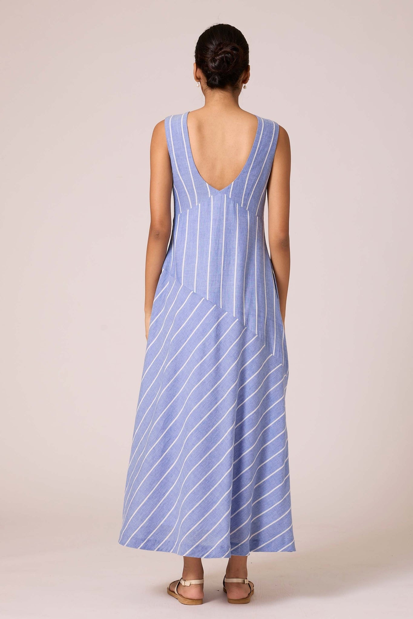 Striped maxi dress in handwoven cotton. Features an asymmetrical drop waistline. Side zipper allows for easy wear. Lining ensures comfort. Inseam pocket.