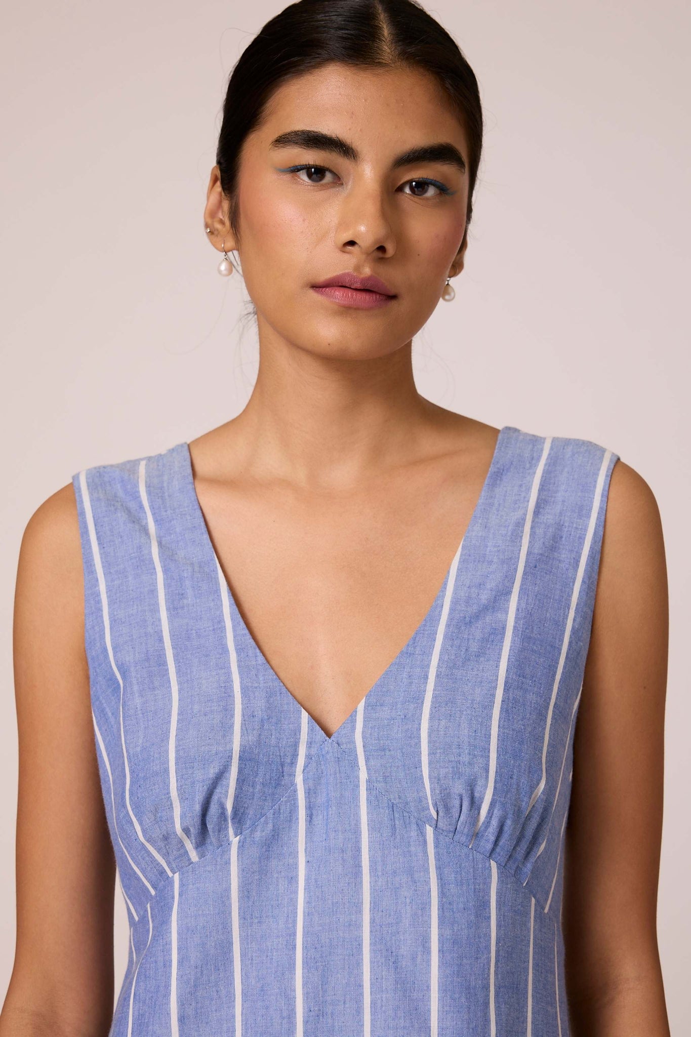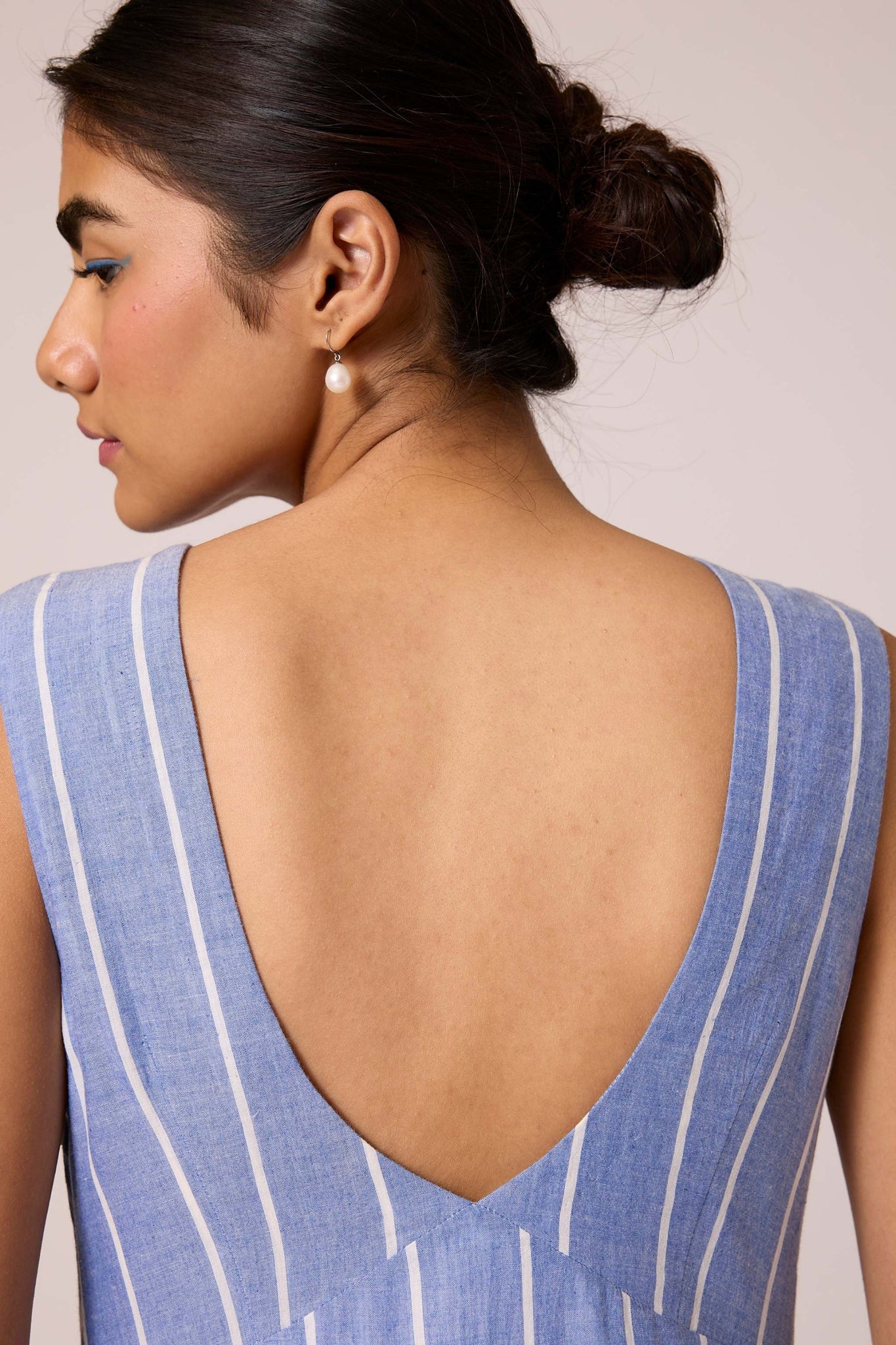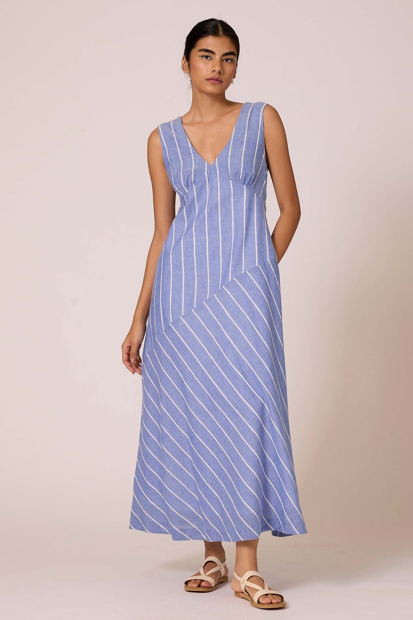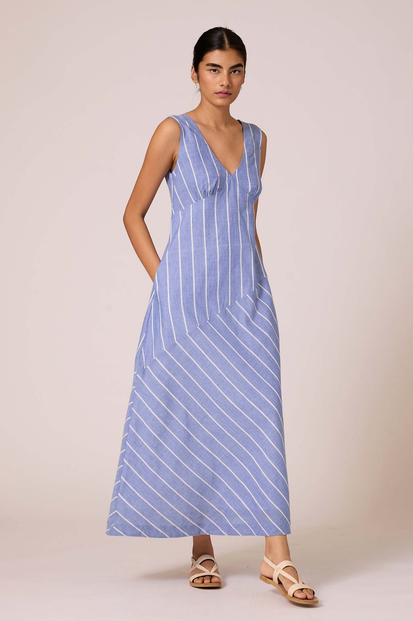Striped maxi dress in handwoven cotton. Features an asymmetrical drop waistline. Side zipper allows for easy wear. Lining ensures comfort. Inseam pocket.