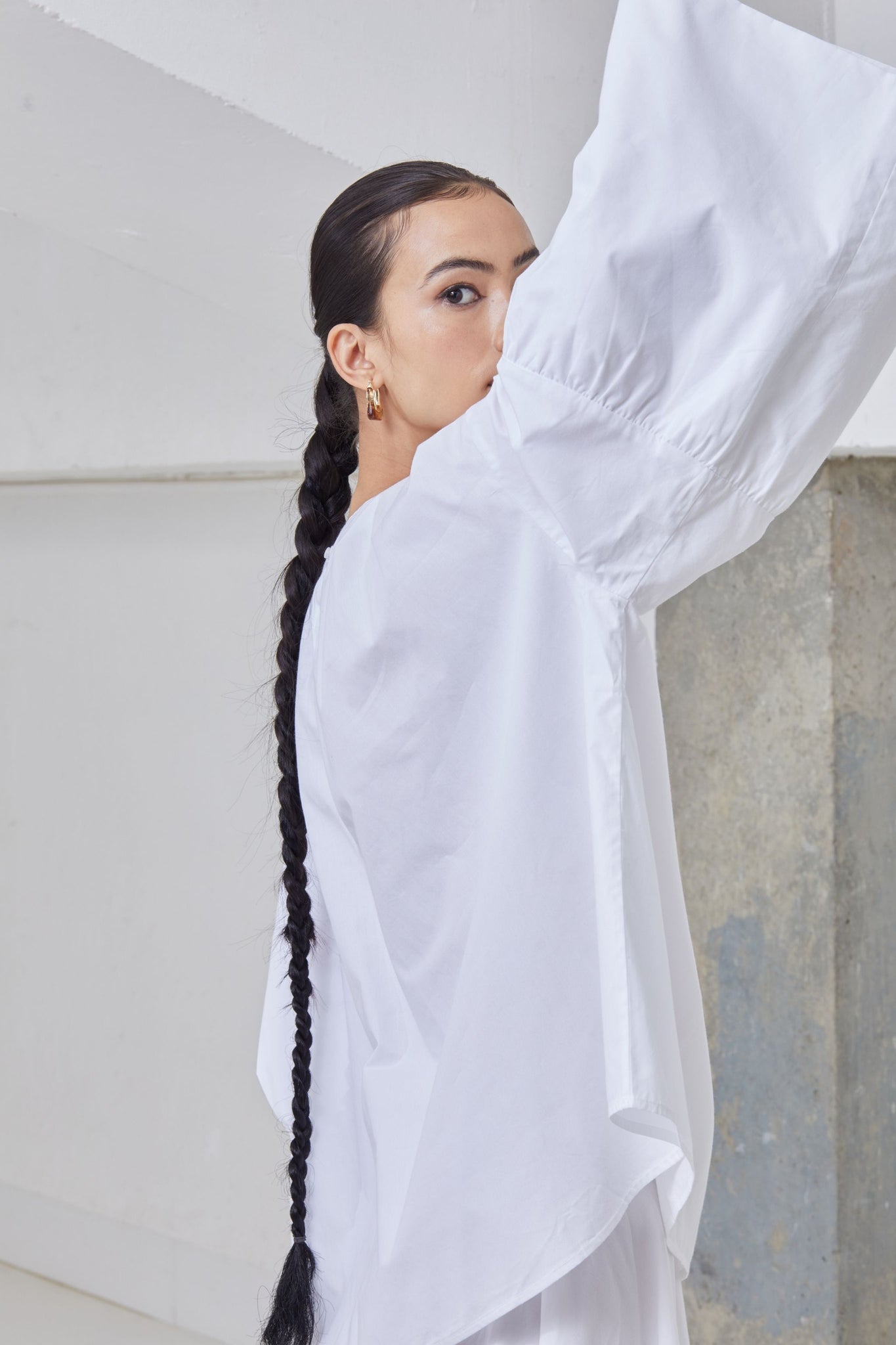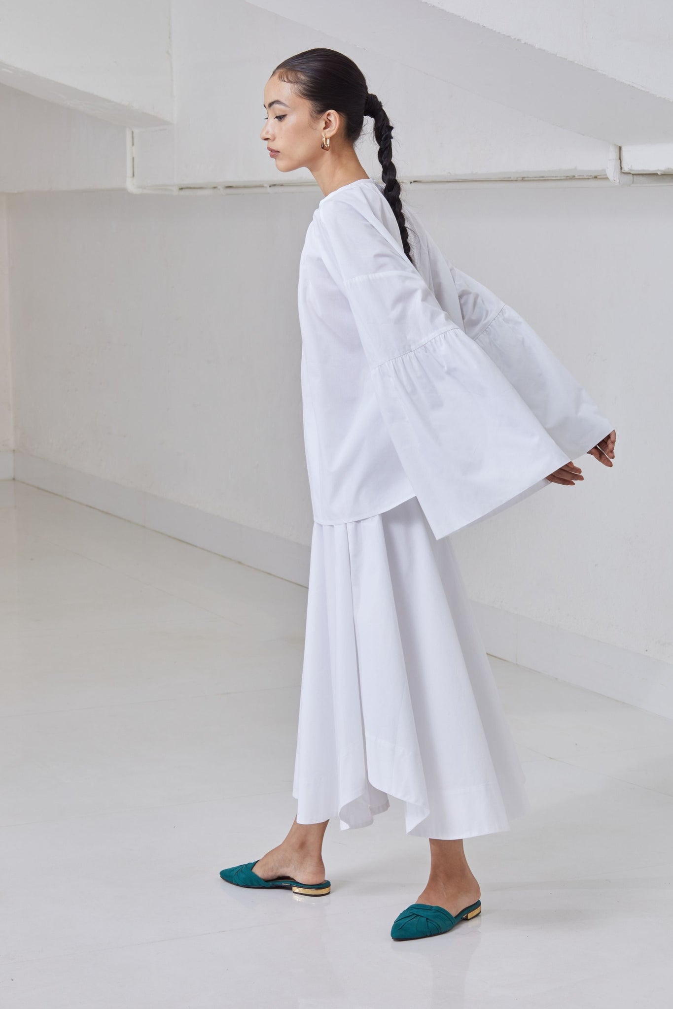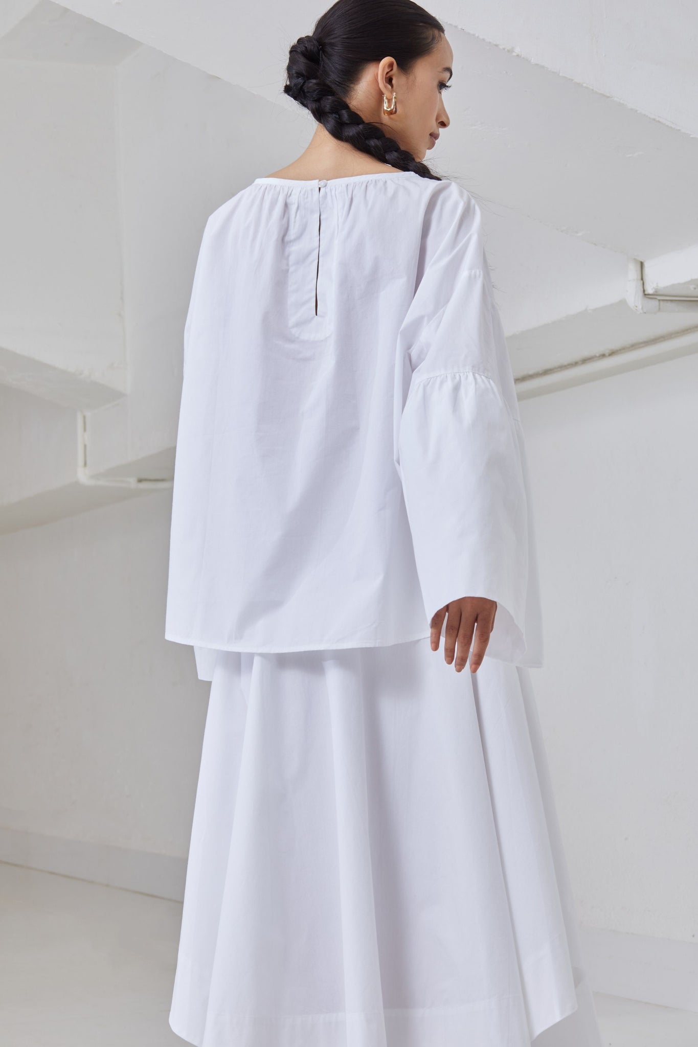 A-line top in crisp organic cotton. Gentle gathers at the neck. Drop shoulder with flare sleeve. Rouleau button fastening at the back.