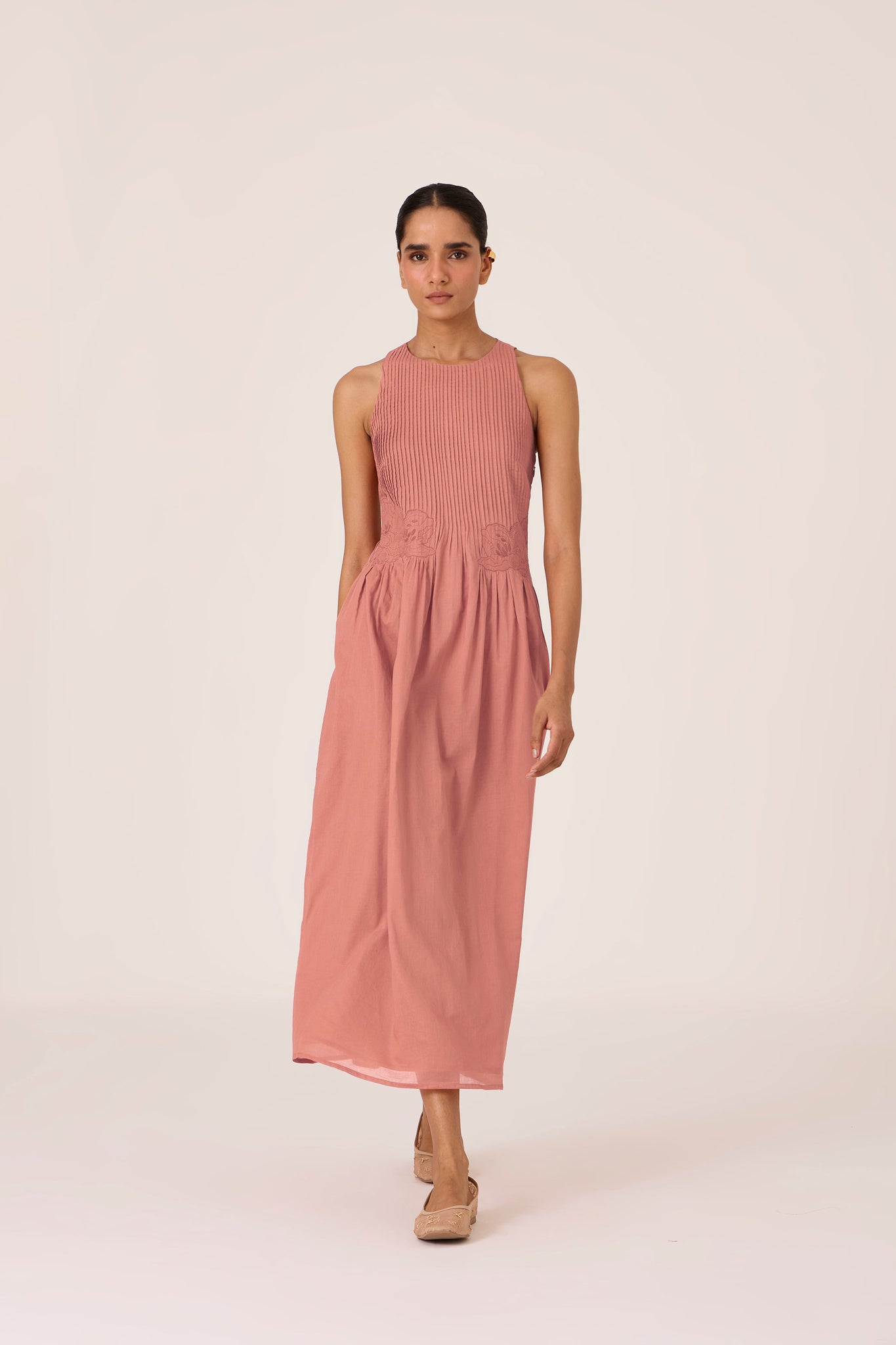 Gathered waist sleeveless dress with fine pintuck bodice. Waist gathers for gentle movement. Single rouleau button at the back.  Side zip for ease.