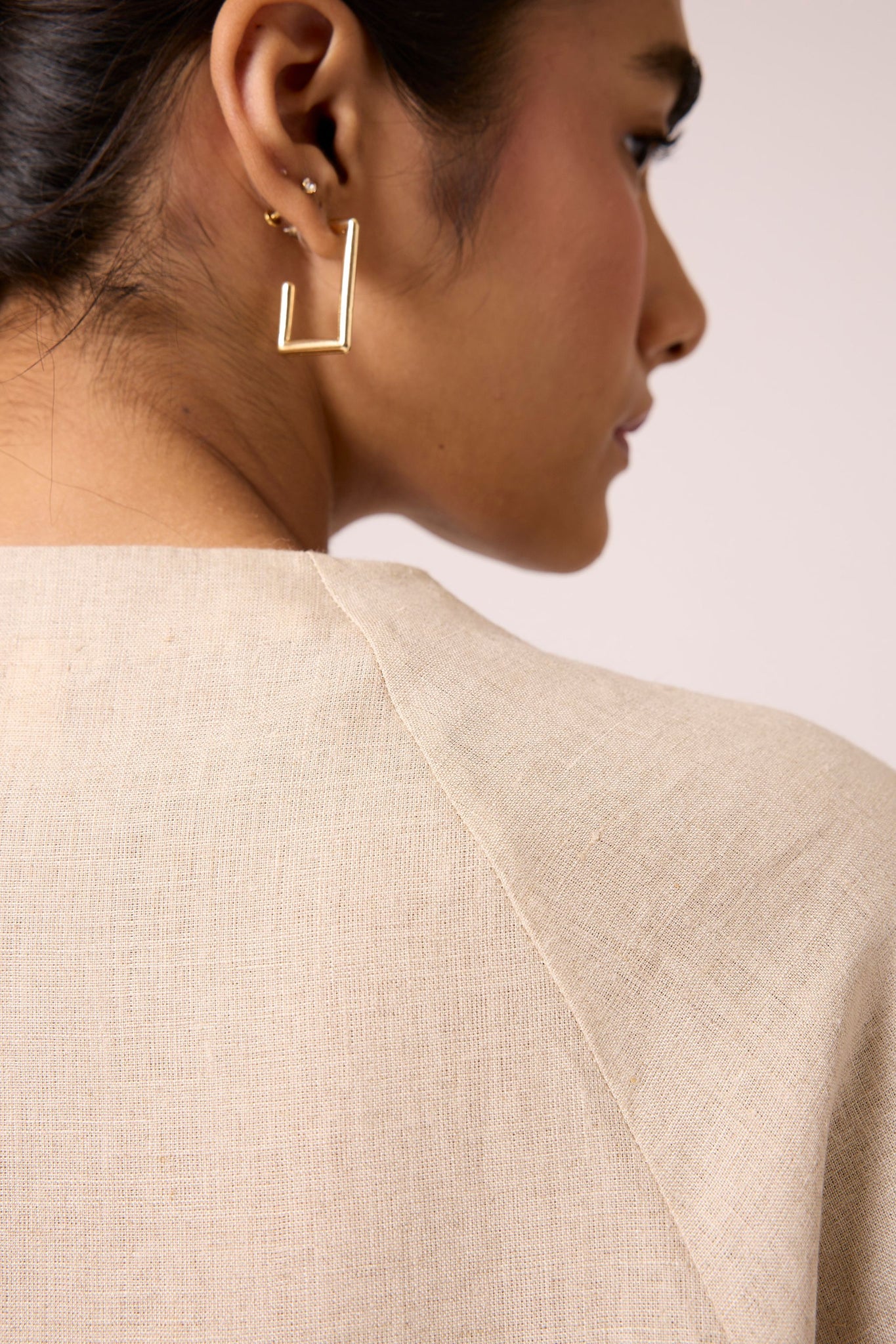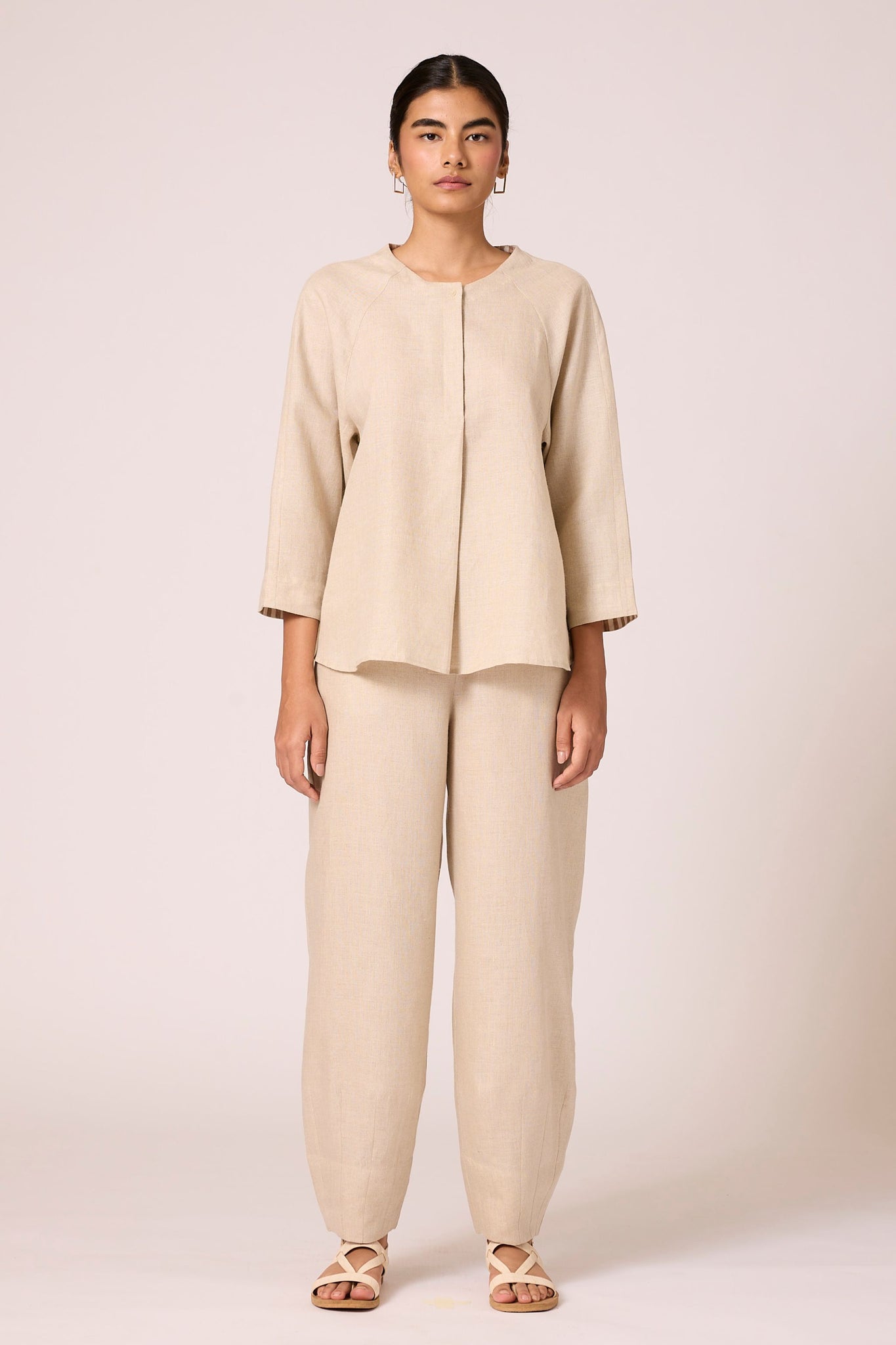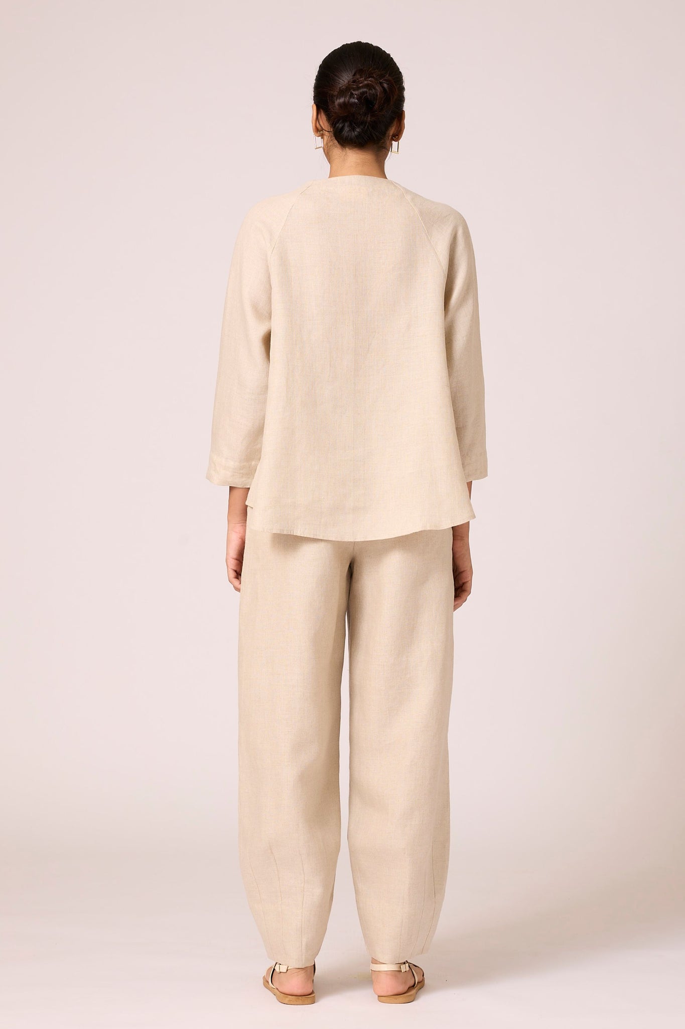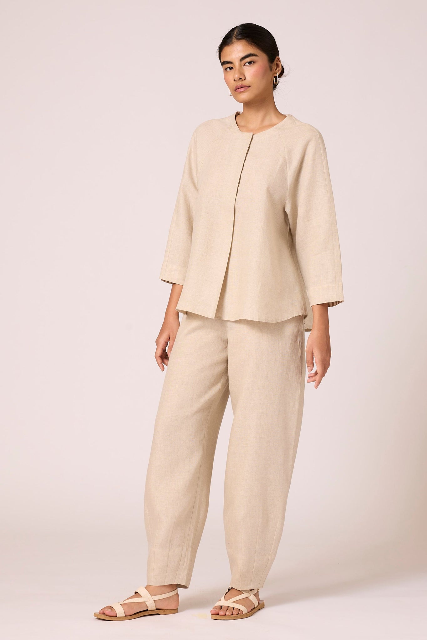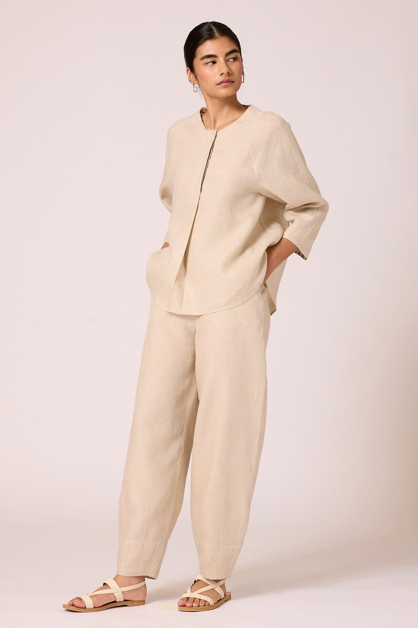 Classic linen pants with a softly sculpted hem. Flat front sits at the narrowest part of the waist. Finished with neat slash pockets and a side zip.
