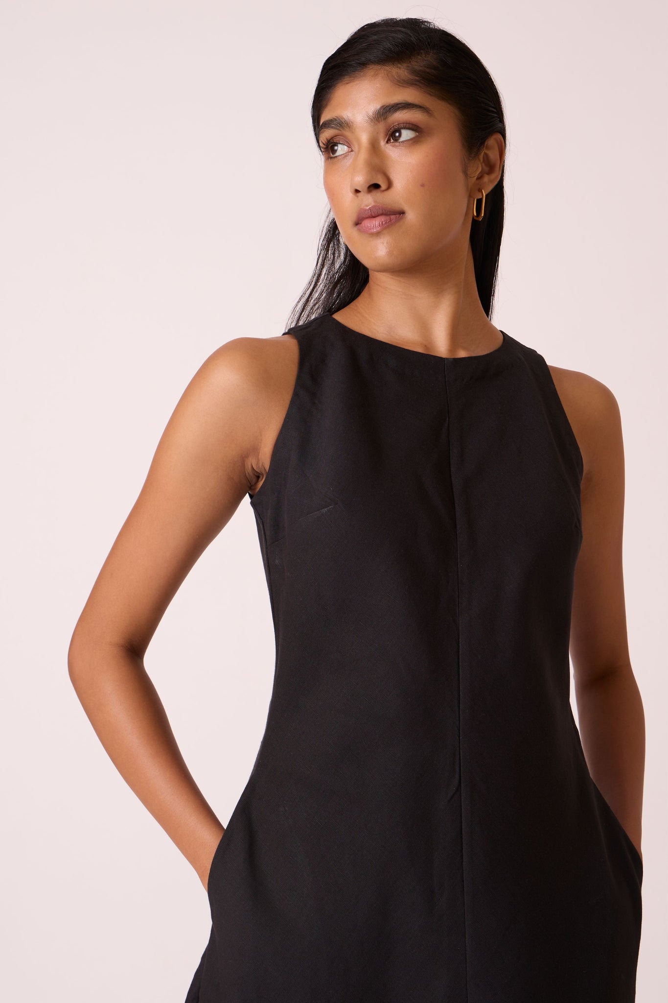 A linen cotton midi dress. Modish high neckline and cutaway sleeves. Back zip fastening. Inseam pockets. Fully lined.
