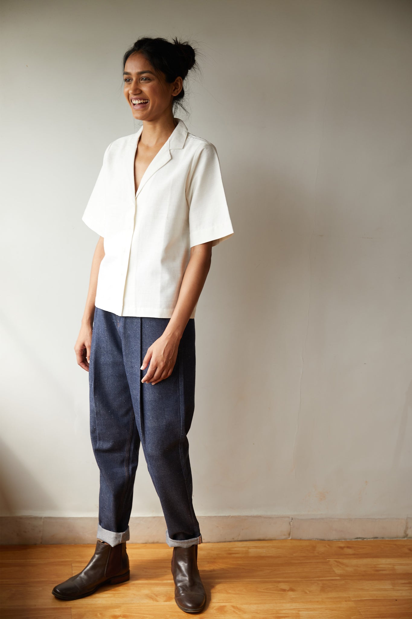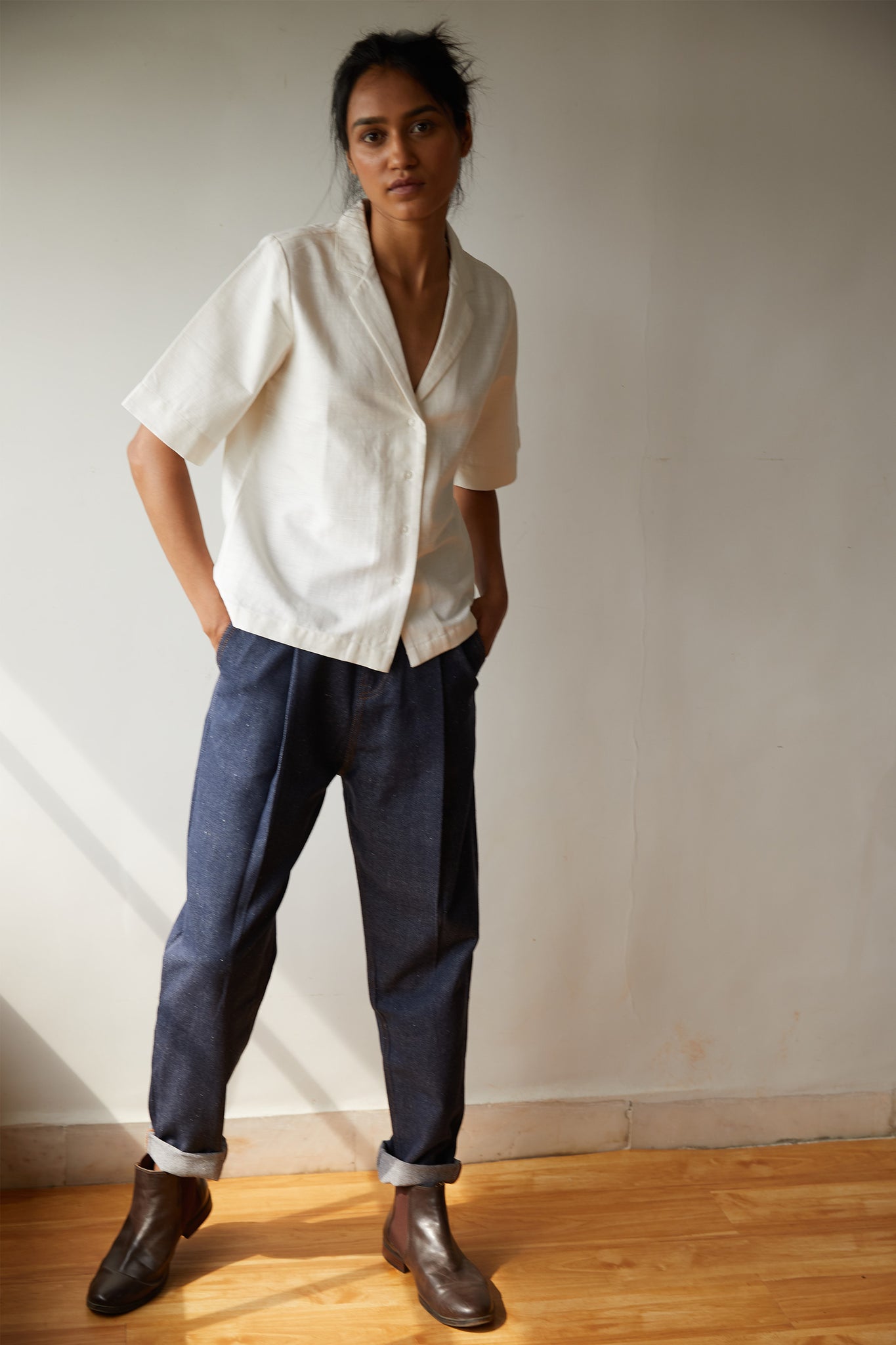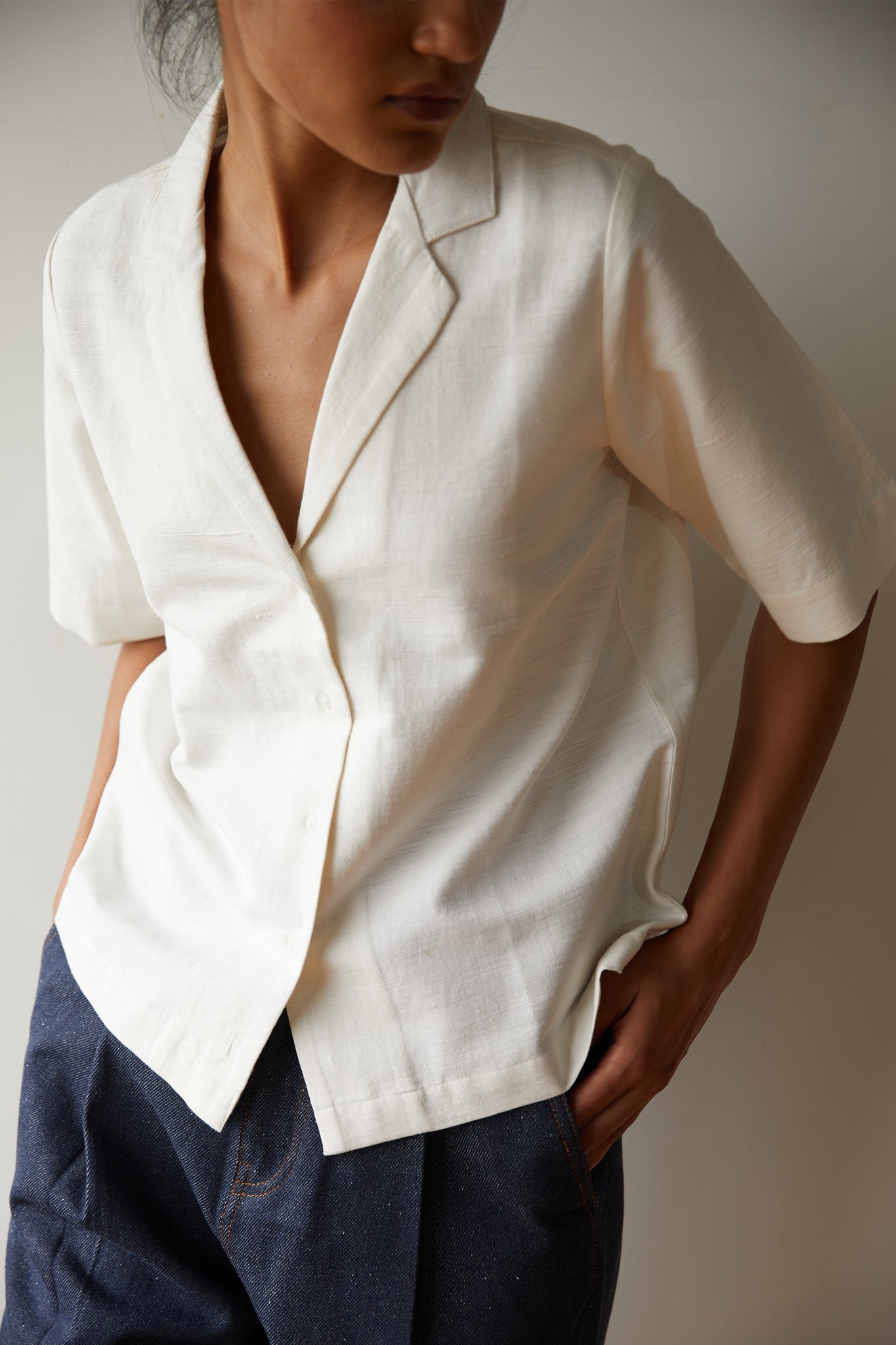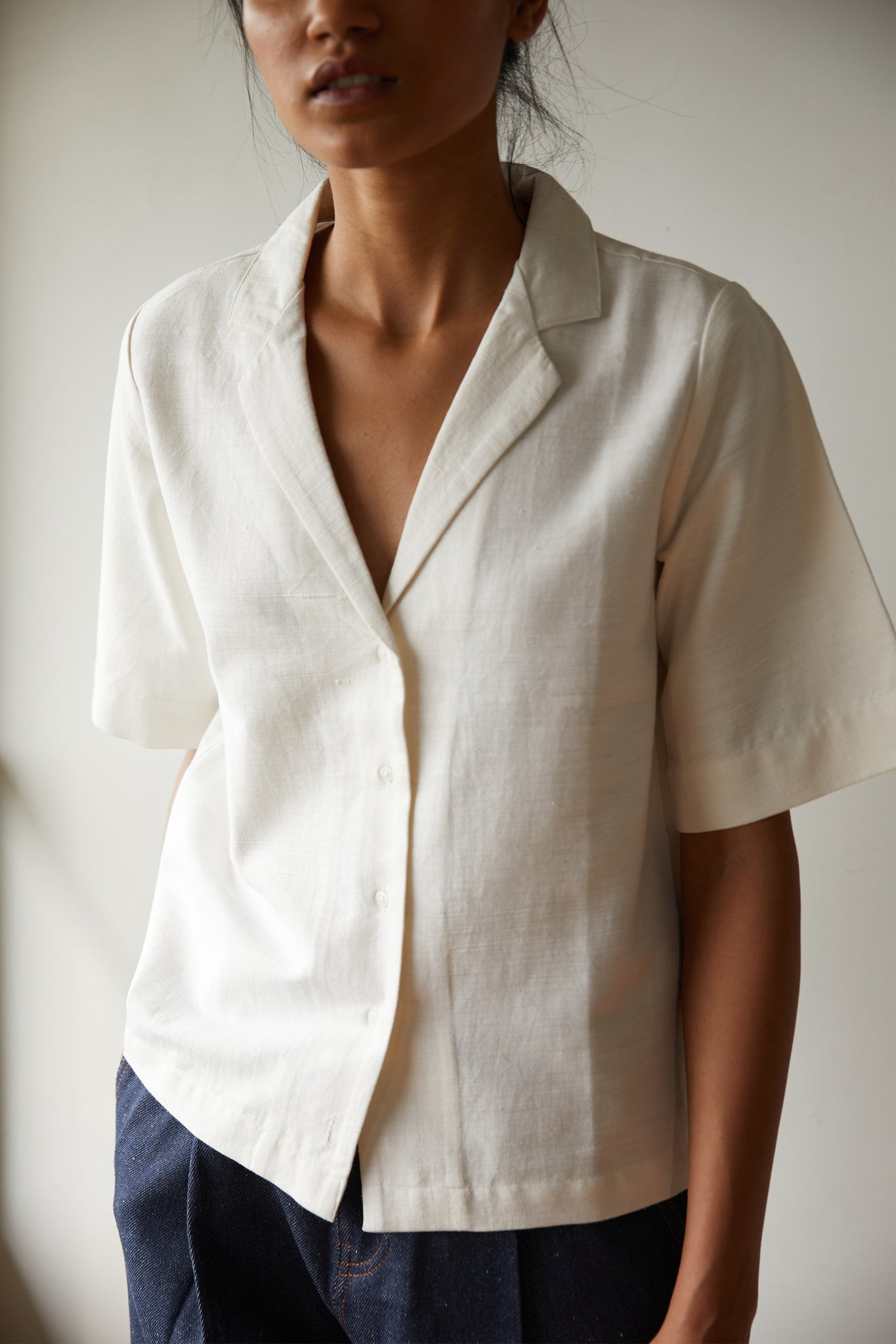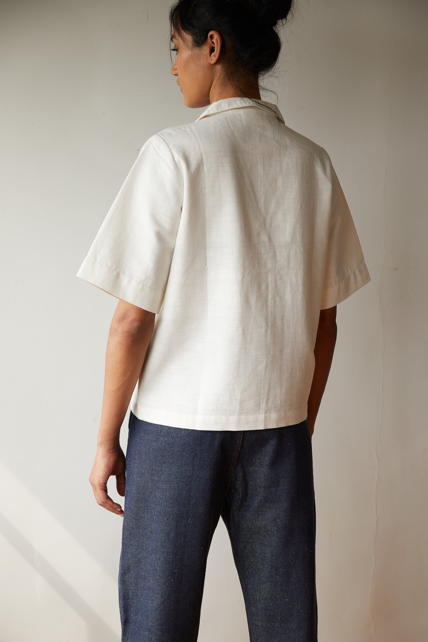 Notch collar shirt made in densely woven Khadi. Short sleeve. Back yoke. Modern and mindful.