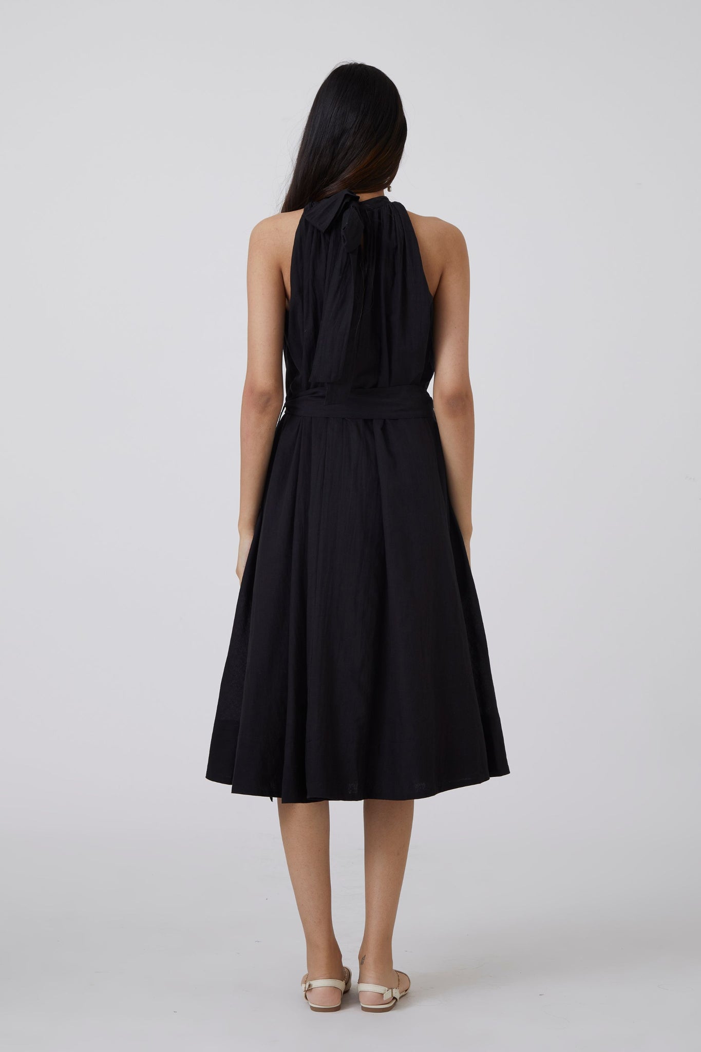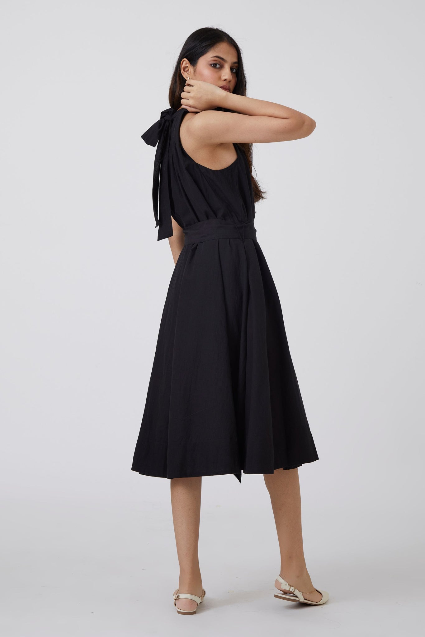 A delicate midi dress for urban gypsies. Shoulder revealing sleeves that end into a bow tie behind. Soft gathers at the neck. In-seam pockets. The dress comes with an optional fabric belt.