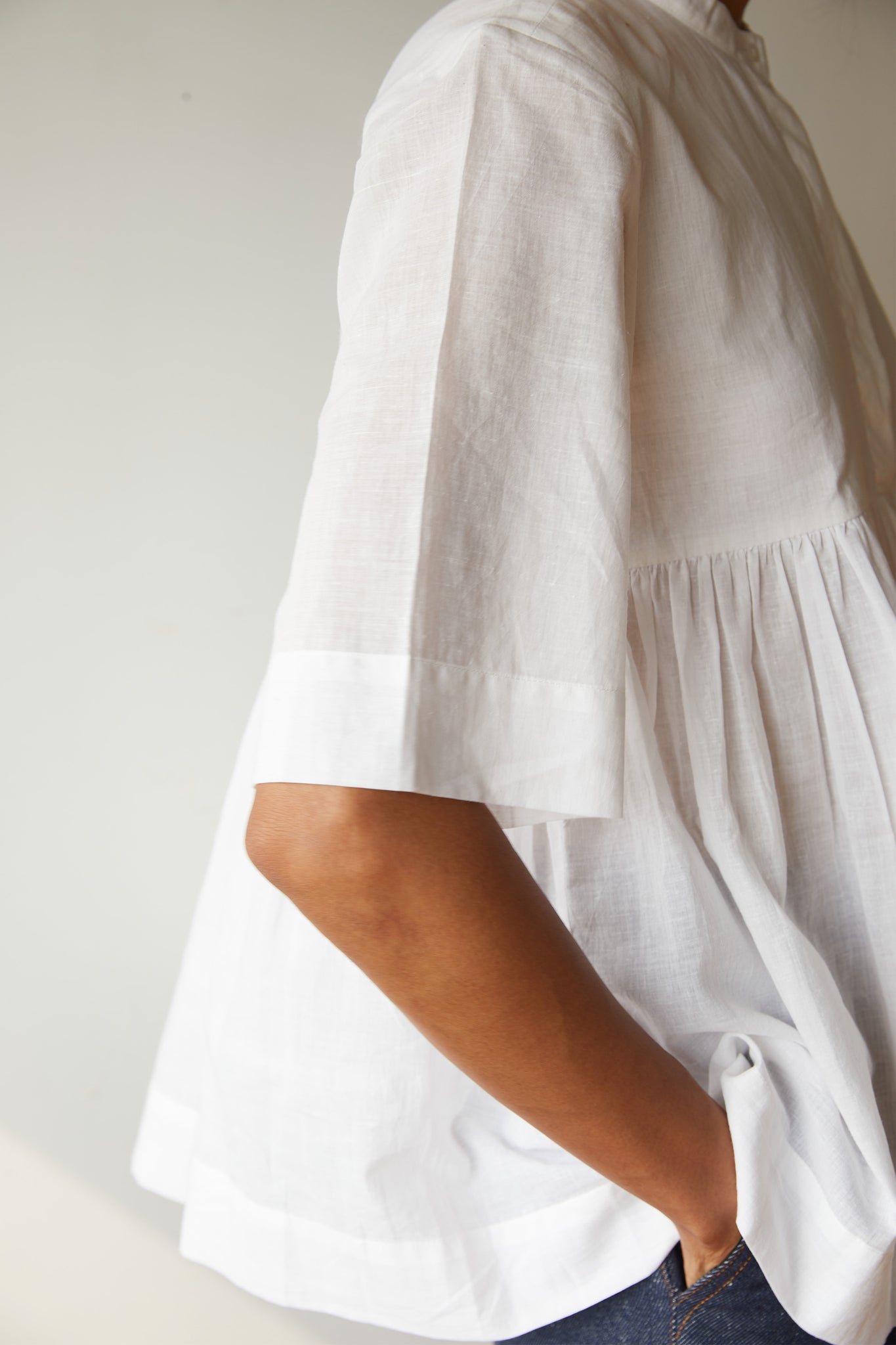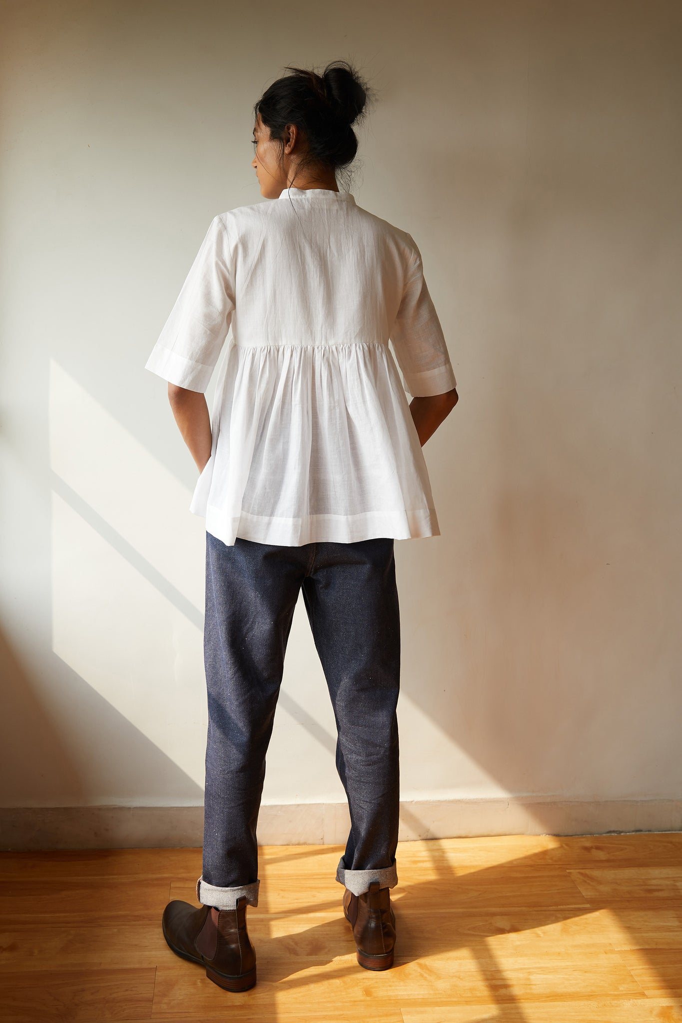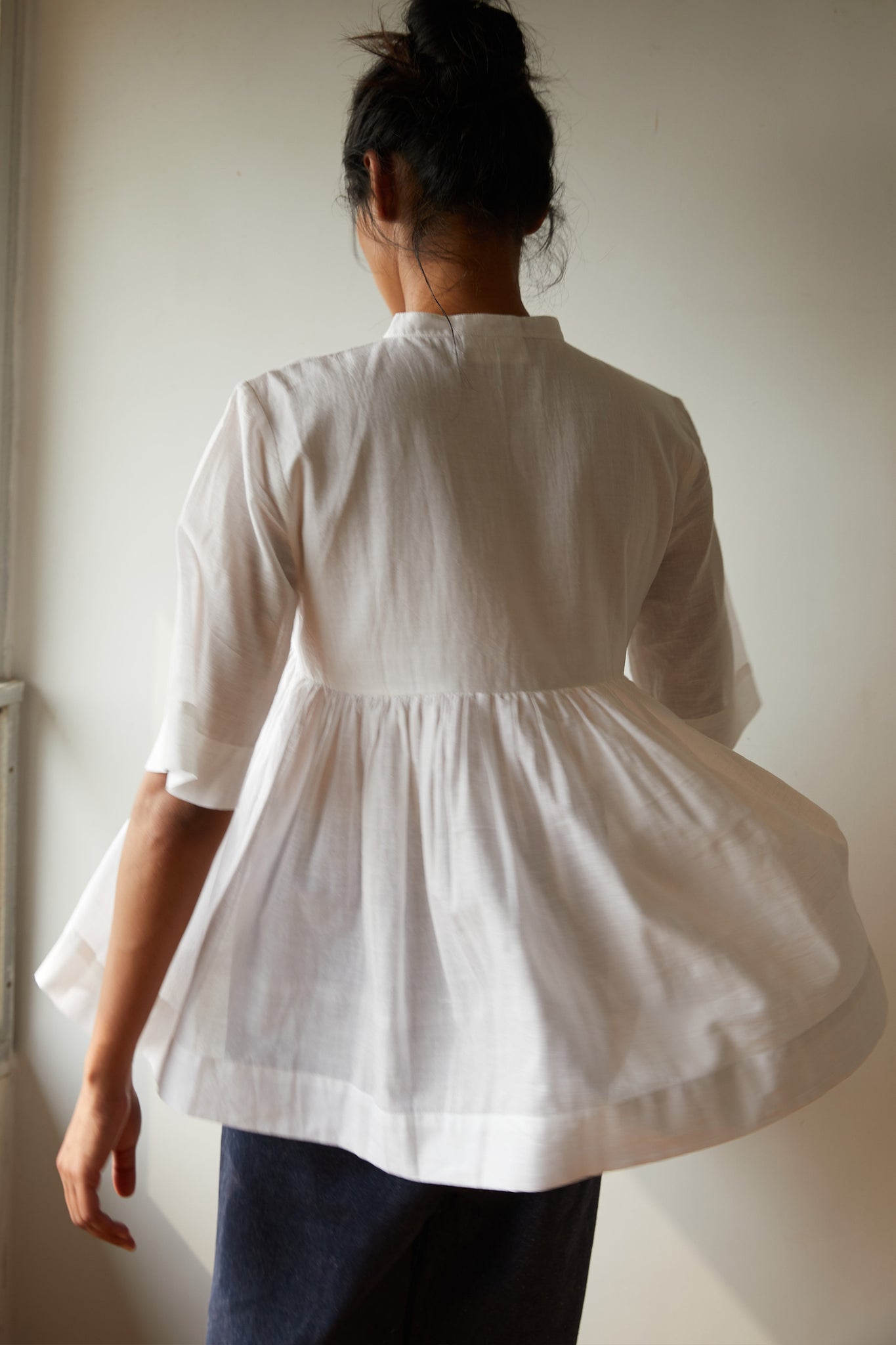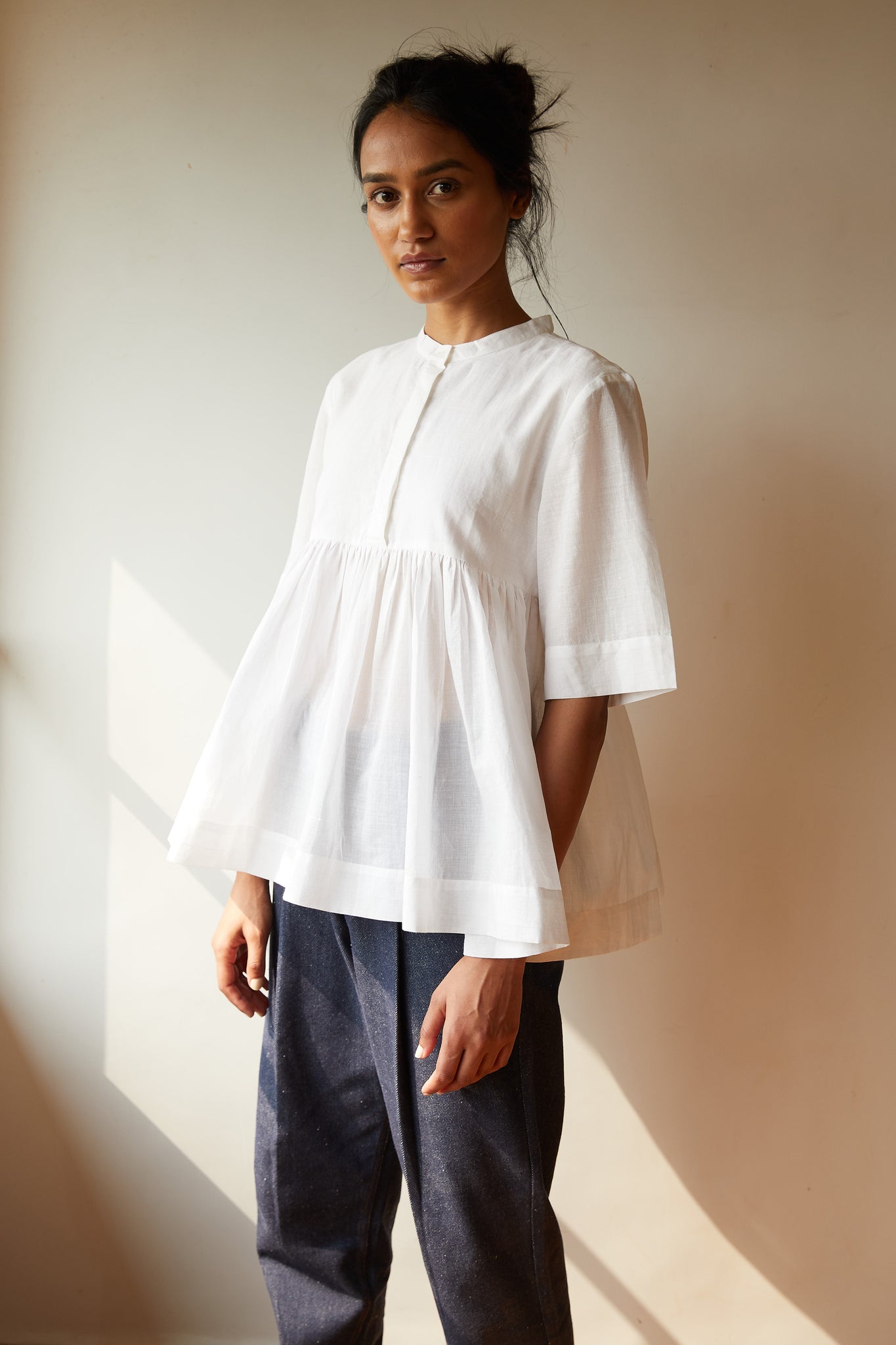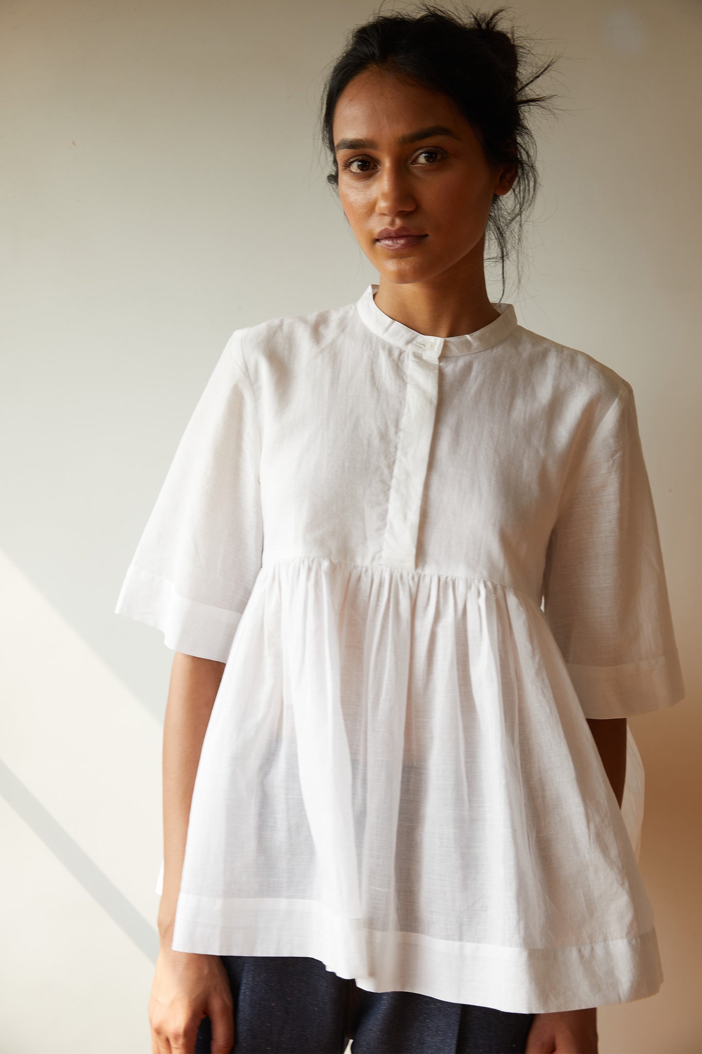 Playful top in pristine white khadi. Partial placket with a single button revealed at the neck. Gentle gathers at the yoke seam. Three quarter length sleeves.