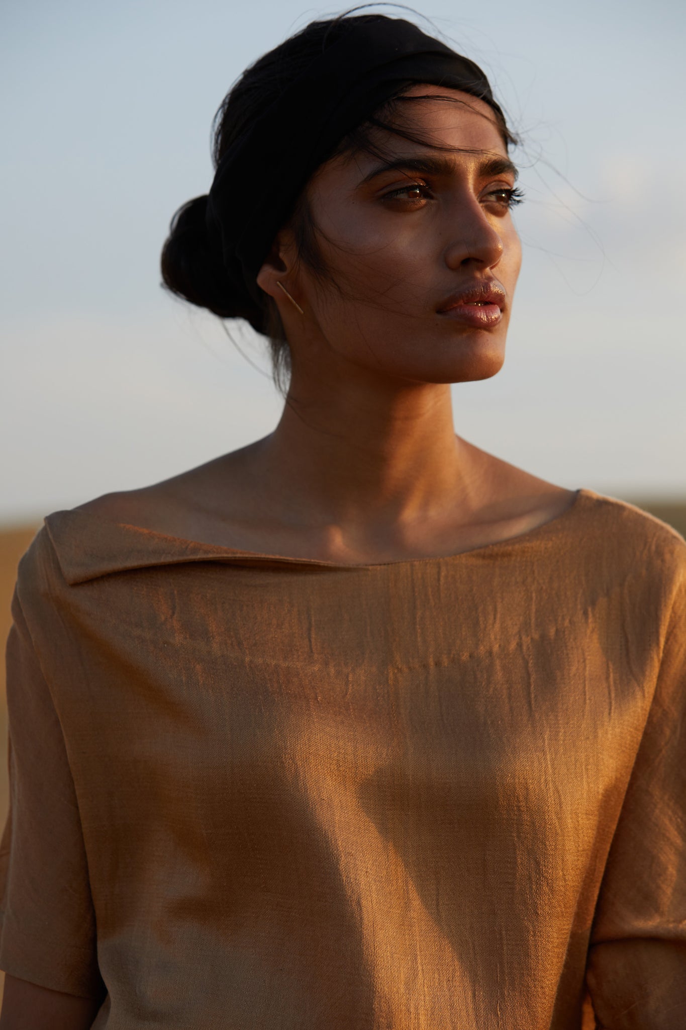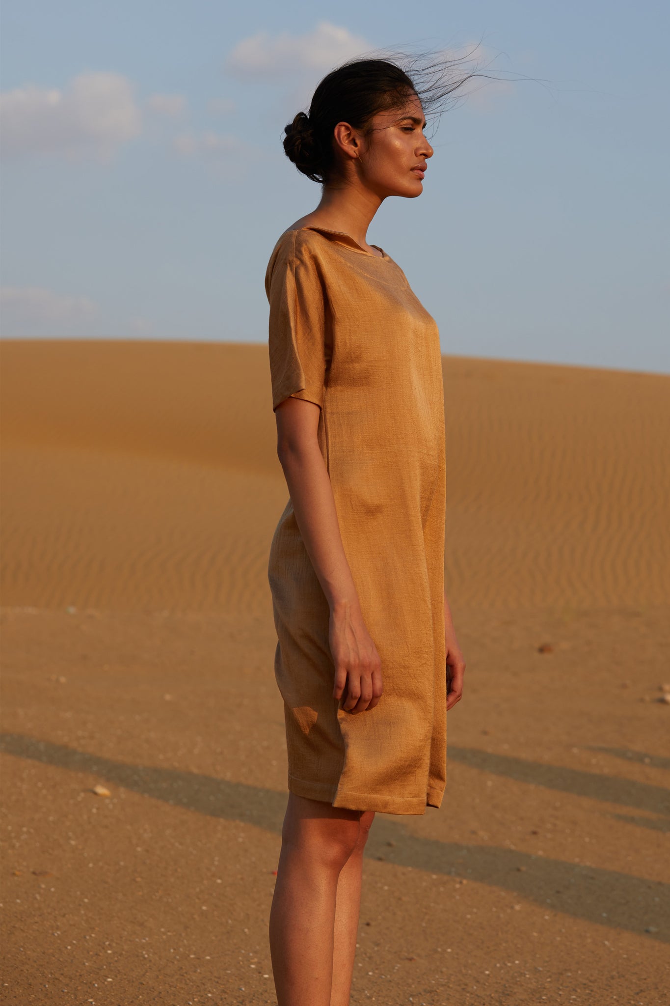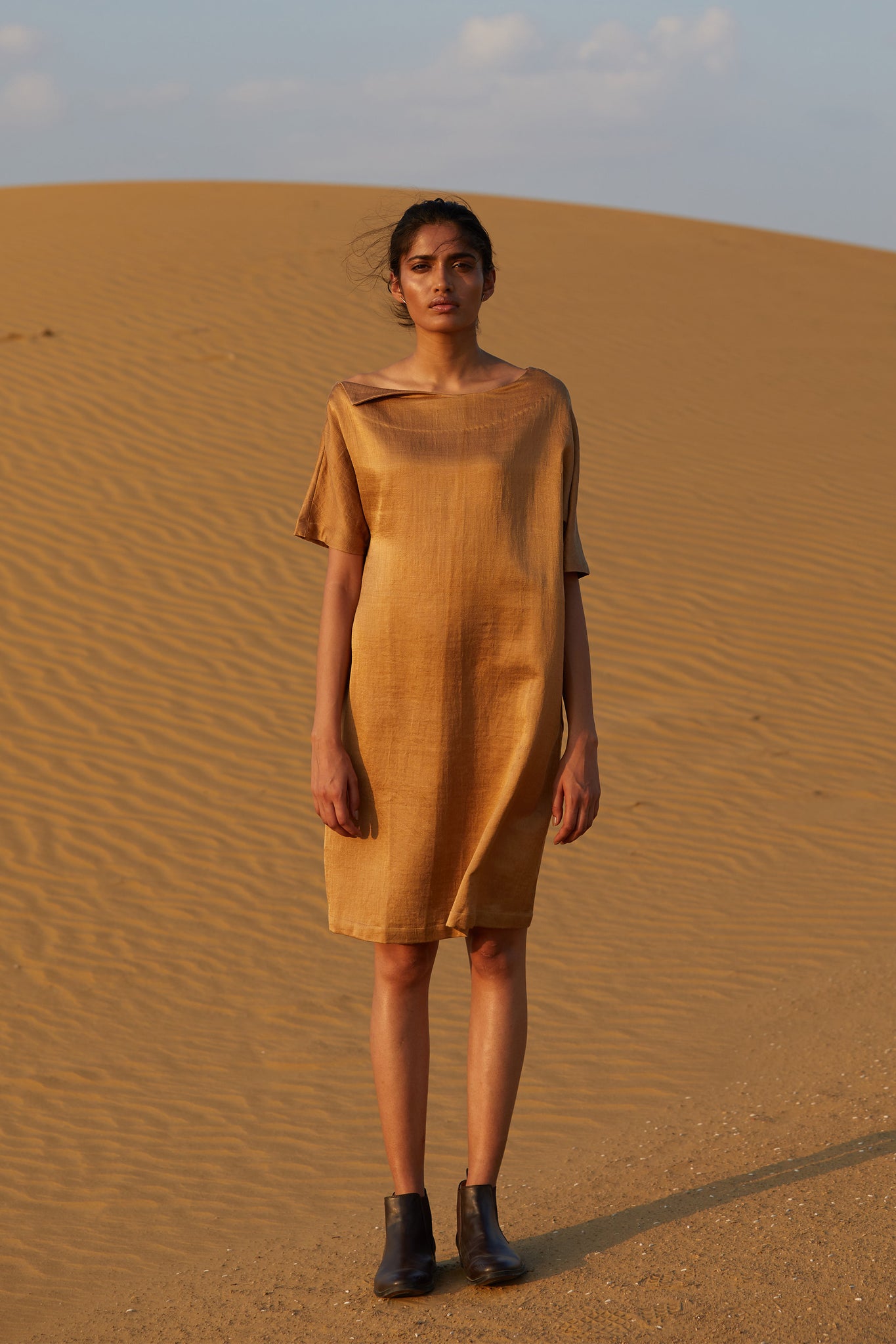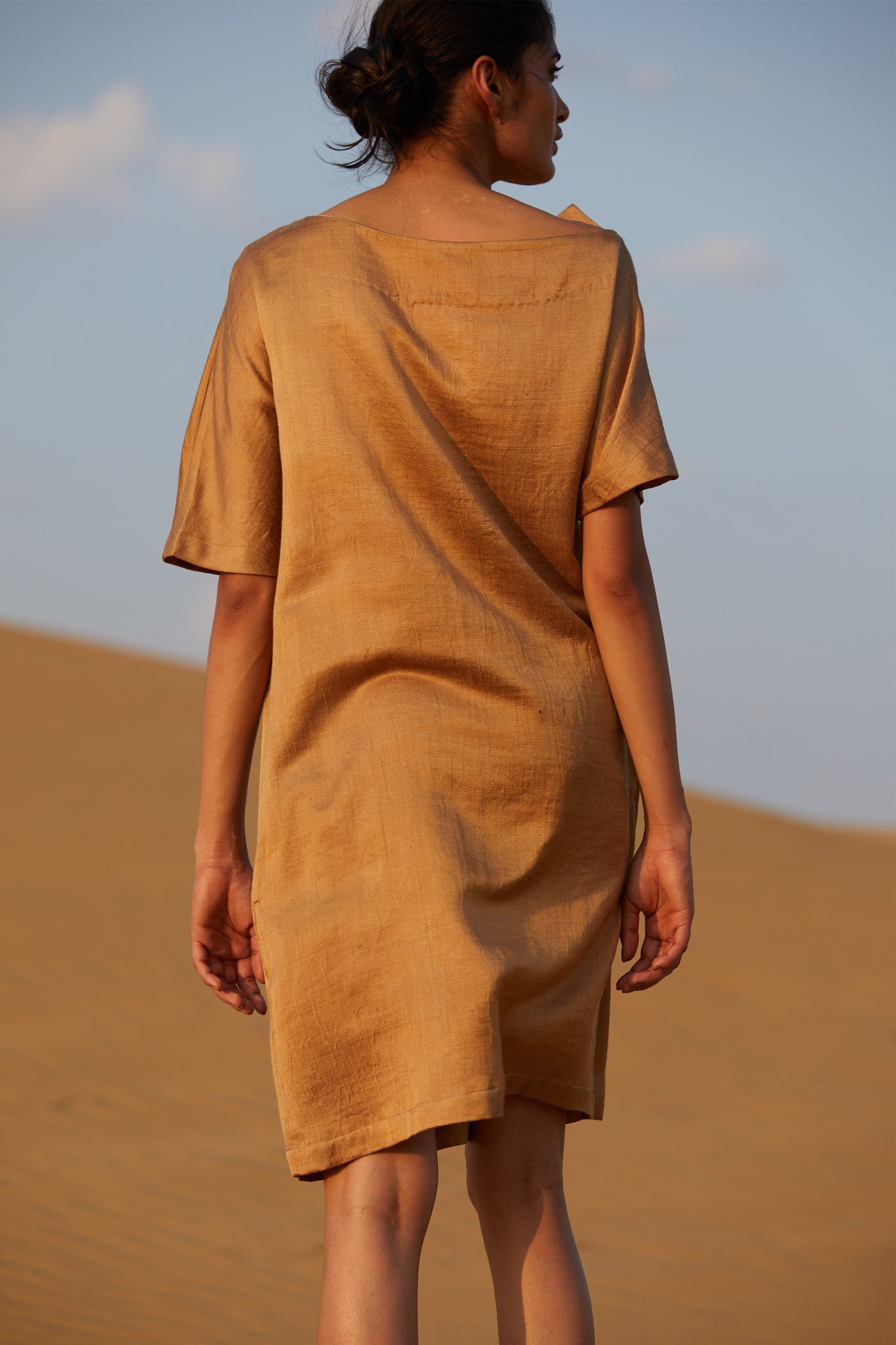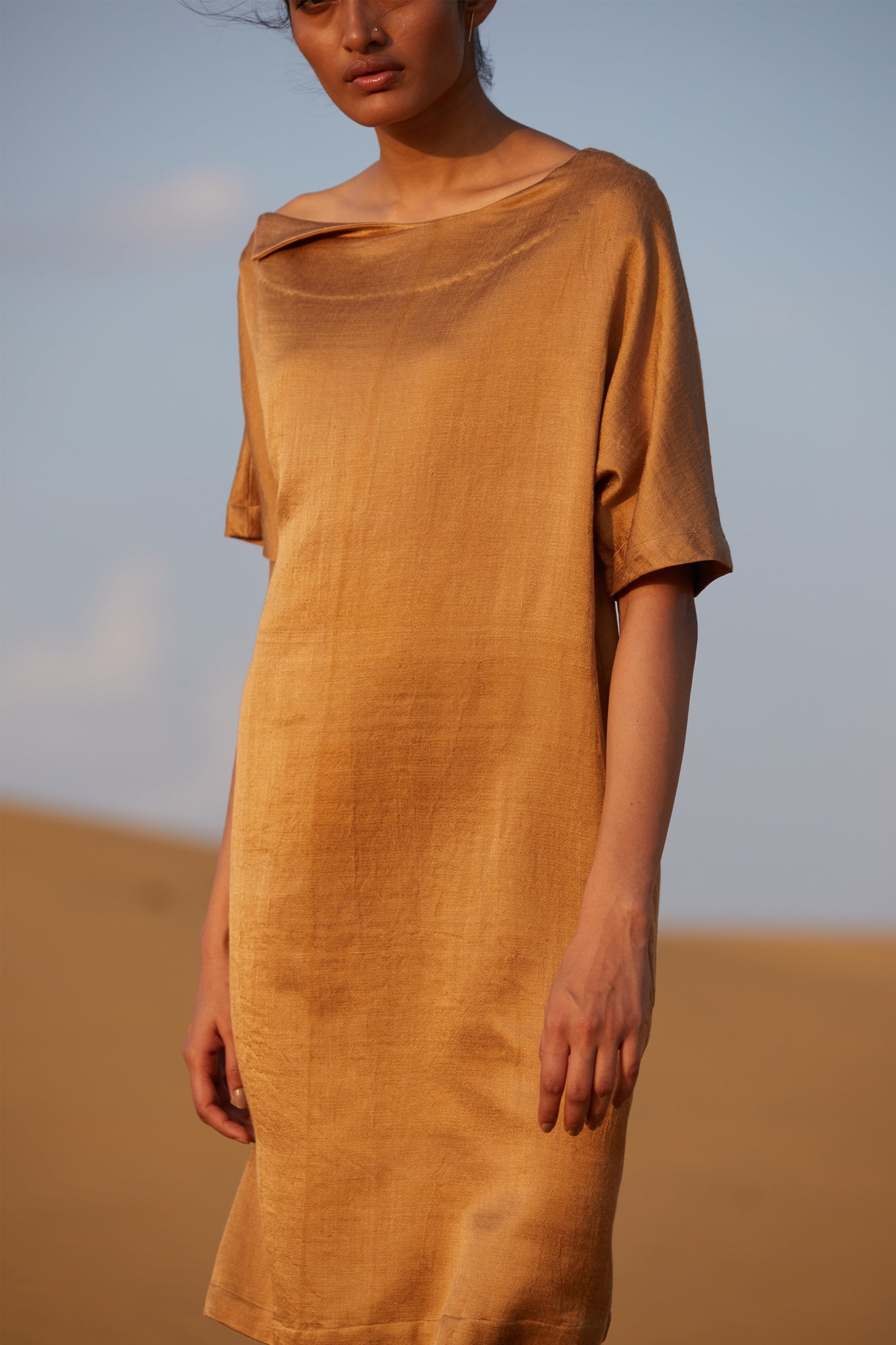 The essential festive shift dress in a luxe silk mashru fabric handwoven by a master craftsman. The unusual fold-over neckline detail keeps it simple and elegant. The shoulder seam and sleeve without an armscye drapes all shoulders with equal grace. The length works for all body shapes and combines ease with poise.