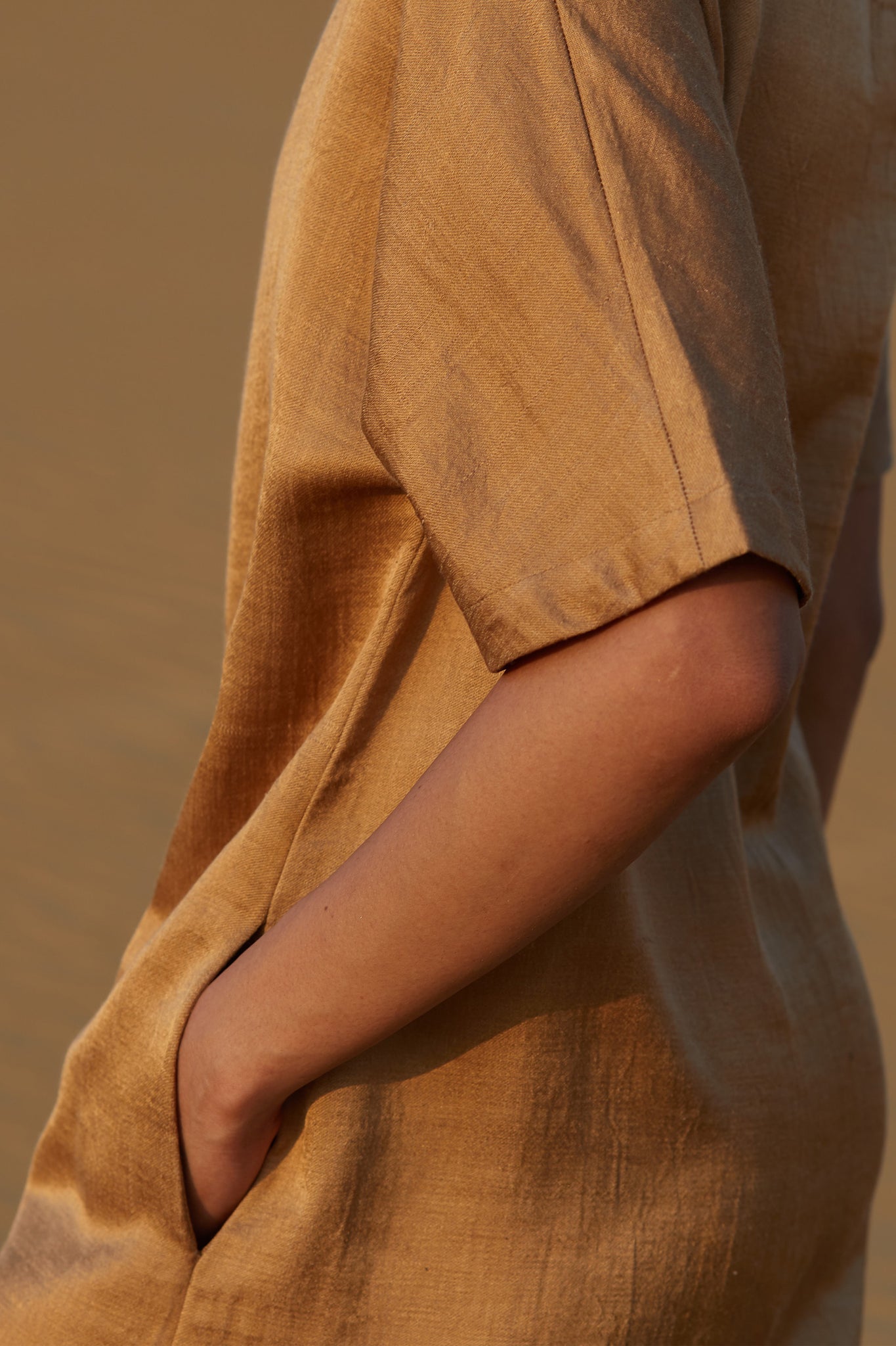 Mashru is a 500 year old weaving technique that uses pure silk and indigenious kala cotton yarn. The golden colour is achieved through a natural dyeing process using plant-sourced dyes. This intriguing process results in a shiny surface that resembles silk fabric from the outside, with the comfort of cotton on the inner side of the clothing.