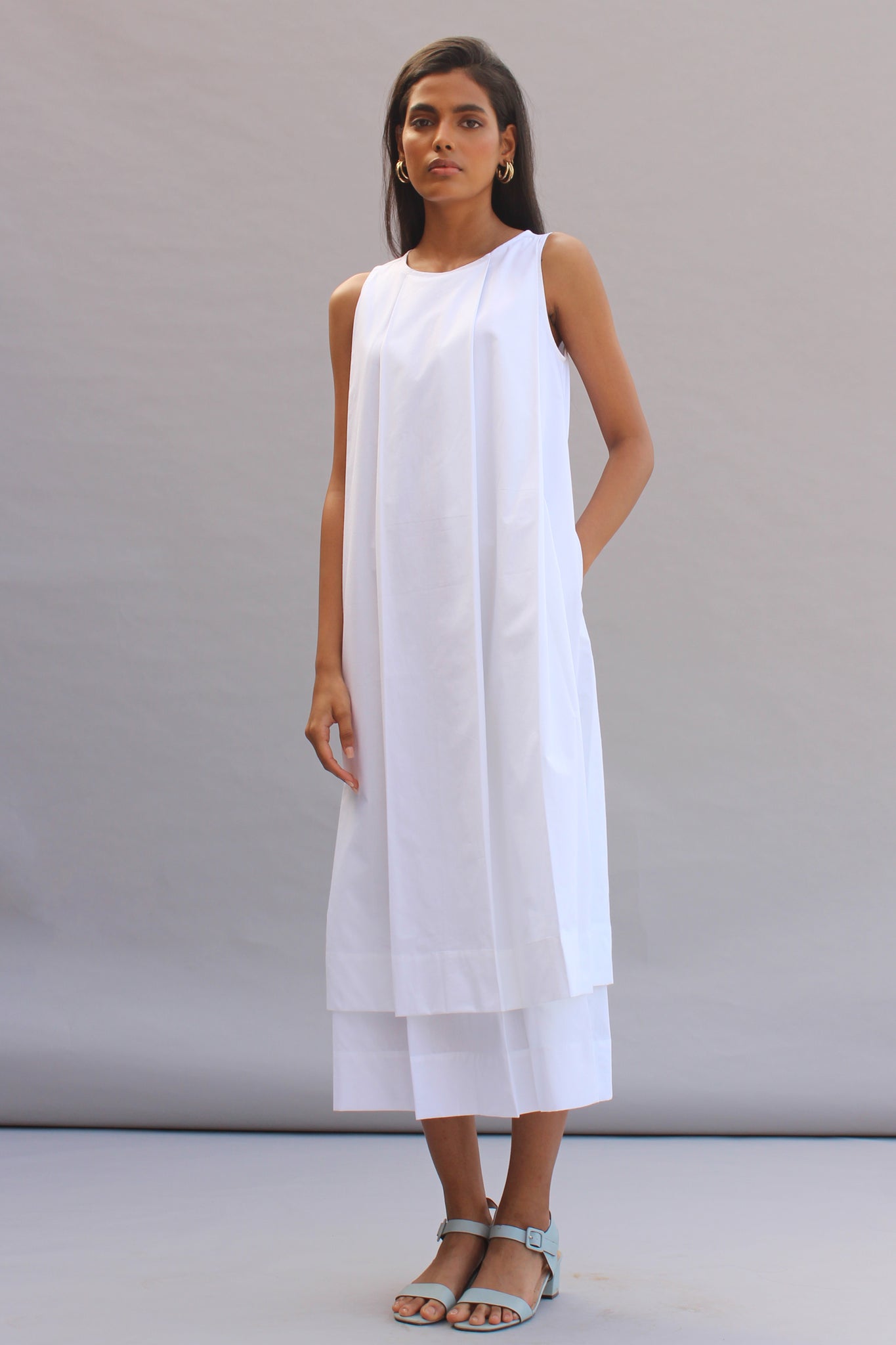 Double layered tunic dress in crisp white. Shoulder box pleats. Single button back opening. Two in-seam pockets. Makes a great travel companion.