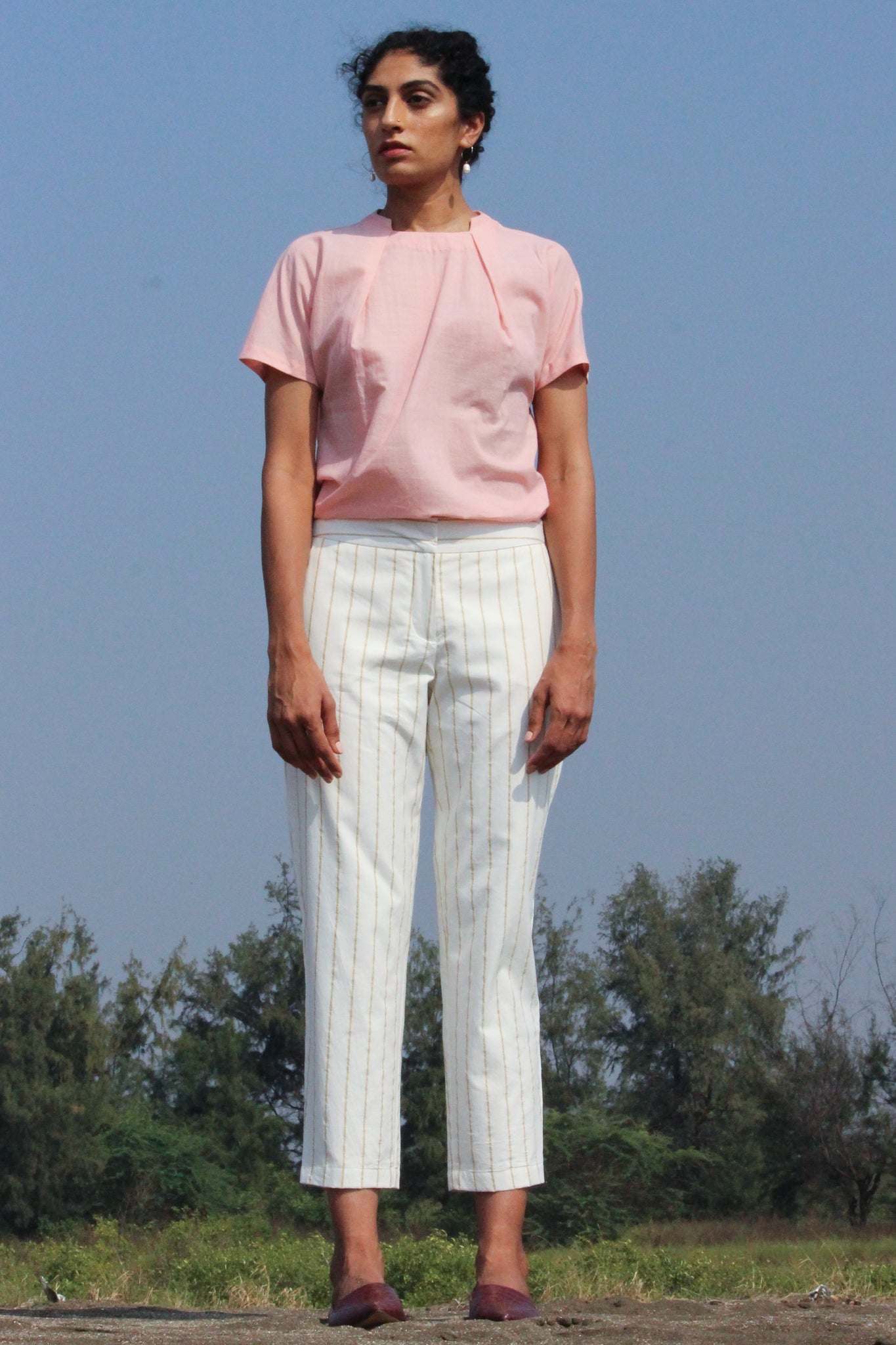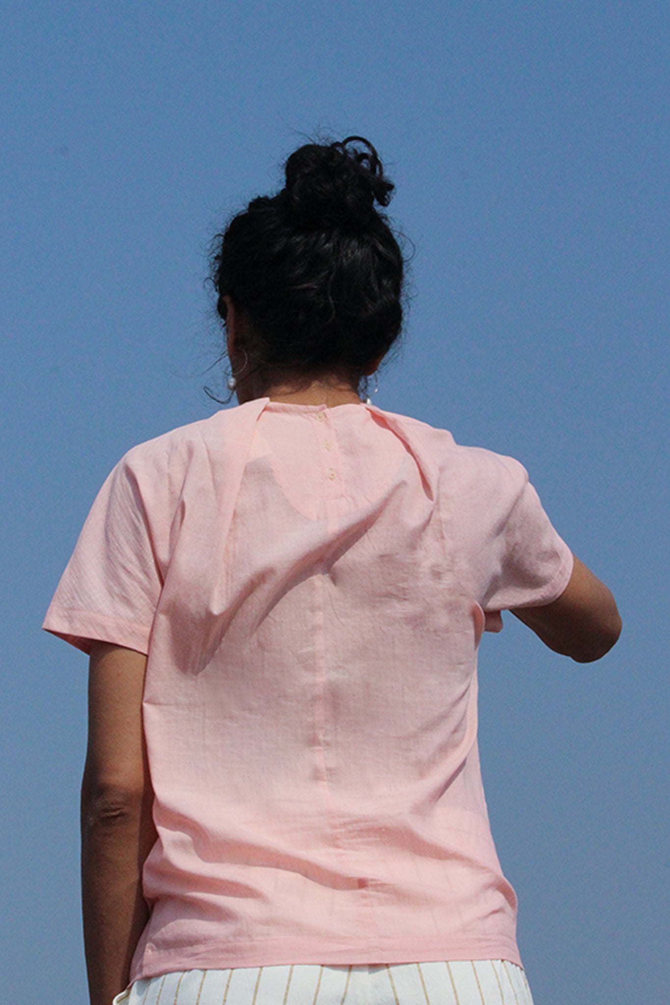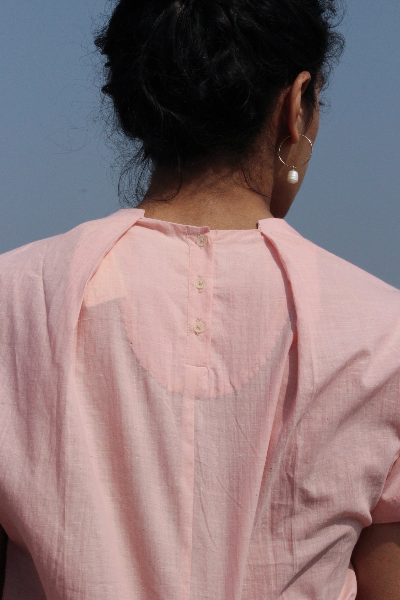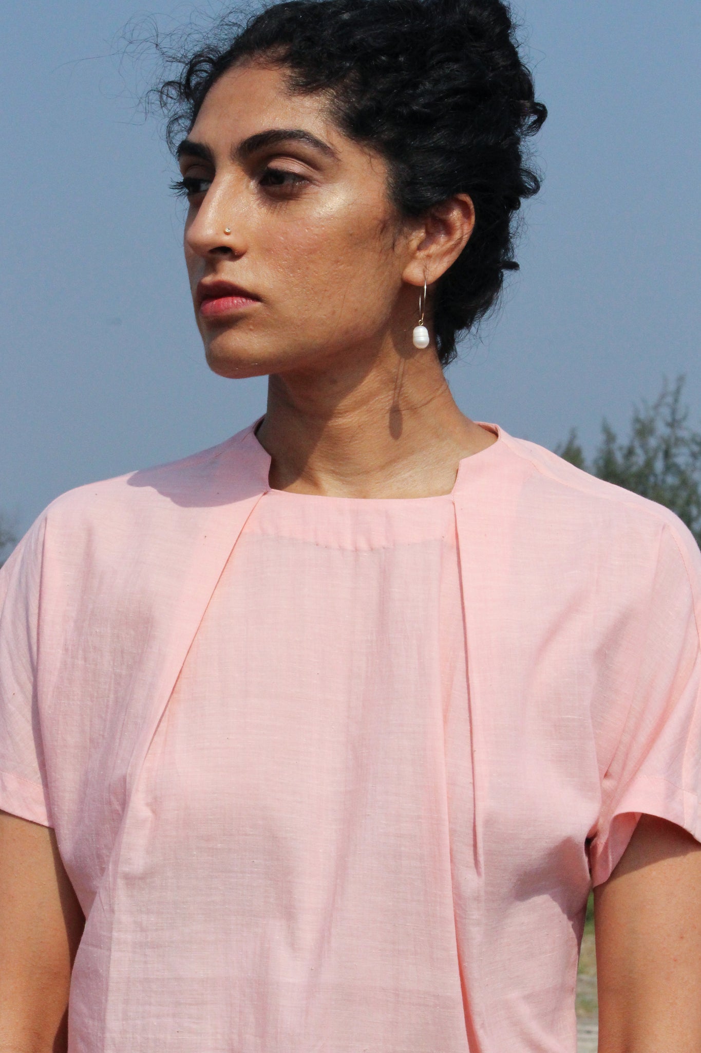 Easy fit drop shoulder with statement details. Crafted from the softest handwoven cotton. Diagonal pleats from shoulder in the front and back. Partial placket at the back with button reveal.