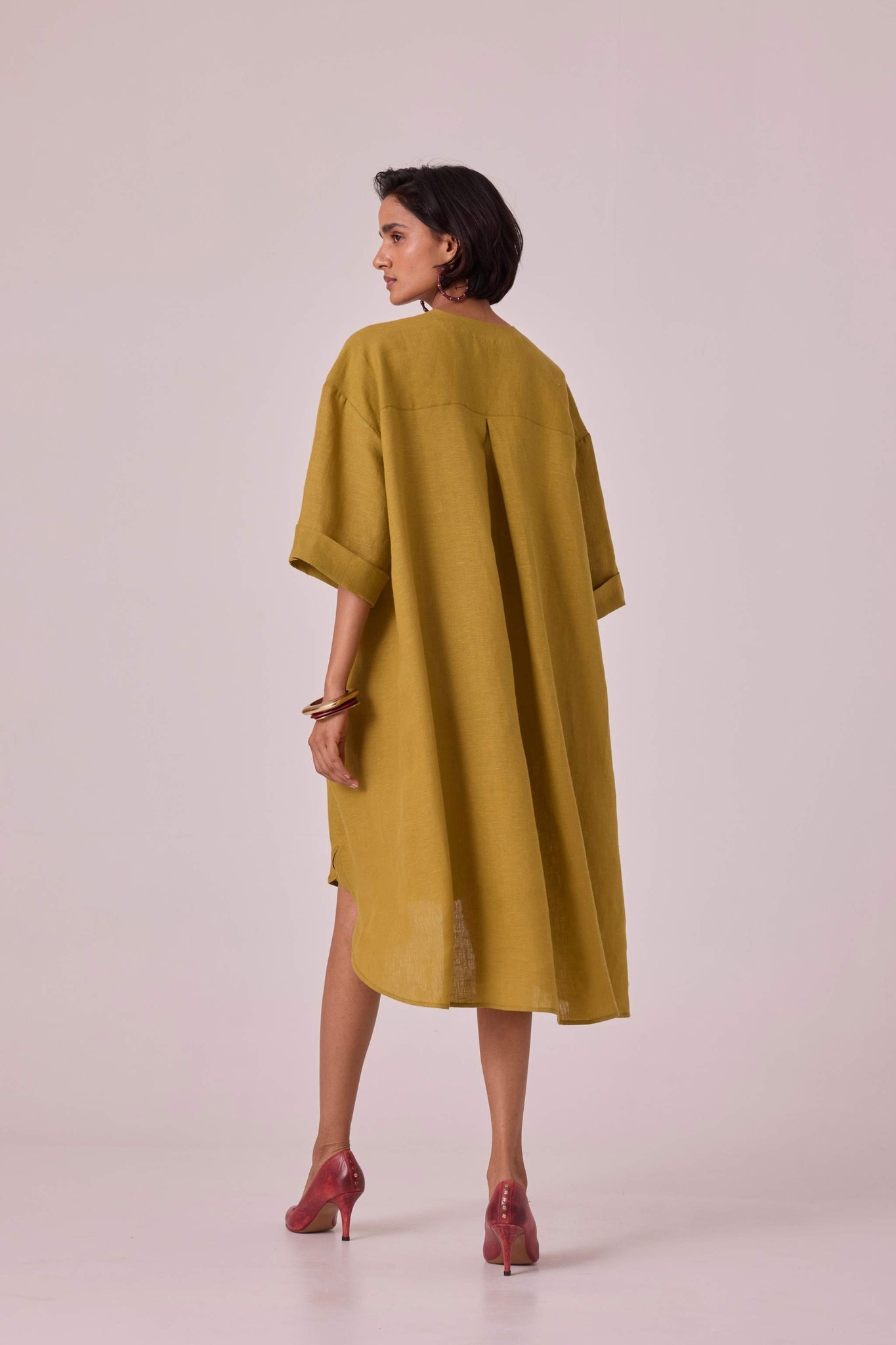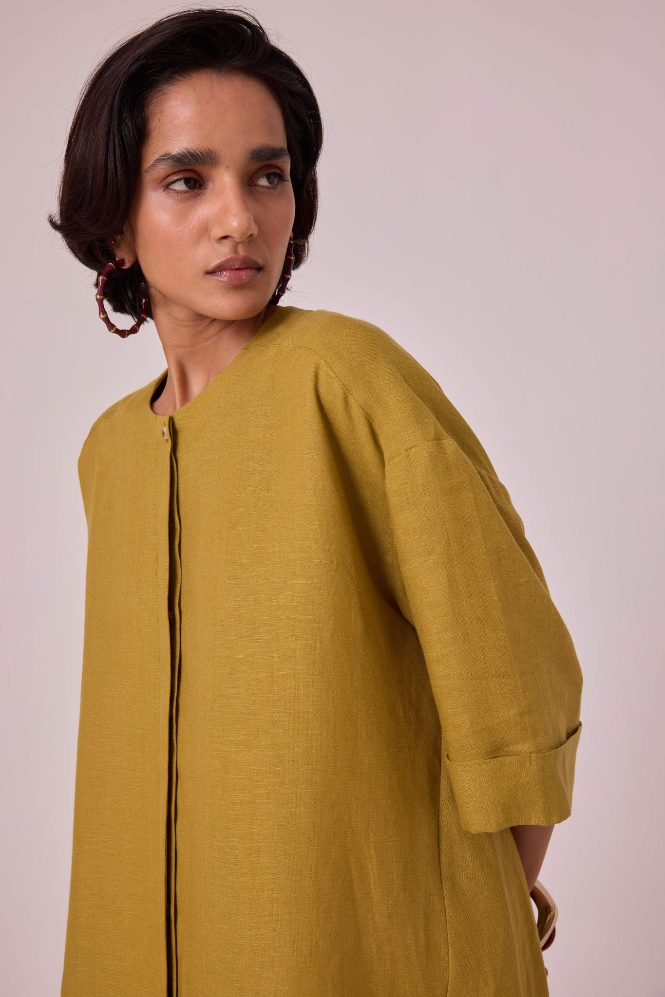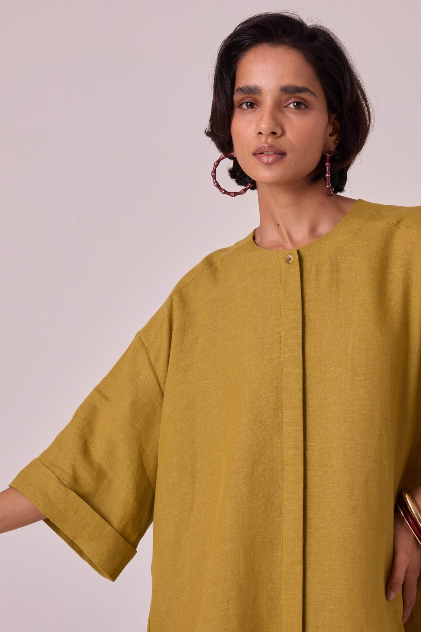 Pure linen tunic in a breezy silhouette. Boxy sleeves and a modish round neck. Curved hemline with a unique gusset detail. Neatly concealed placket with button-through front. The back yoke includes a single inverted pleat for added style. Oversized fit.