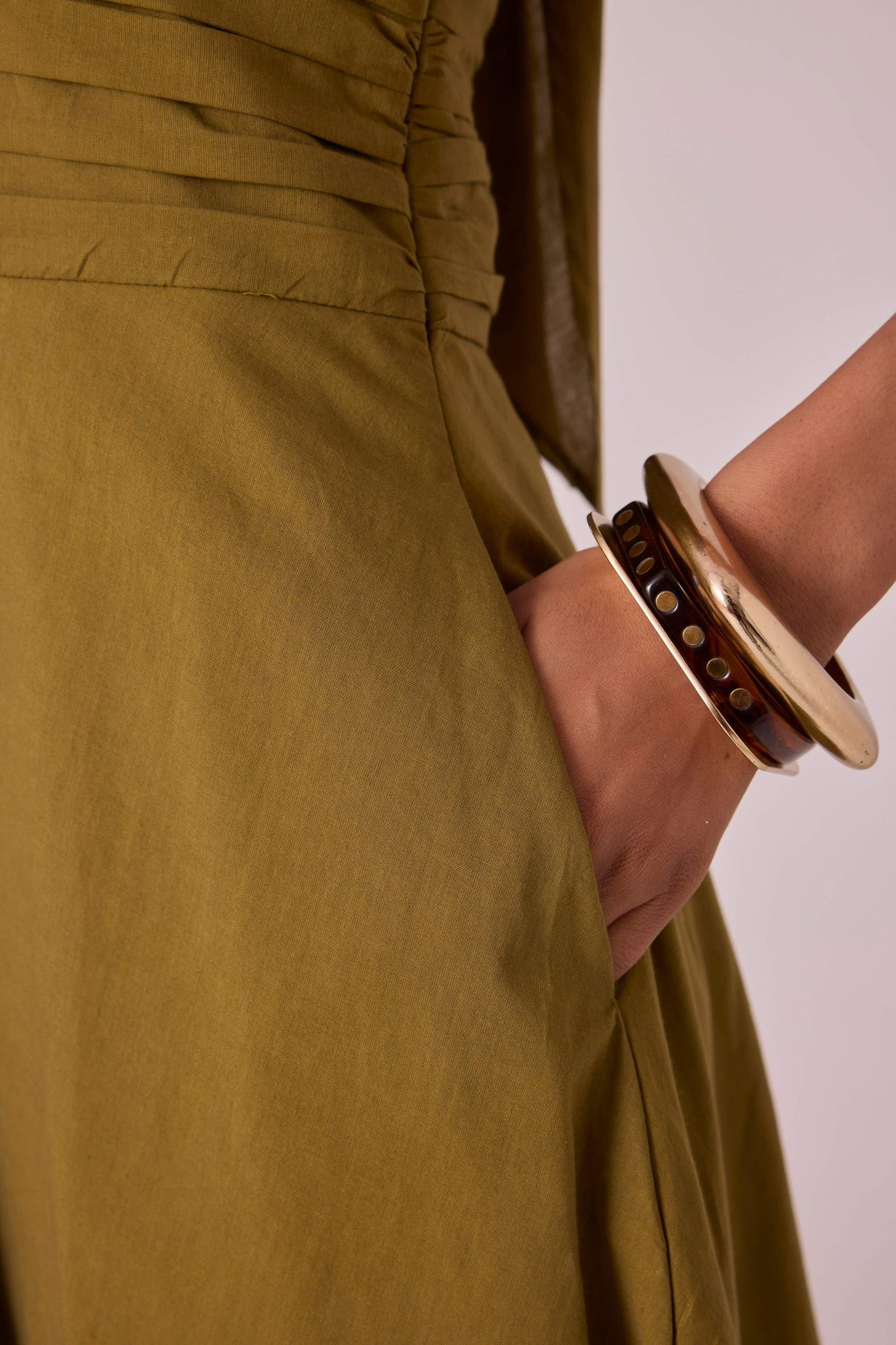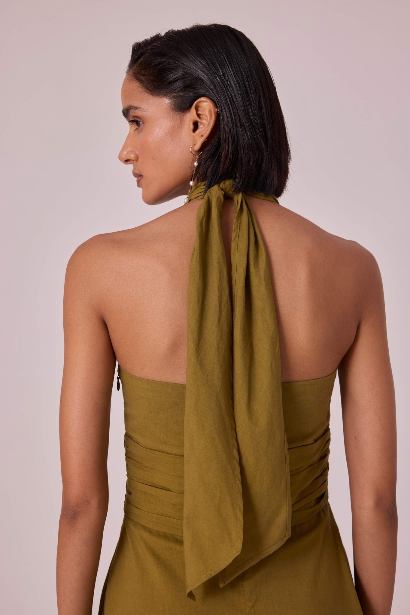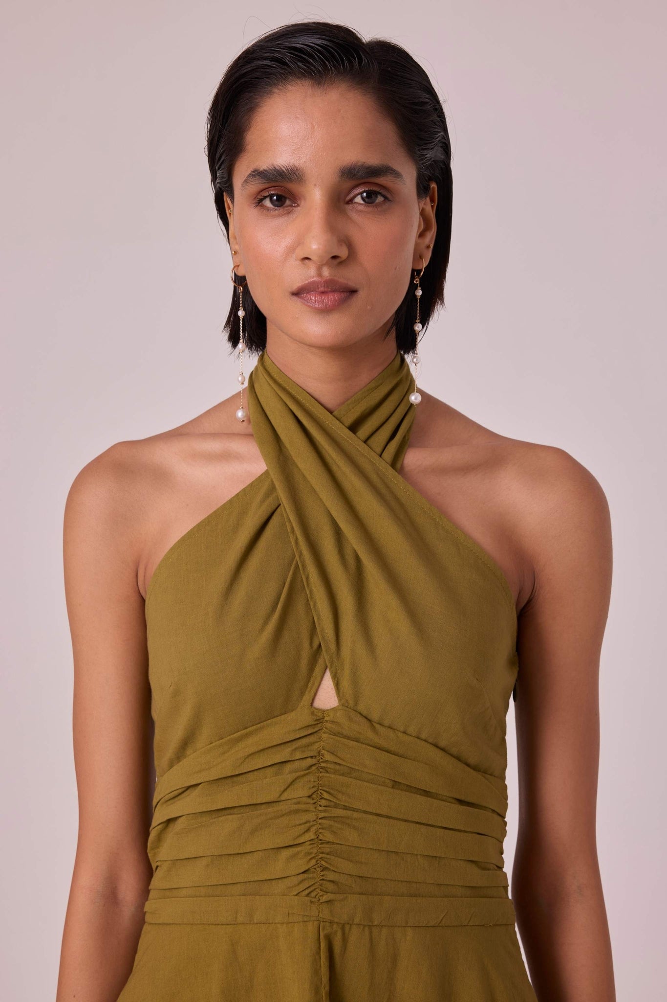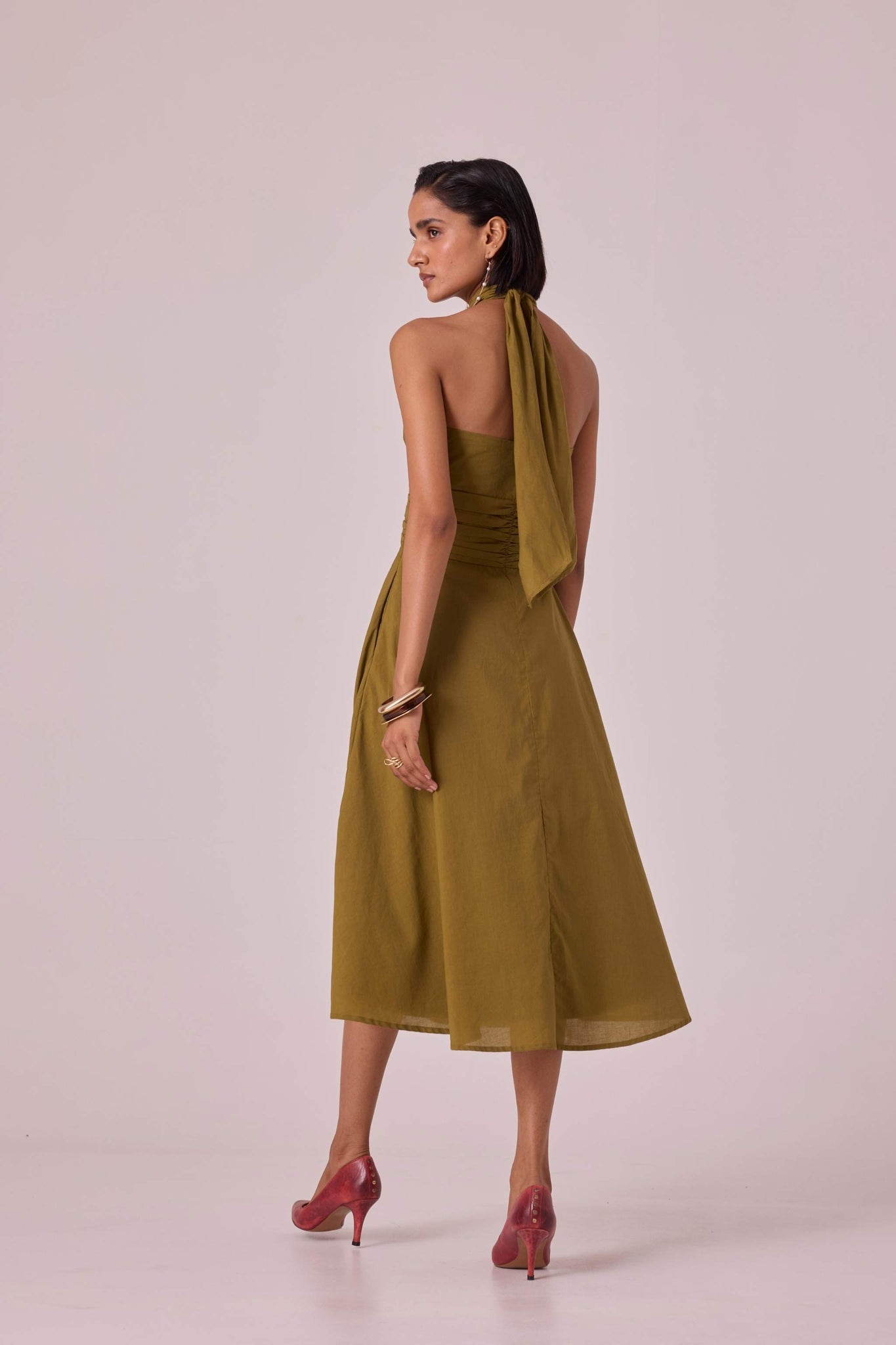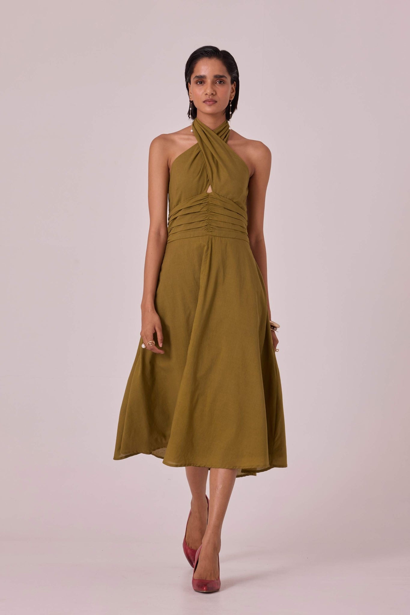 A slightly daring dress. Crossover halter neck. Ruched at the waist for a comfortably cinched shape. Side zip fastening. In-seam pockets. This dress is fully lined.