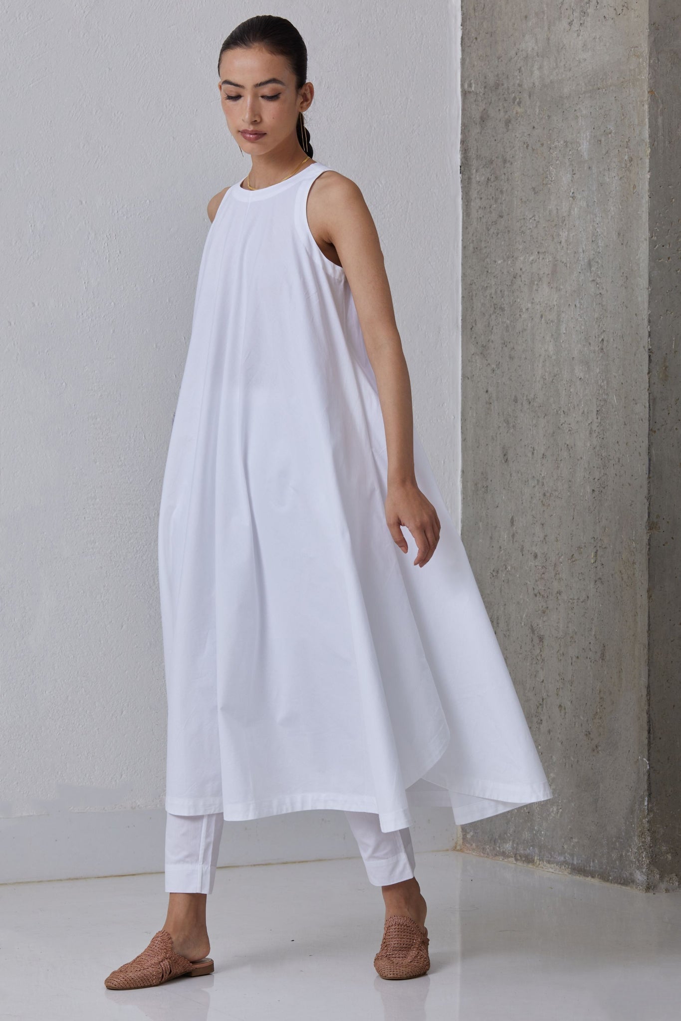 Midi dress with bounteous flare featuring a slight high low hem. Modern high neckline with cutaway shoulders. Pairs well with a belt too. Inseam pockets.