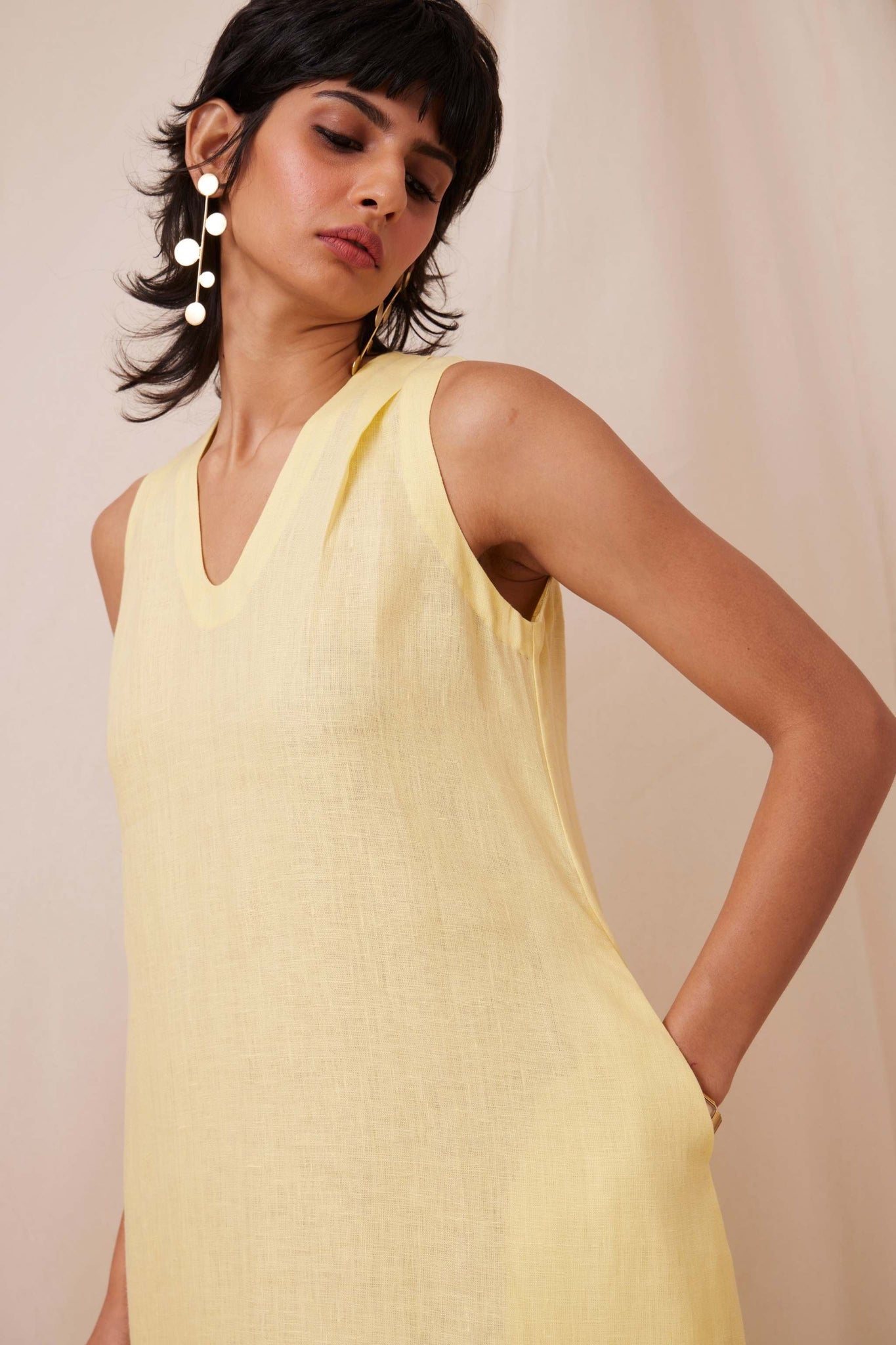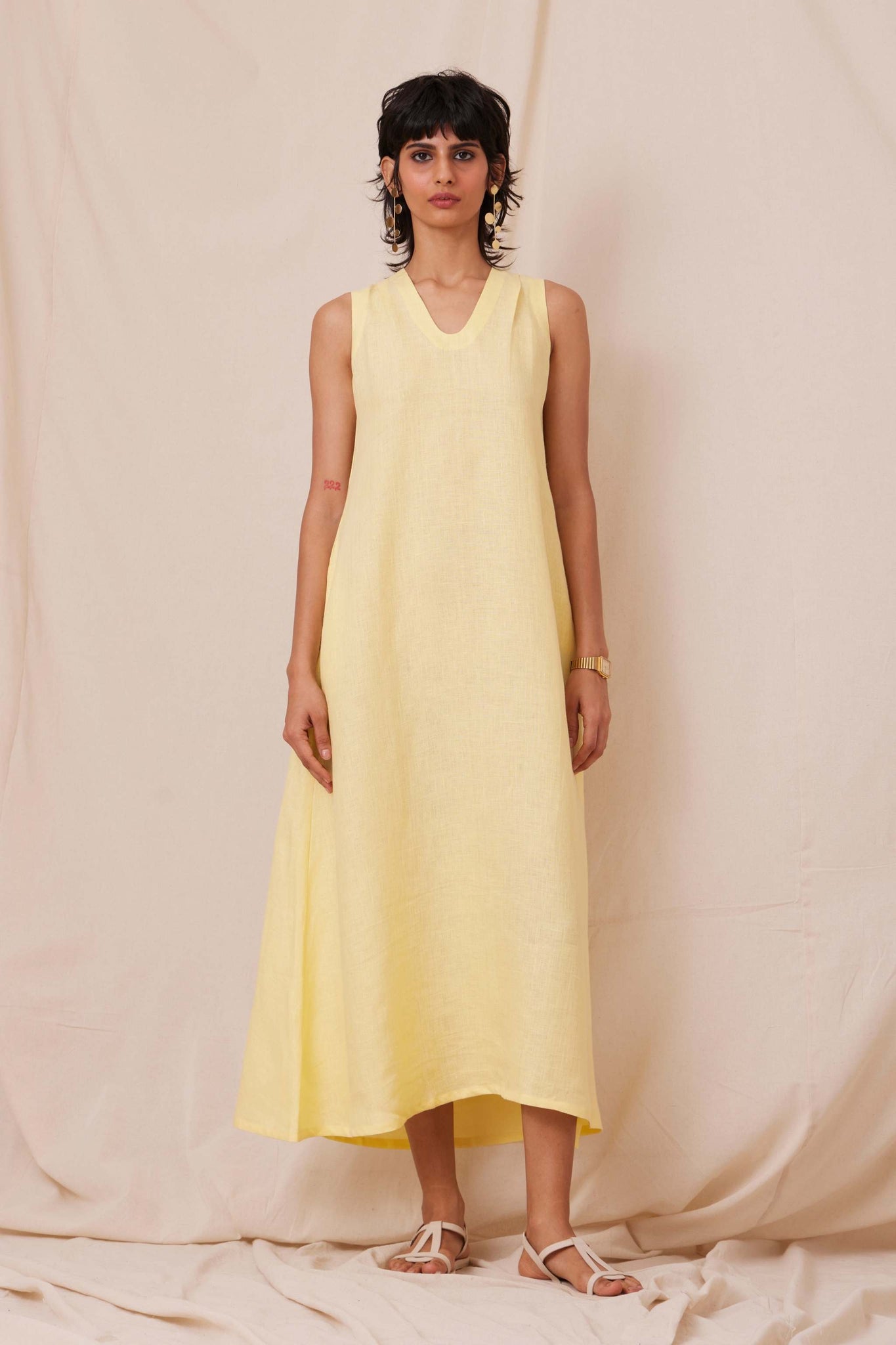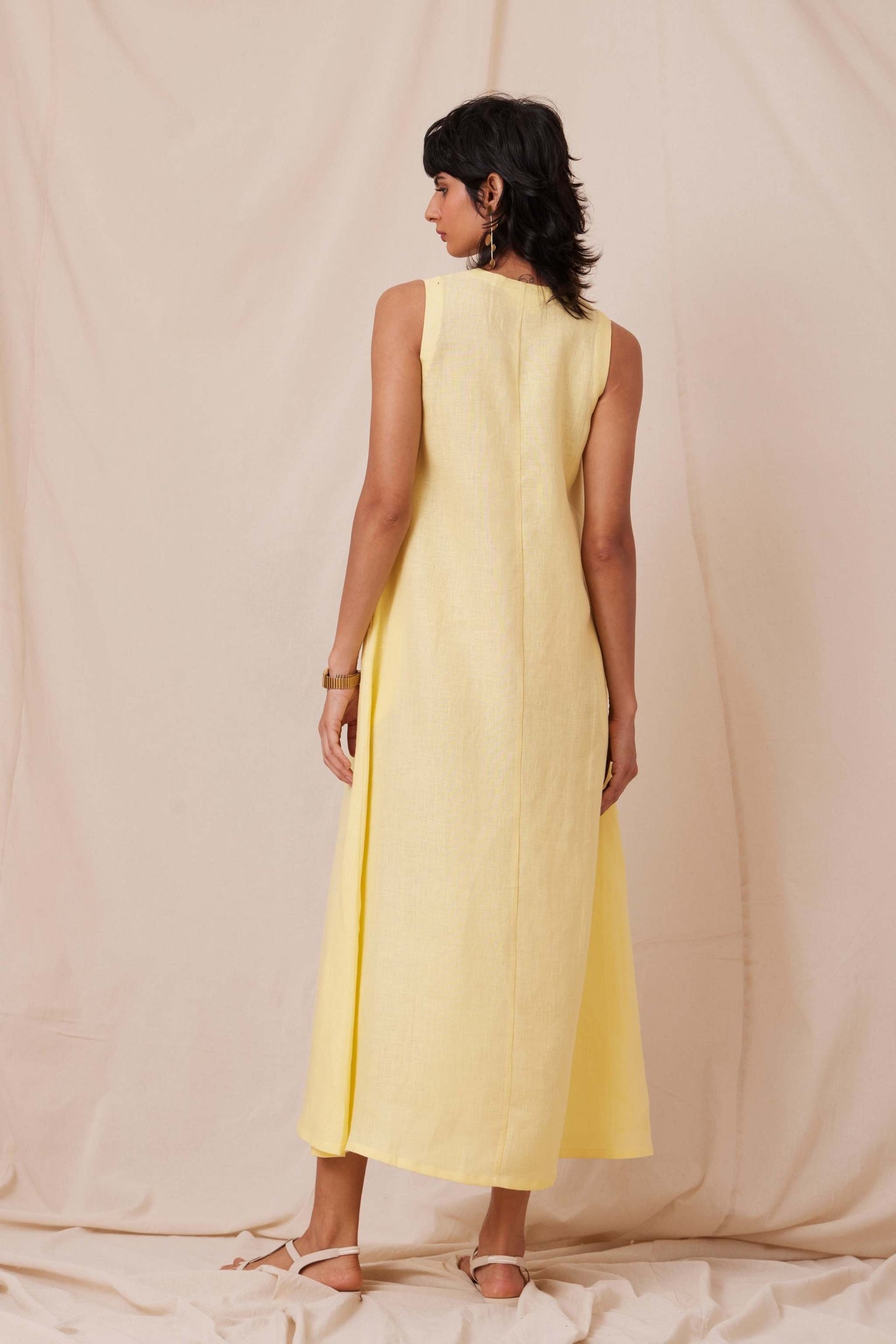 Suave linen dress, ideal for summer. Sleeveless with single pleat collar. In-seam pockets. Shipped with a slip.