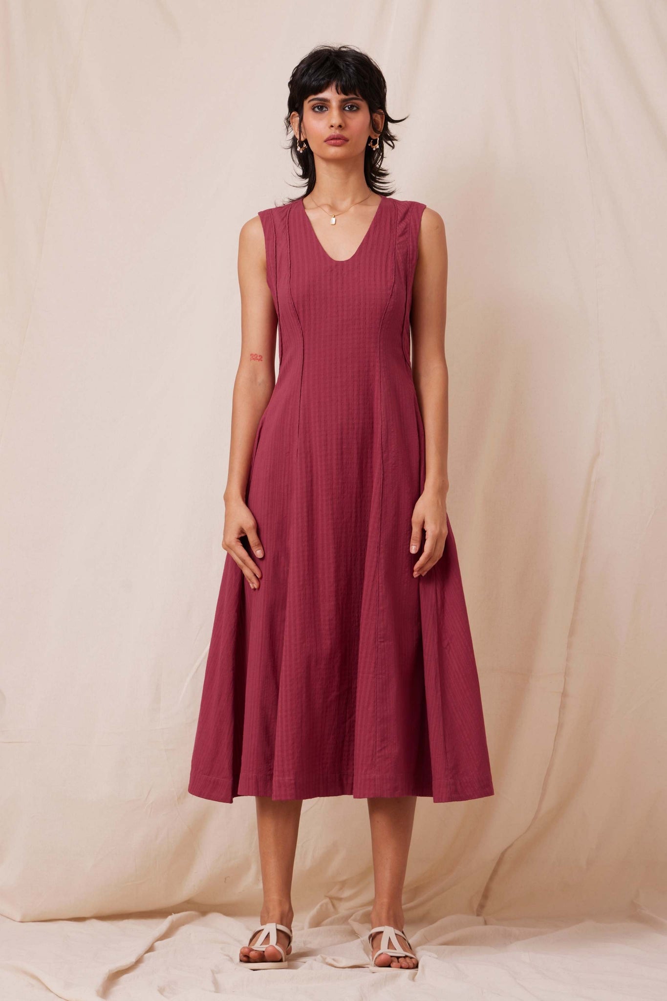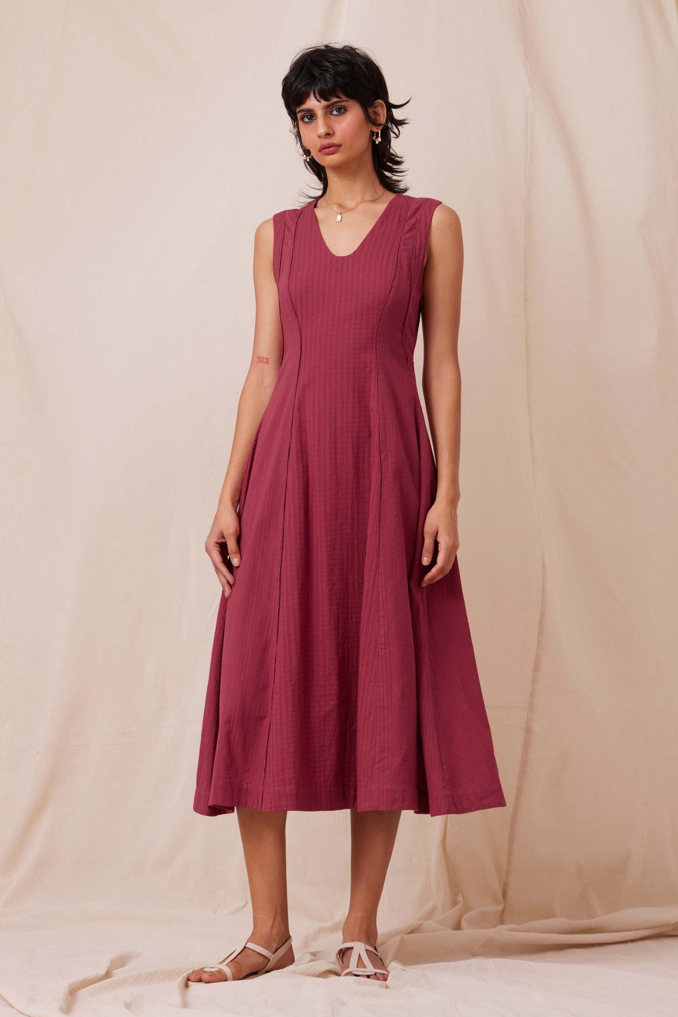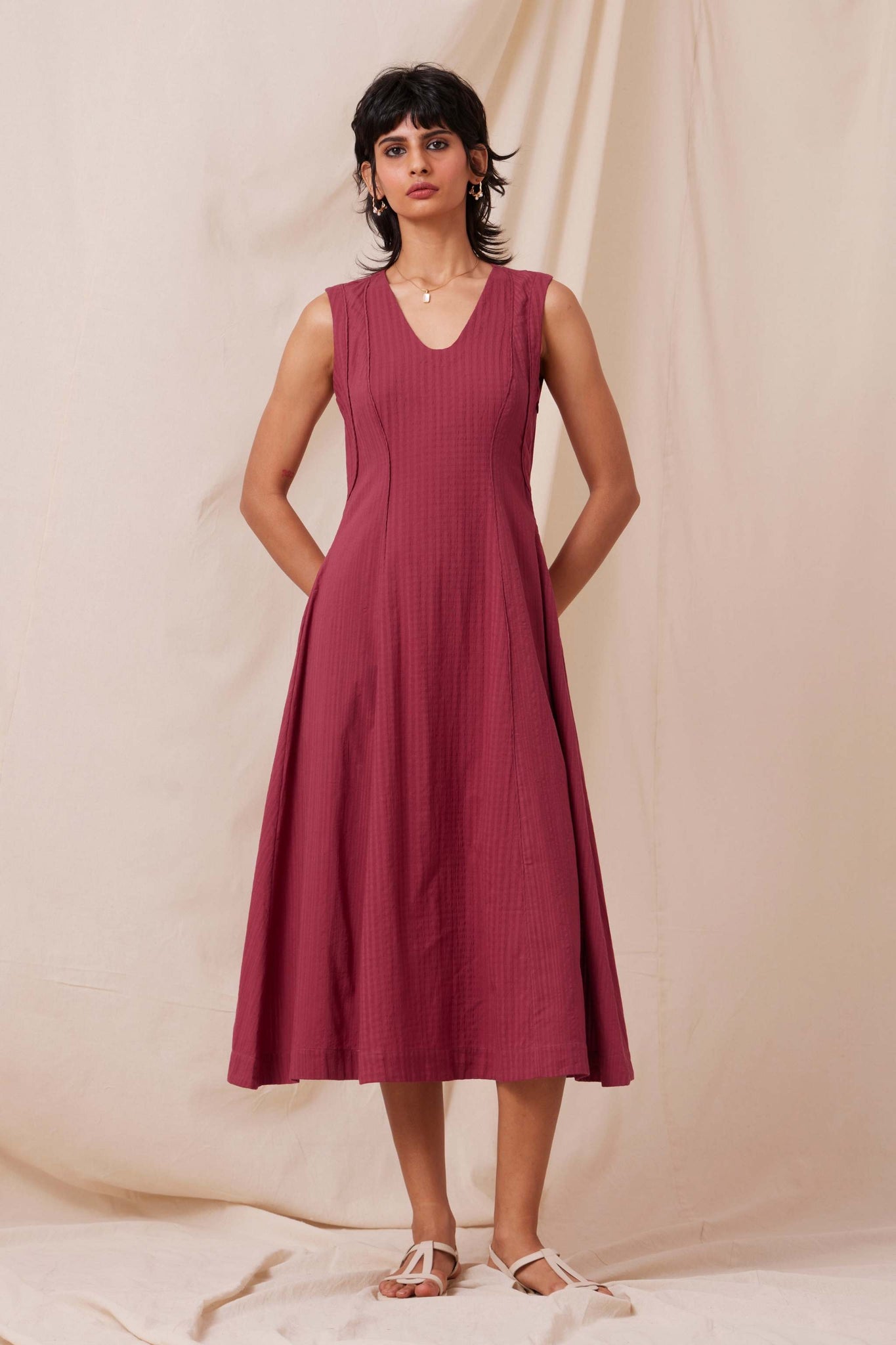 Intricately tailored for a fresh take on fit and flare. Soft V-neckline. Flattering paneling with piping detail. Inseam pockets. Side zip fastening. This dress is fully lined.