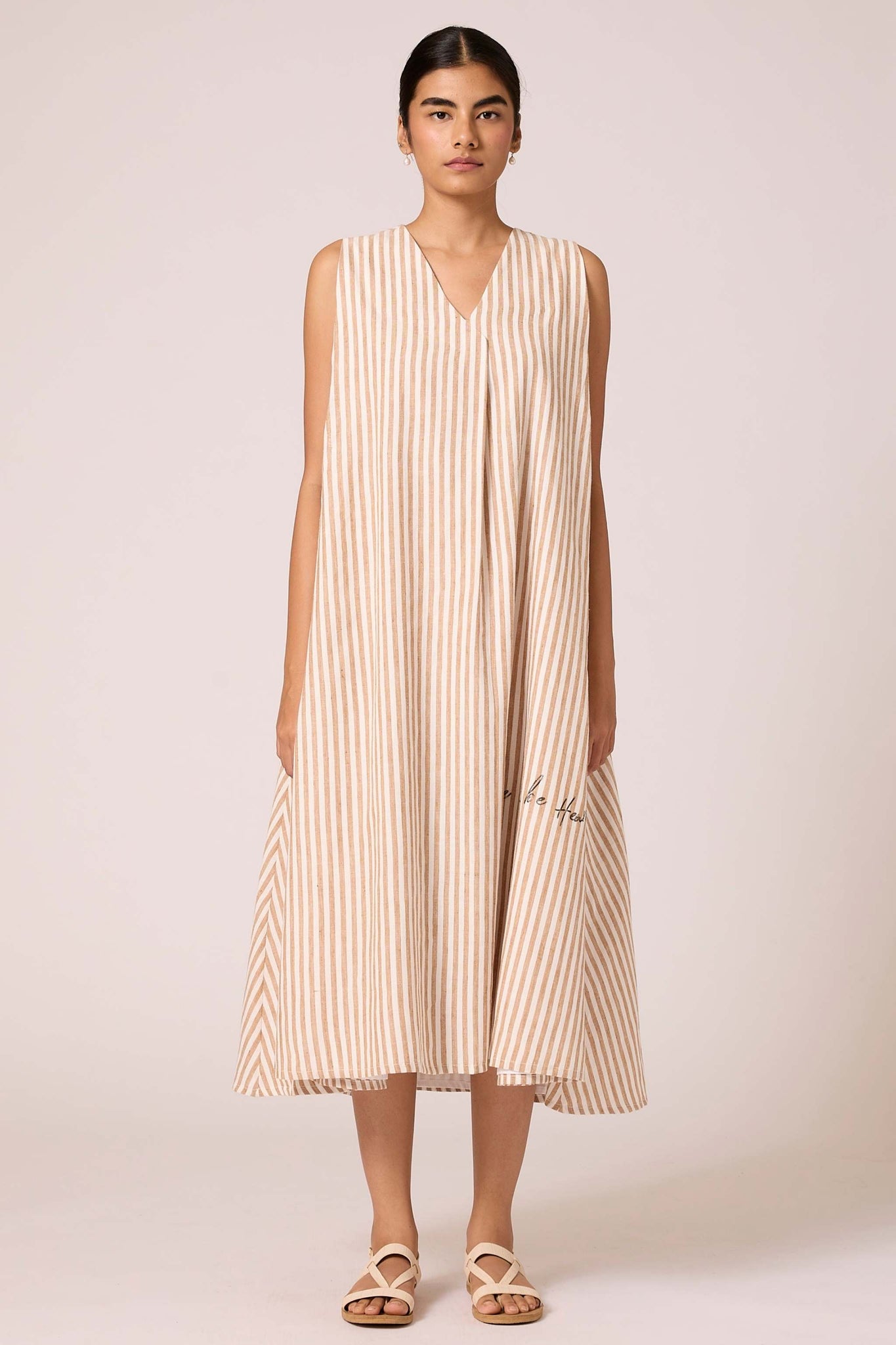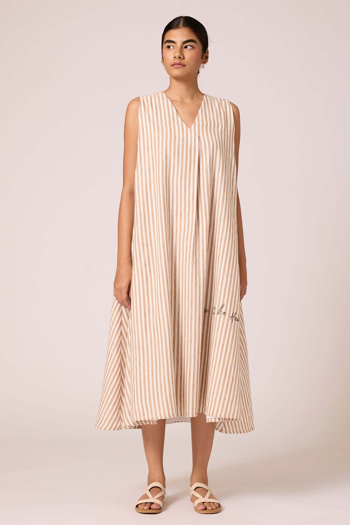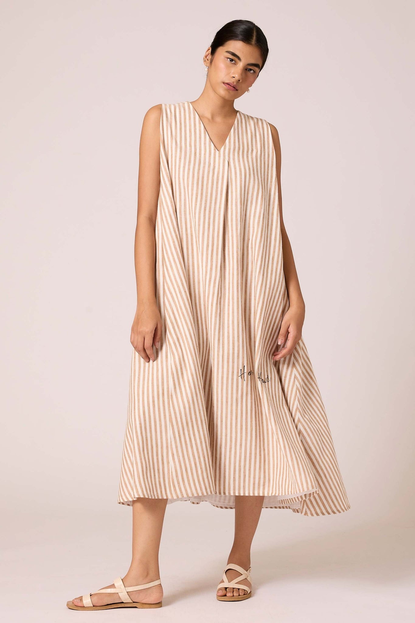 A summer essential tent dress with a v neckline in handwoven linen cotton. Inseam pockets. Fully lined for comfort.