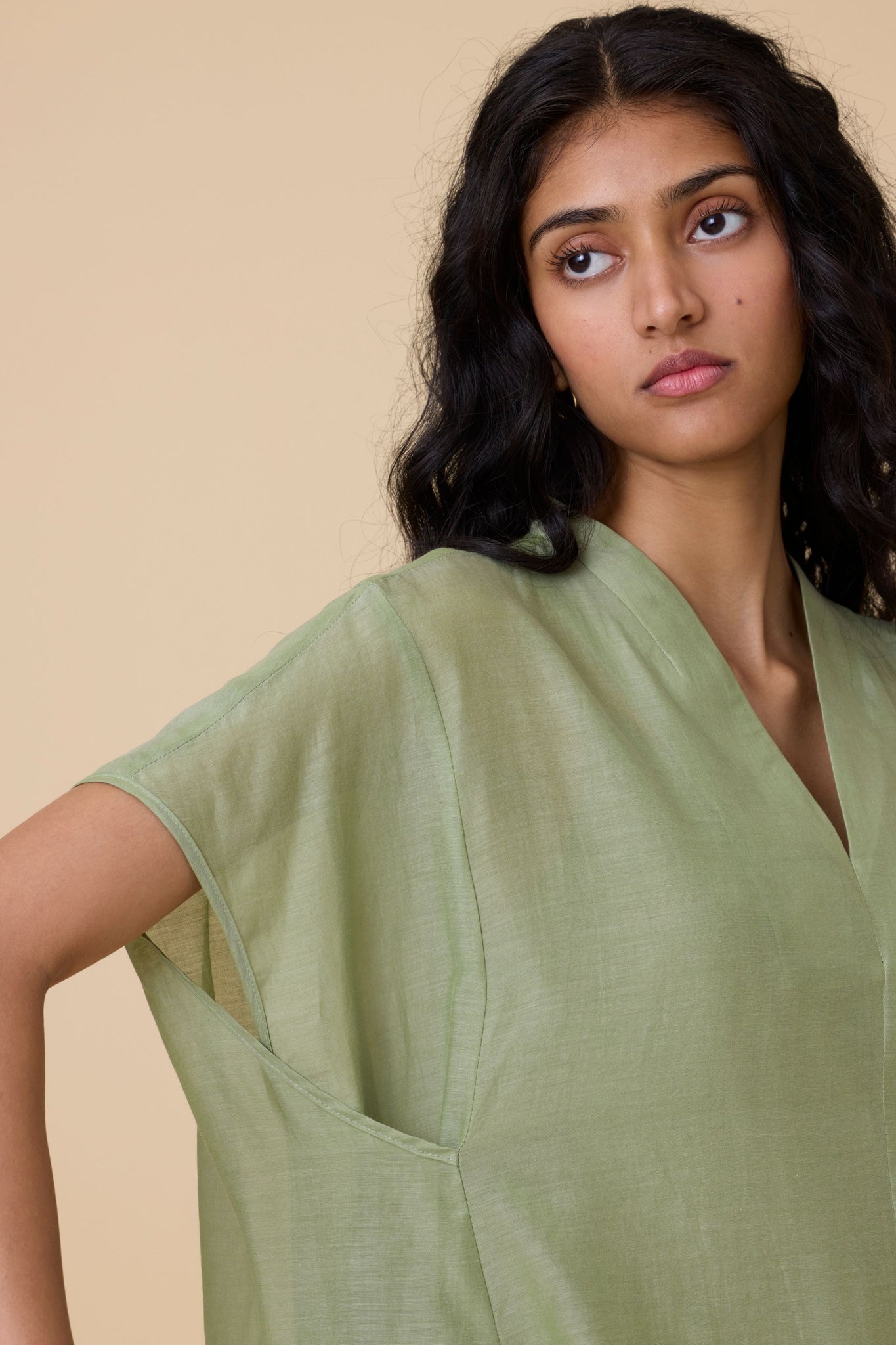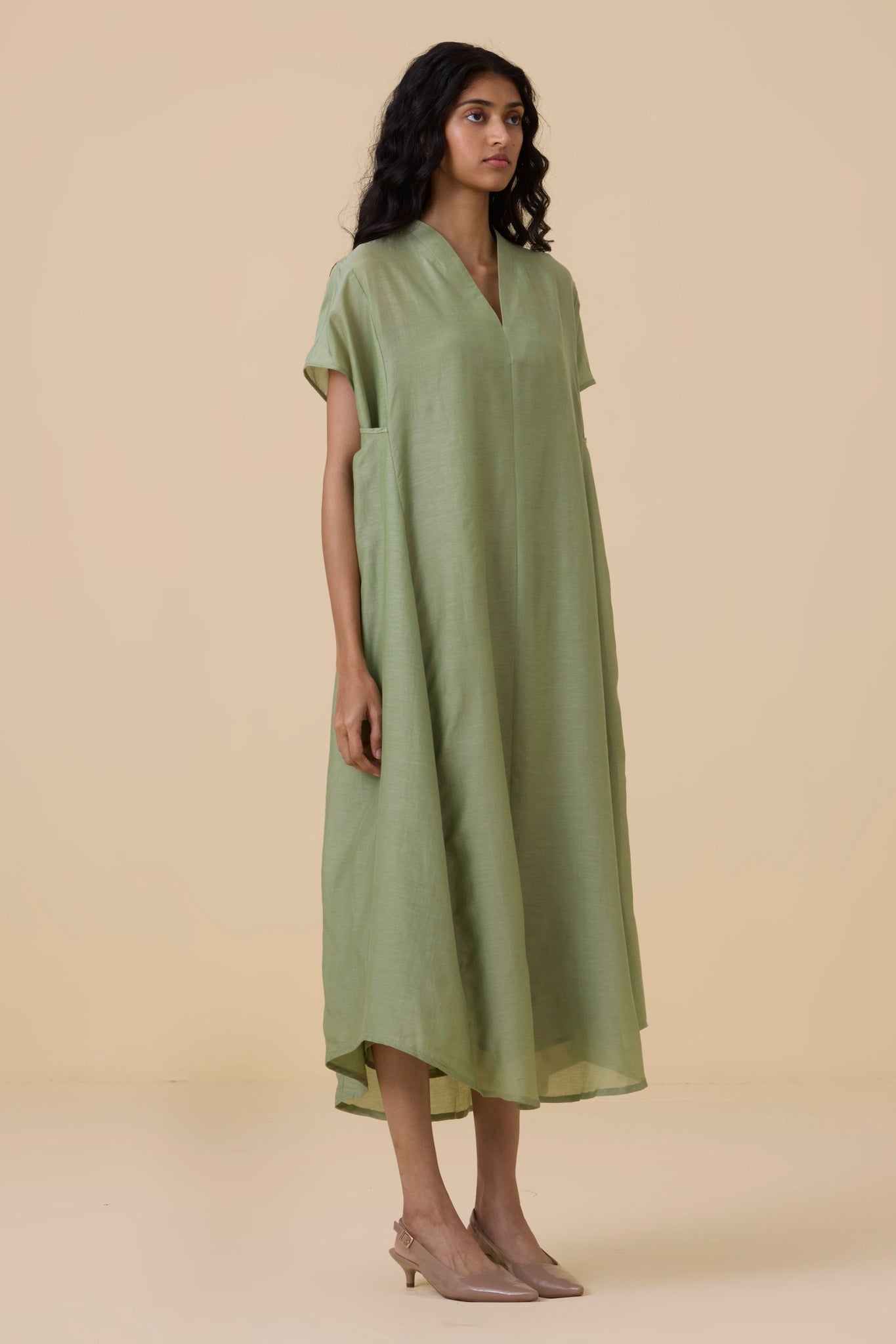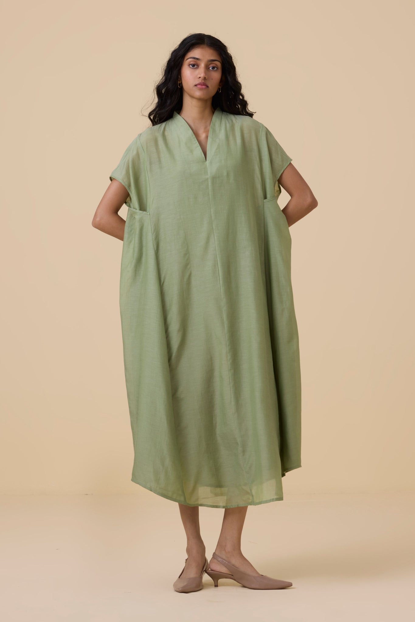 Kaftan-style dress designed with a resort state of mind. Sharp V neckline. Crafted in cotton silk. In-seam pockets. Slip included.