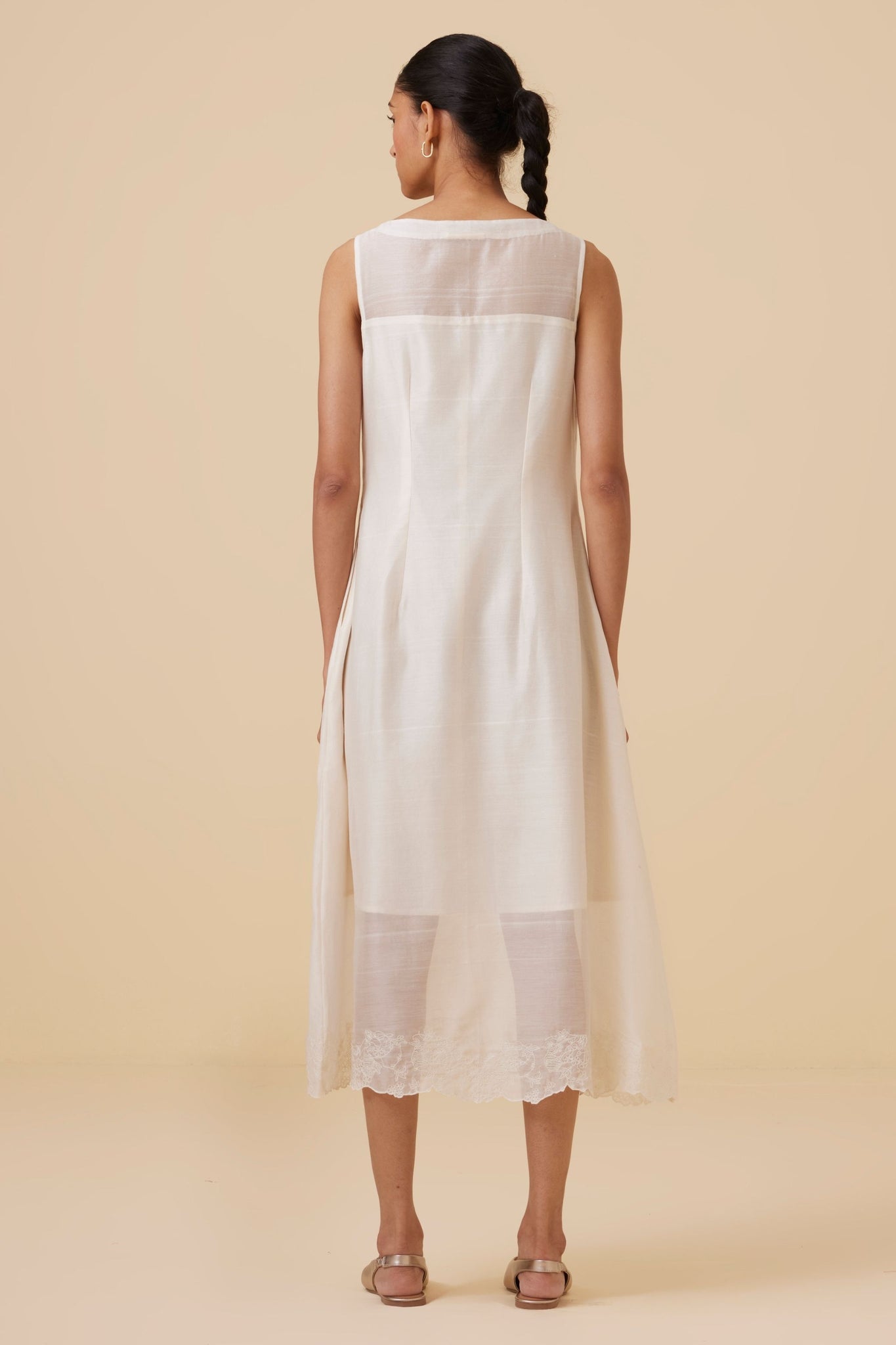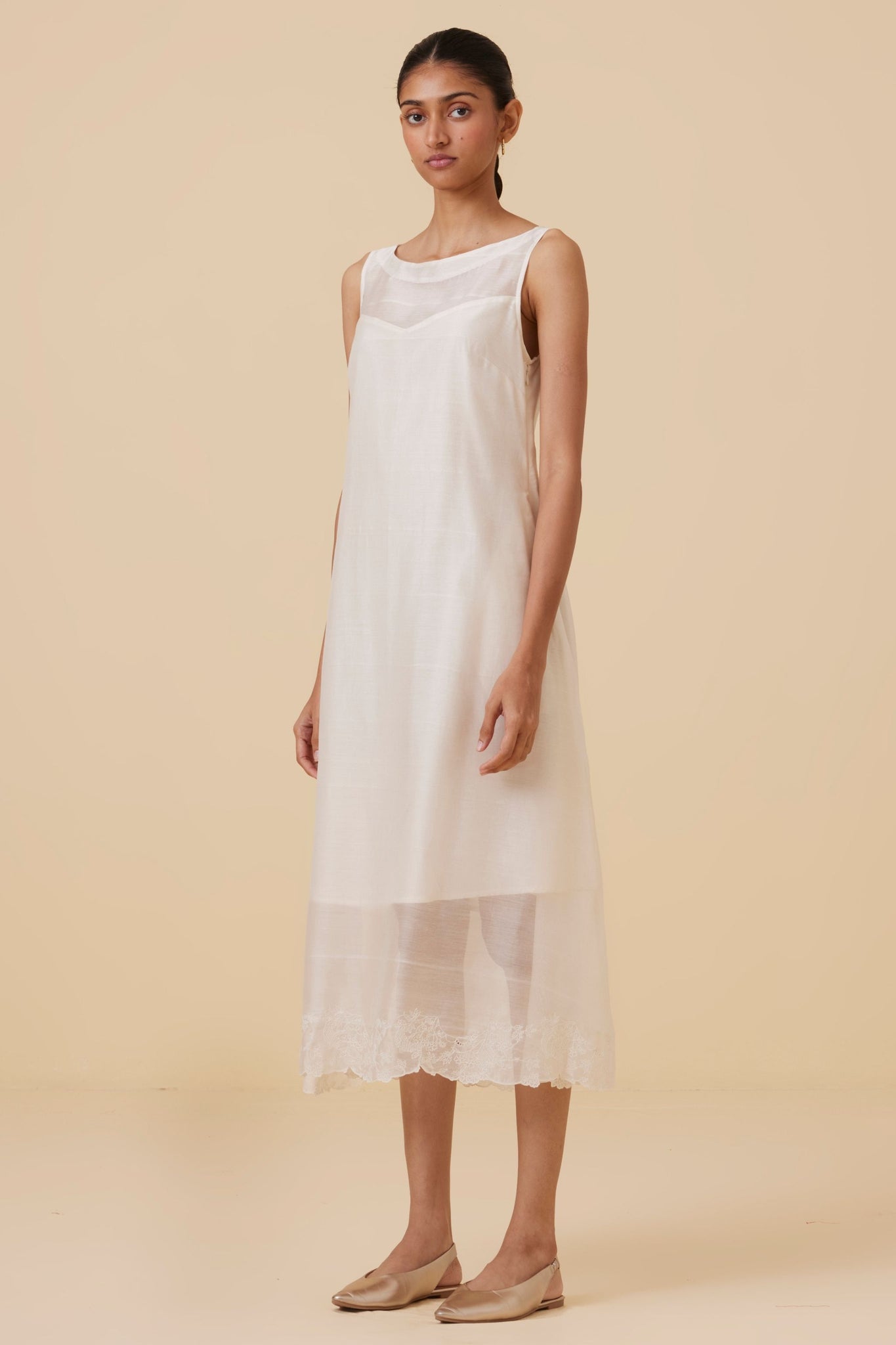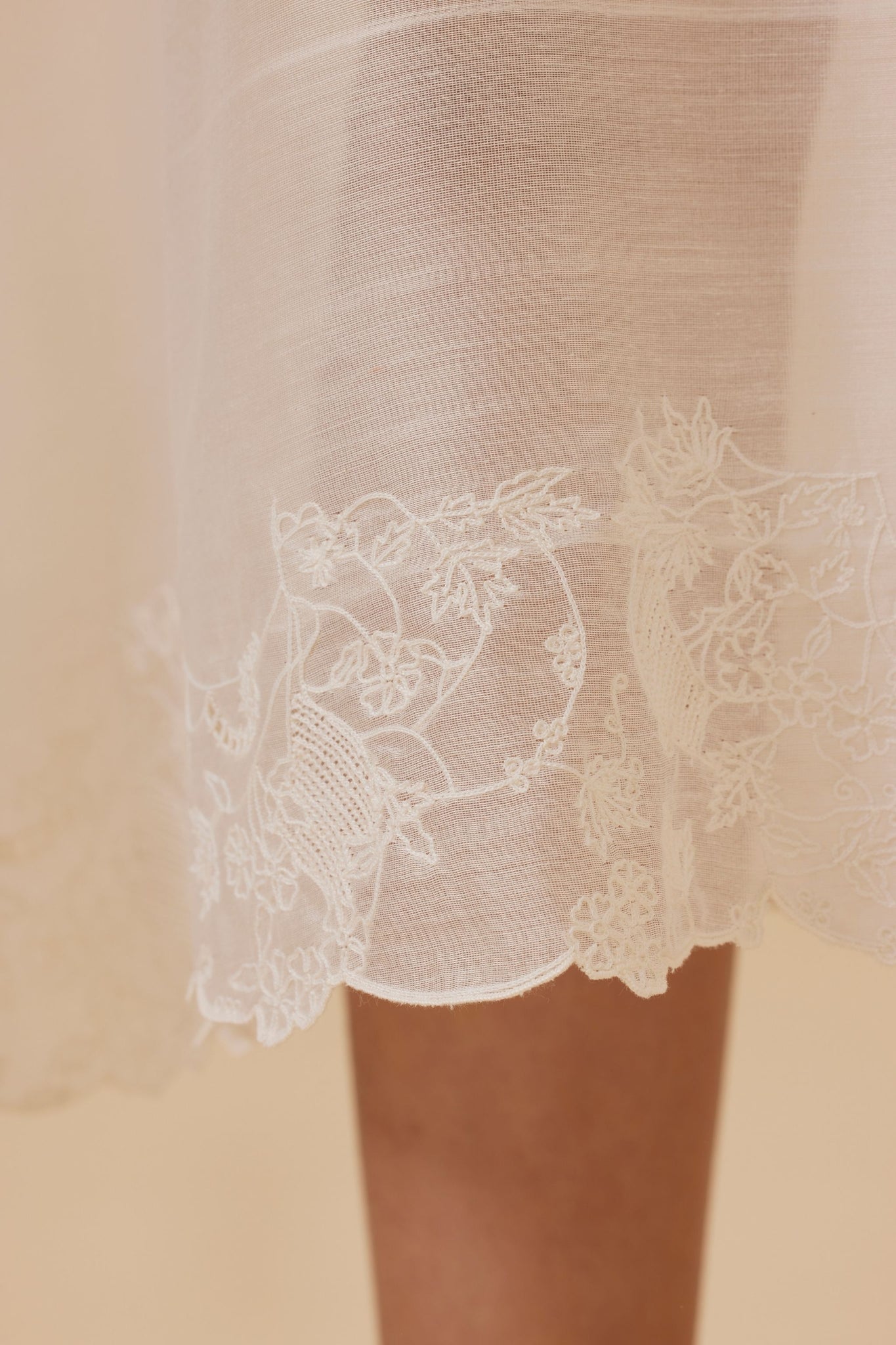 Vintage inspired dress with a delicate embroidery at the hem inspired by lace. This dress is lined as shown in the images. Sleeves can be added on request.