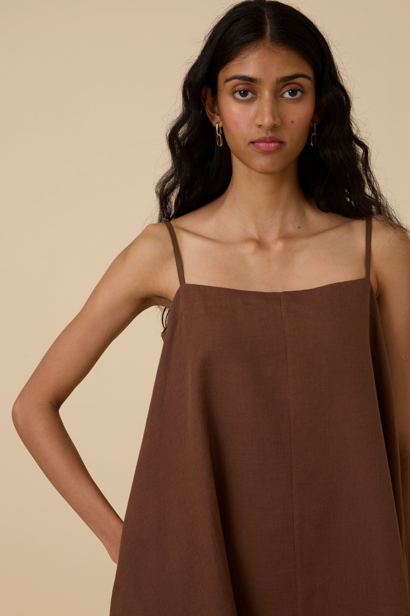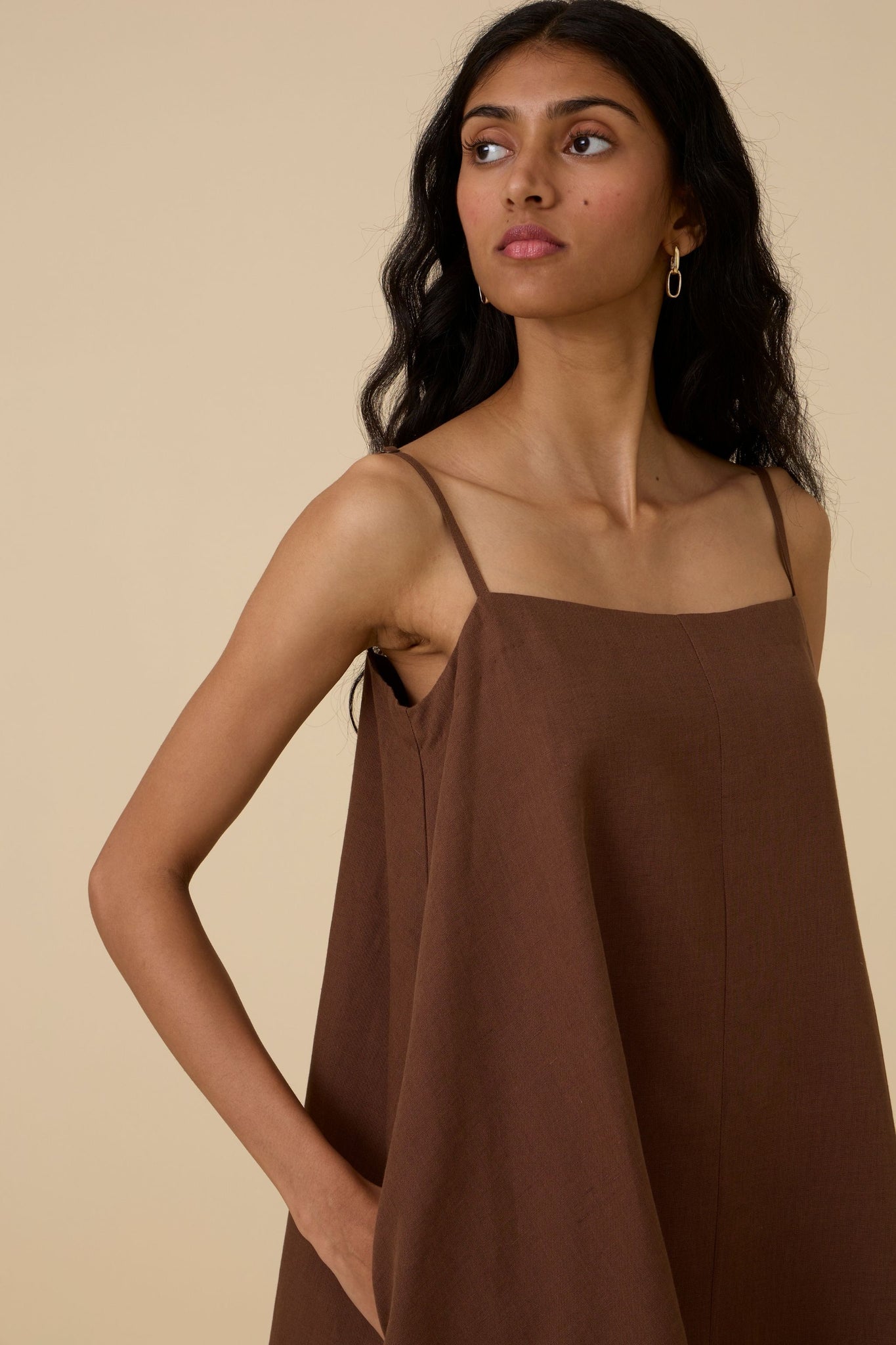 A classic slip dress in linen cotton. Adjustable straps for a custom fit. In-seam pockets. Fully lined.