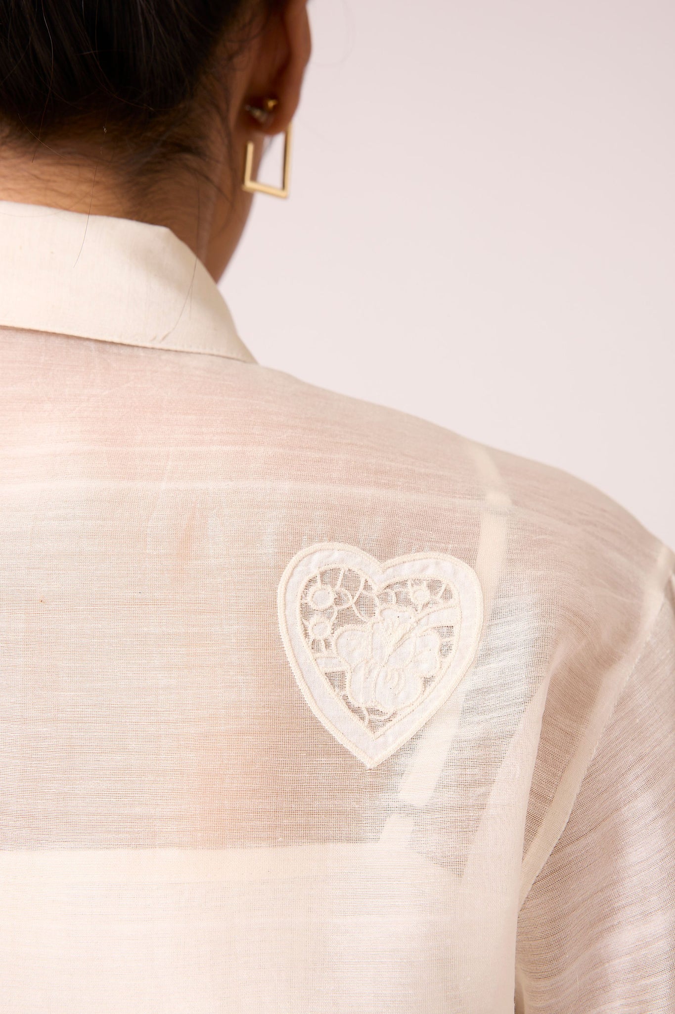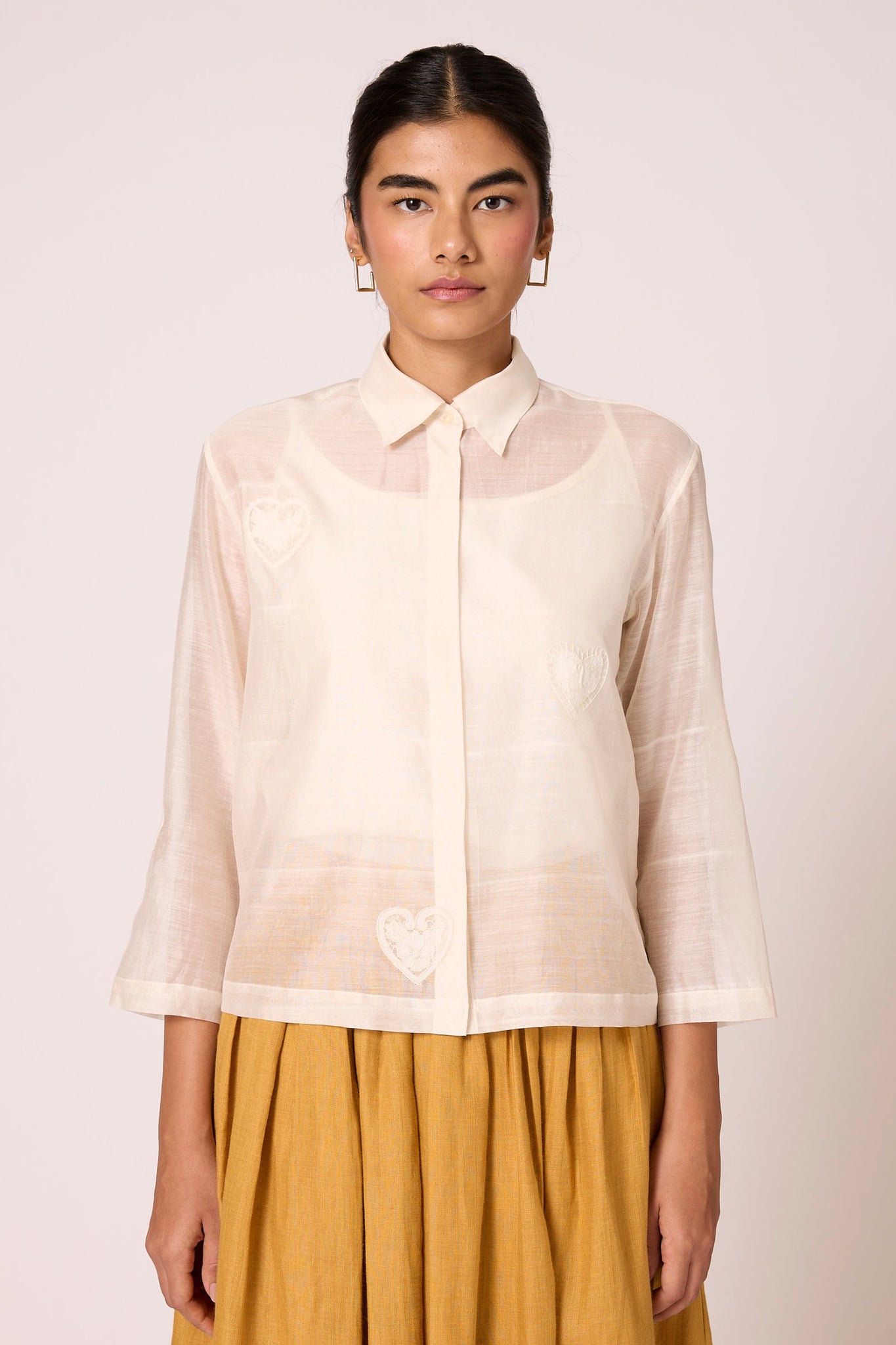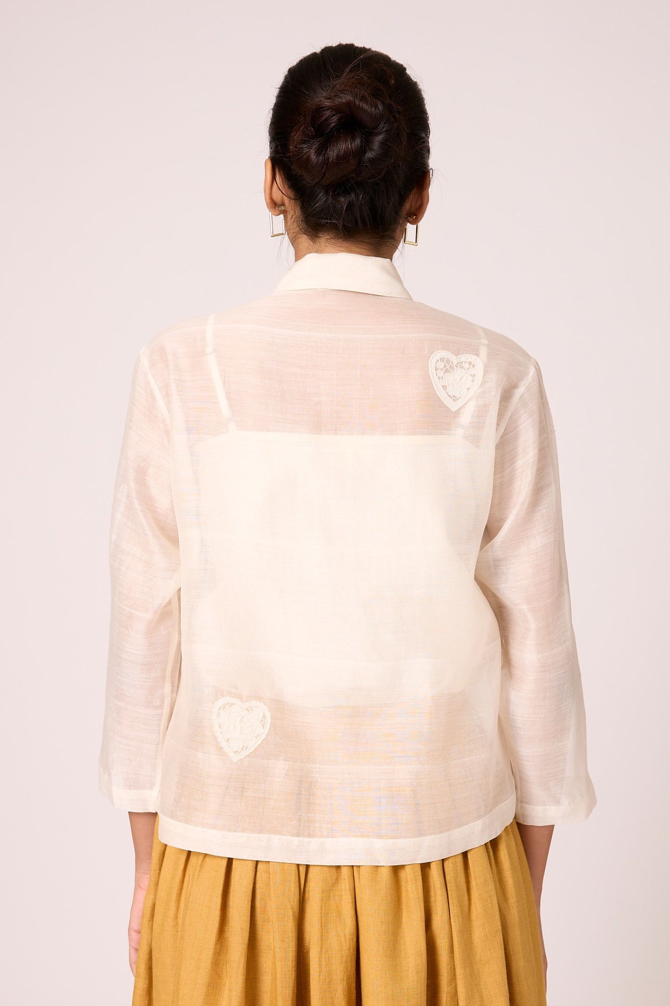Hand embroidered with a delicate motif in our studio. A short shirt-jacket with front open button-down placket and drop-shoulder sleeves. Crafted from exquisite Chanderi fabric. Can be worn as a shirt or a slip-over layer.