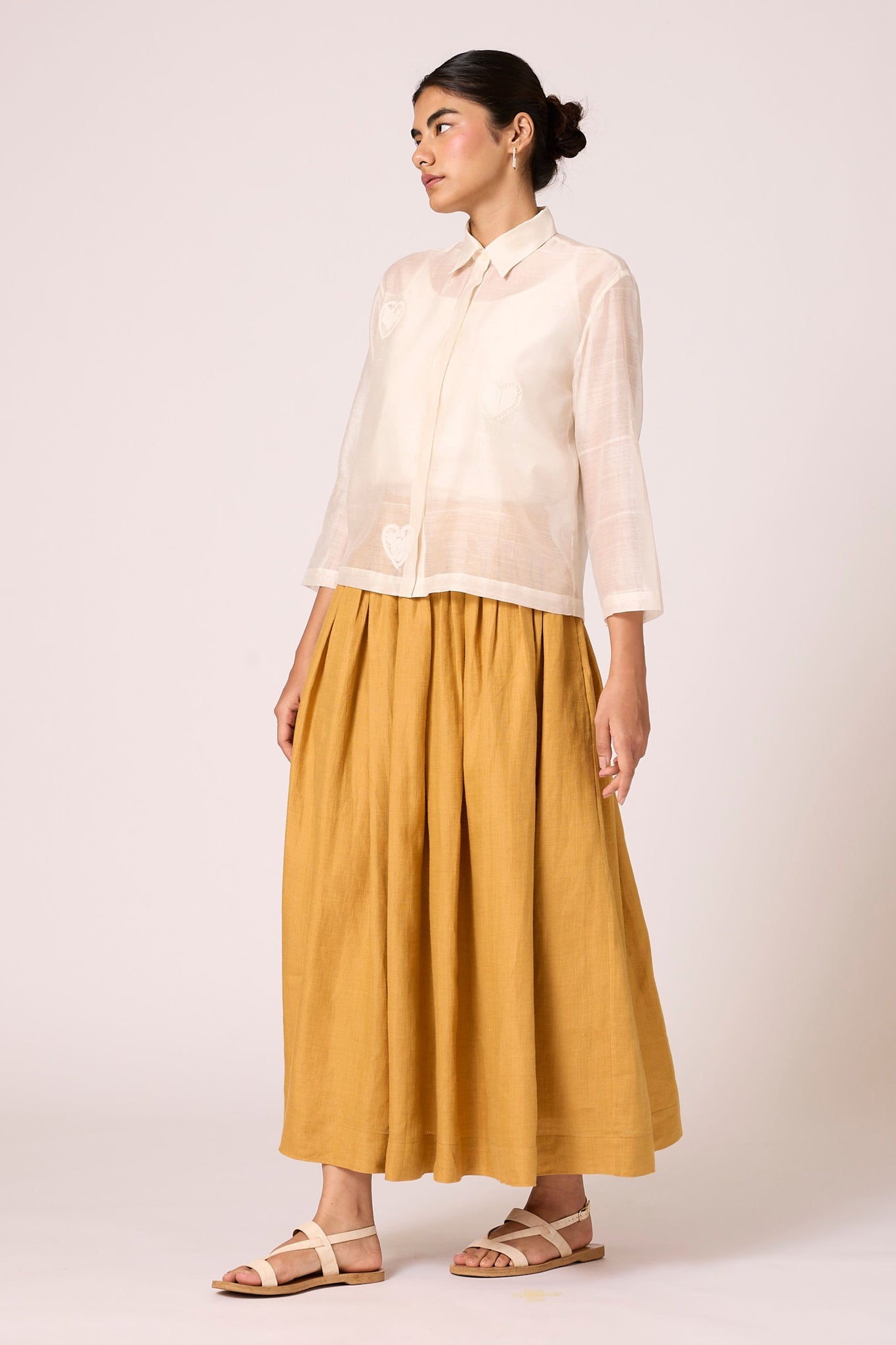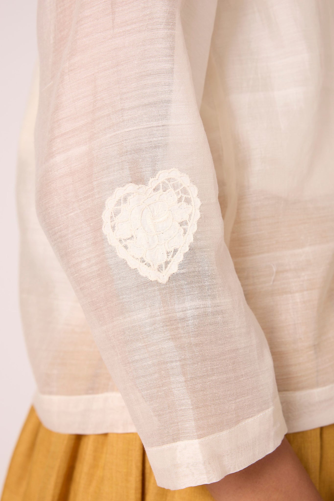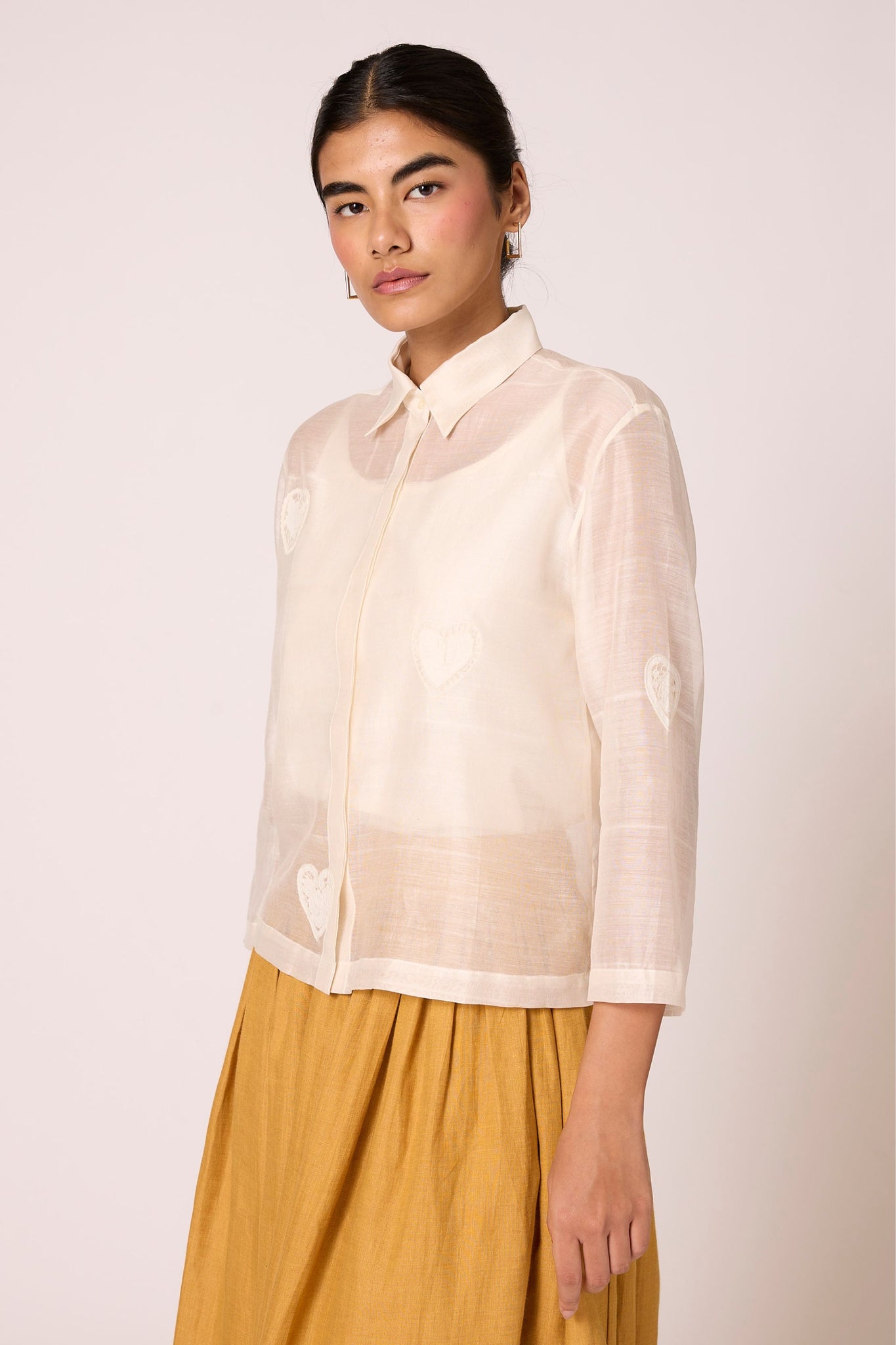Hand embroidered with a delicate motif in our studio. A short shirt-jacket with front open button-down placket and drop-shoulder sleeves. Crafted from exquisite Chanderi fabric. Can be worn as a shirt or a slip-over layer.