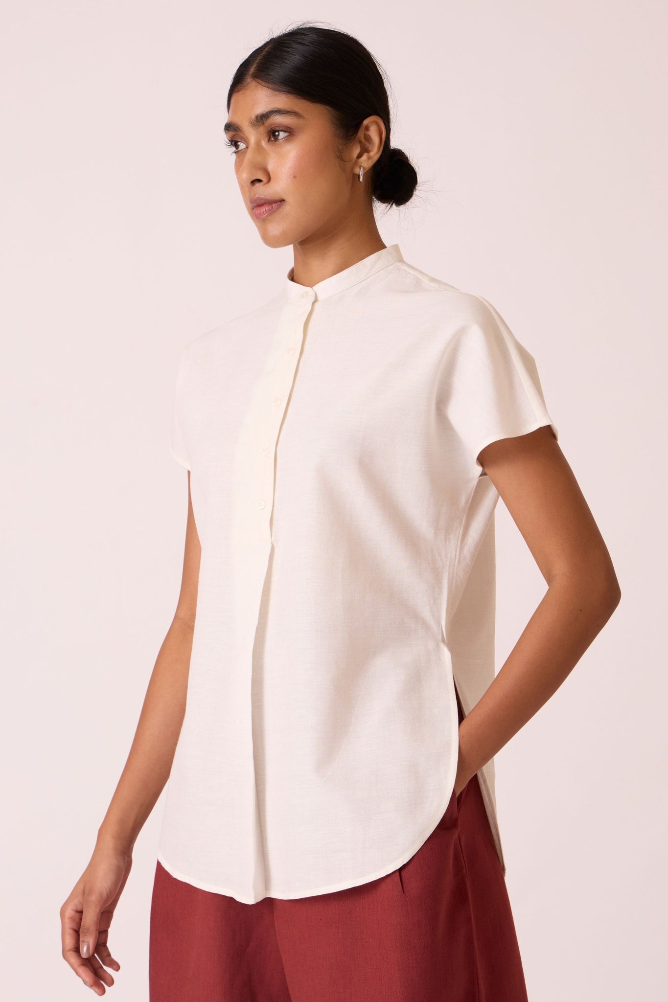 Crafted from soft handwoven cotton. Easy fit with drop sleeves. Concealed placket. Accentuated high-low hem.