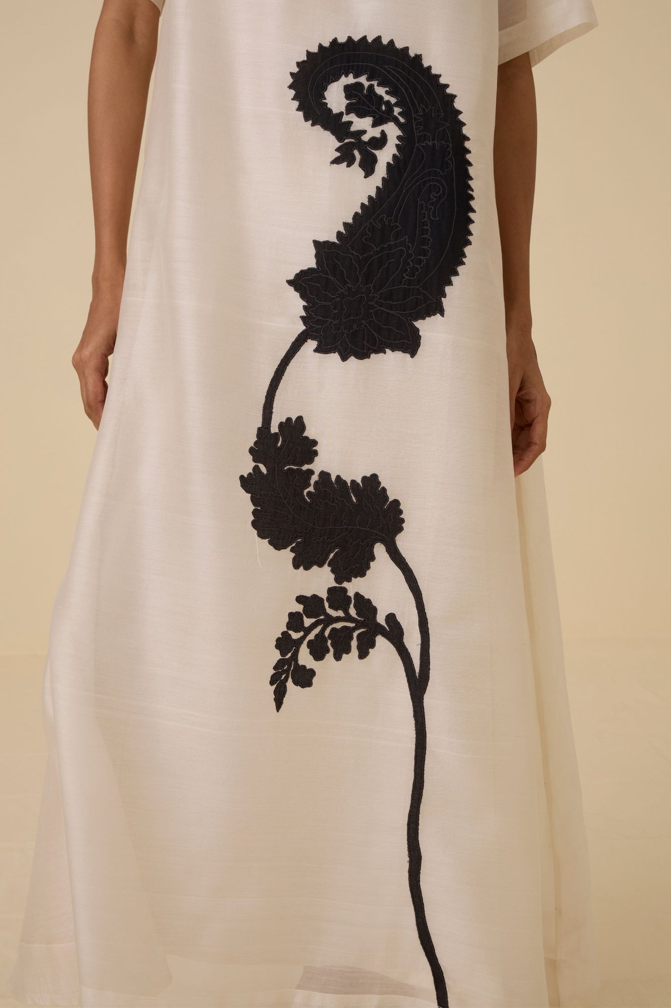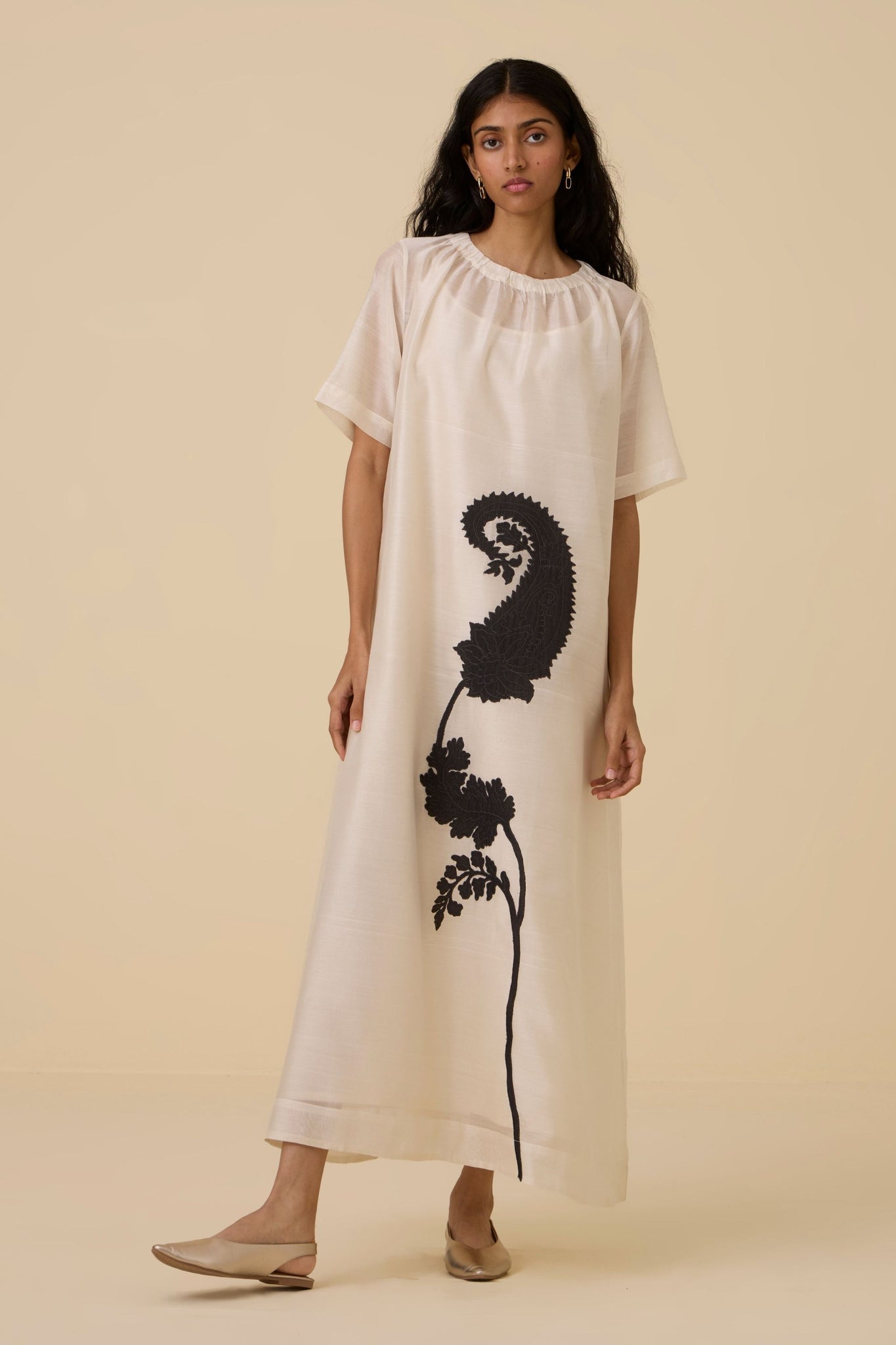 Striking signature hand appliqué on fine chanderi makes this quite the statement dress. Neat gathers at the neck. Rouleau button fastening at the back. In-seam pockets. Slip included.