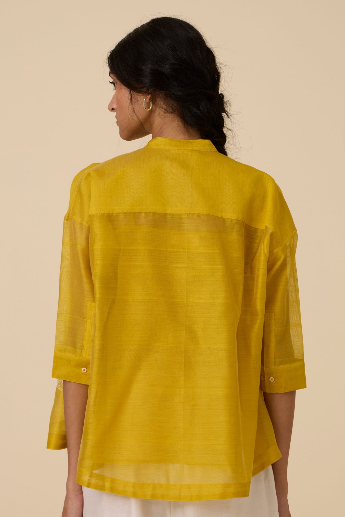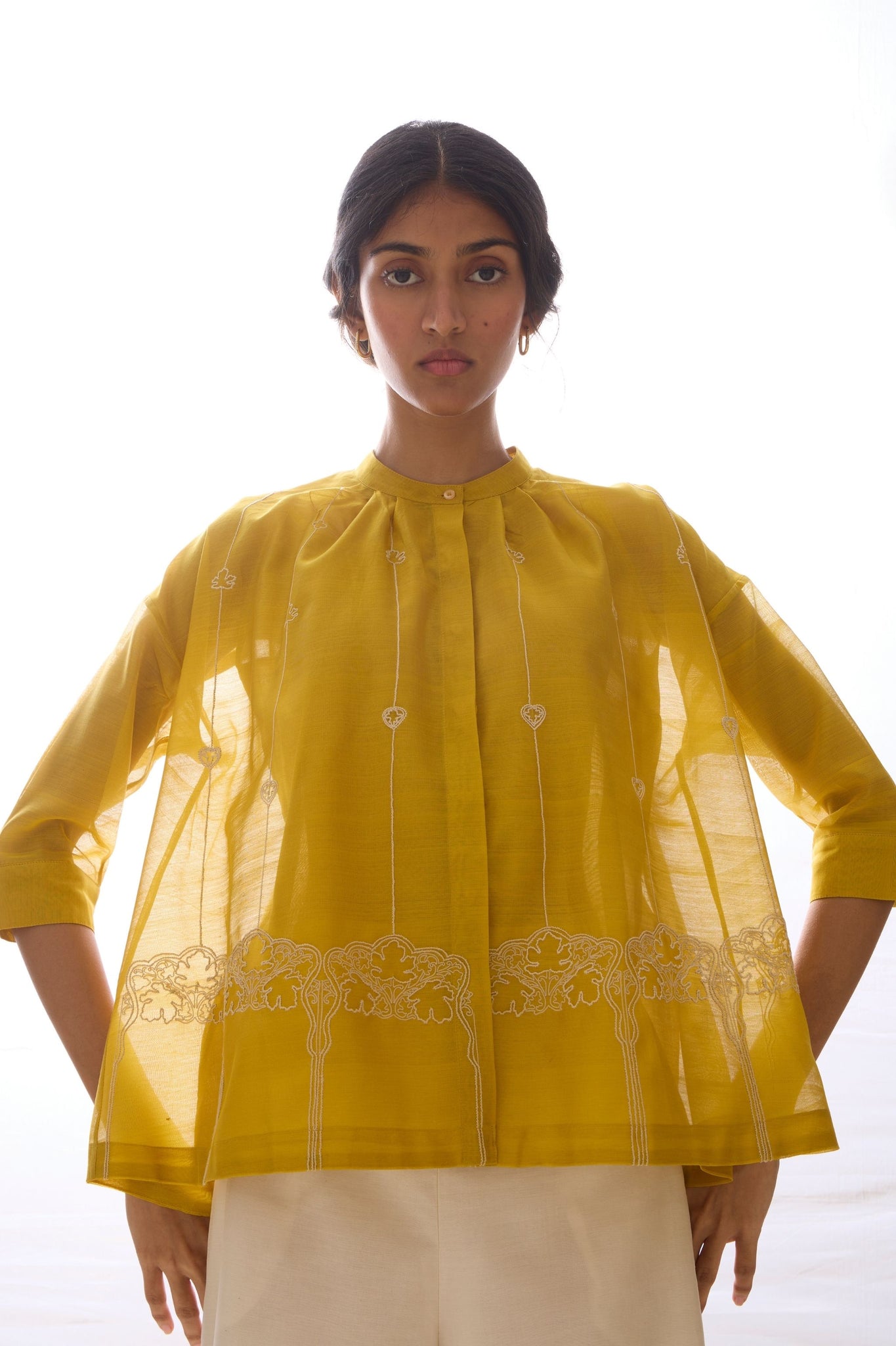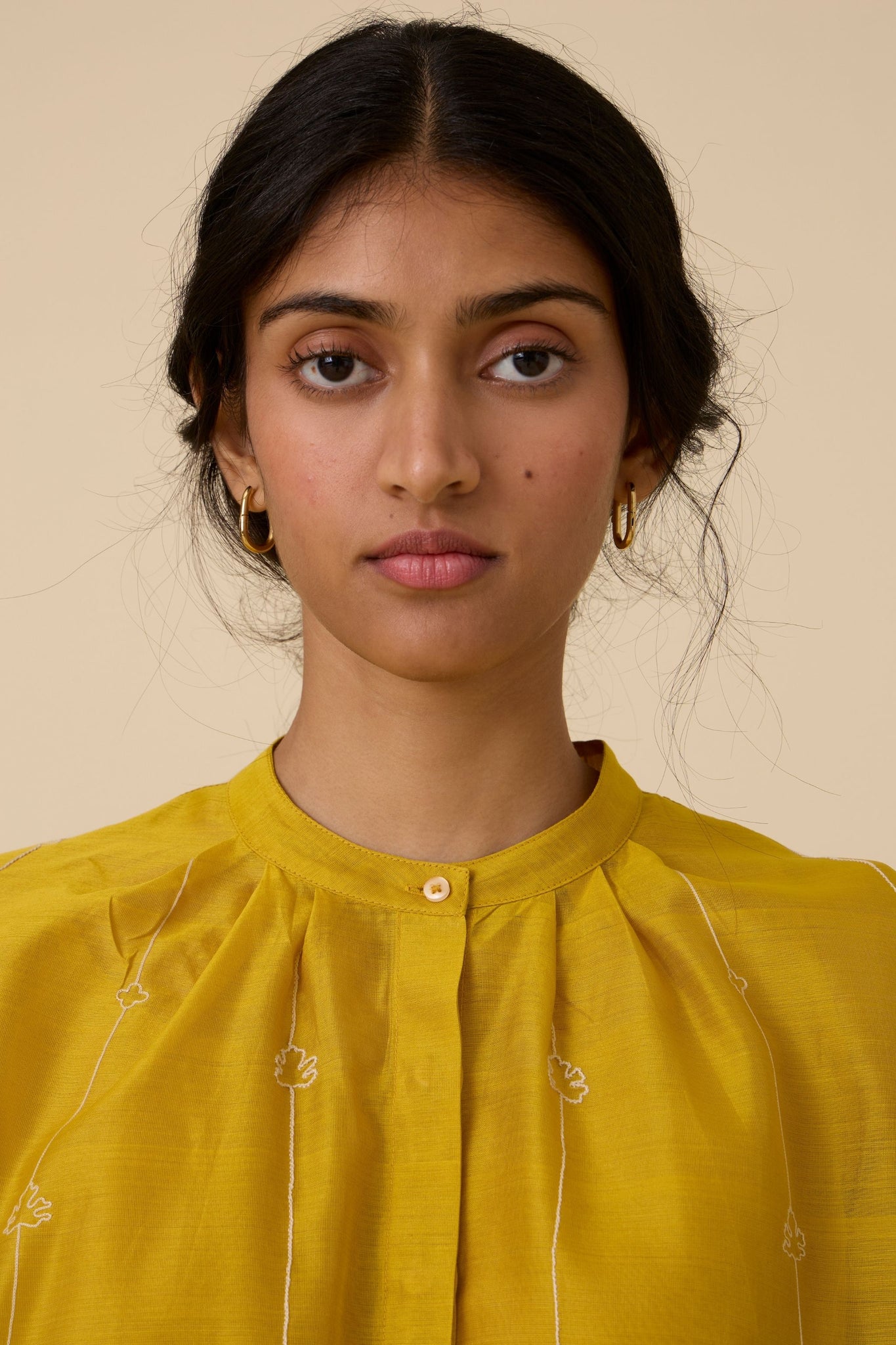 An exquisite top crafted from handwoven chanderi. Finely hand embroidered in our studio.