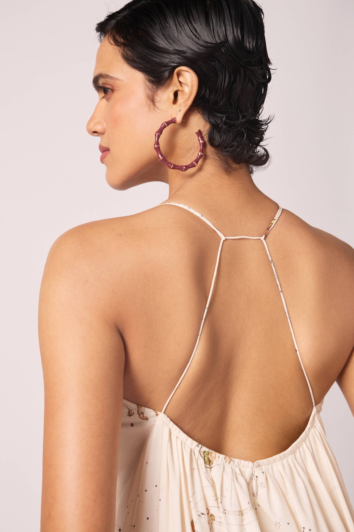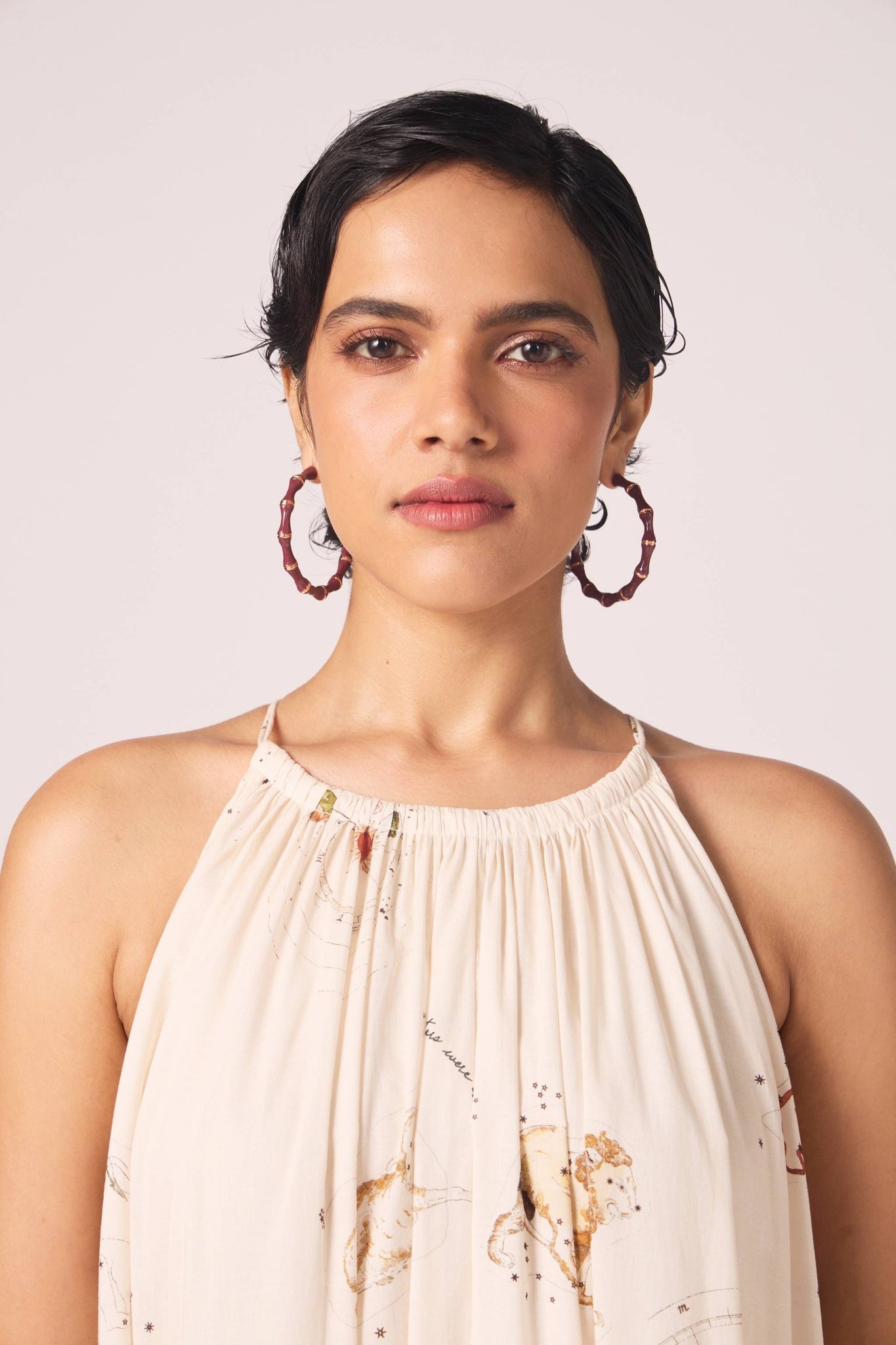 Elongated in line, light in spirit. The shoulder baring halter neckline frames the shoulders, while the print unfurls across the dress, giving scale and depth. A silhouette designed to flatter and move.