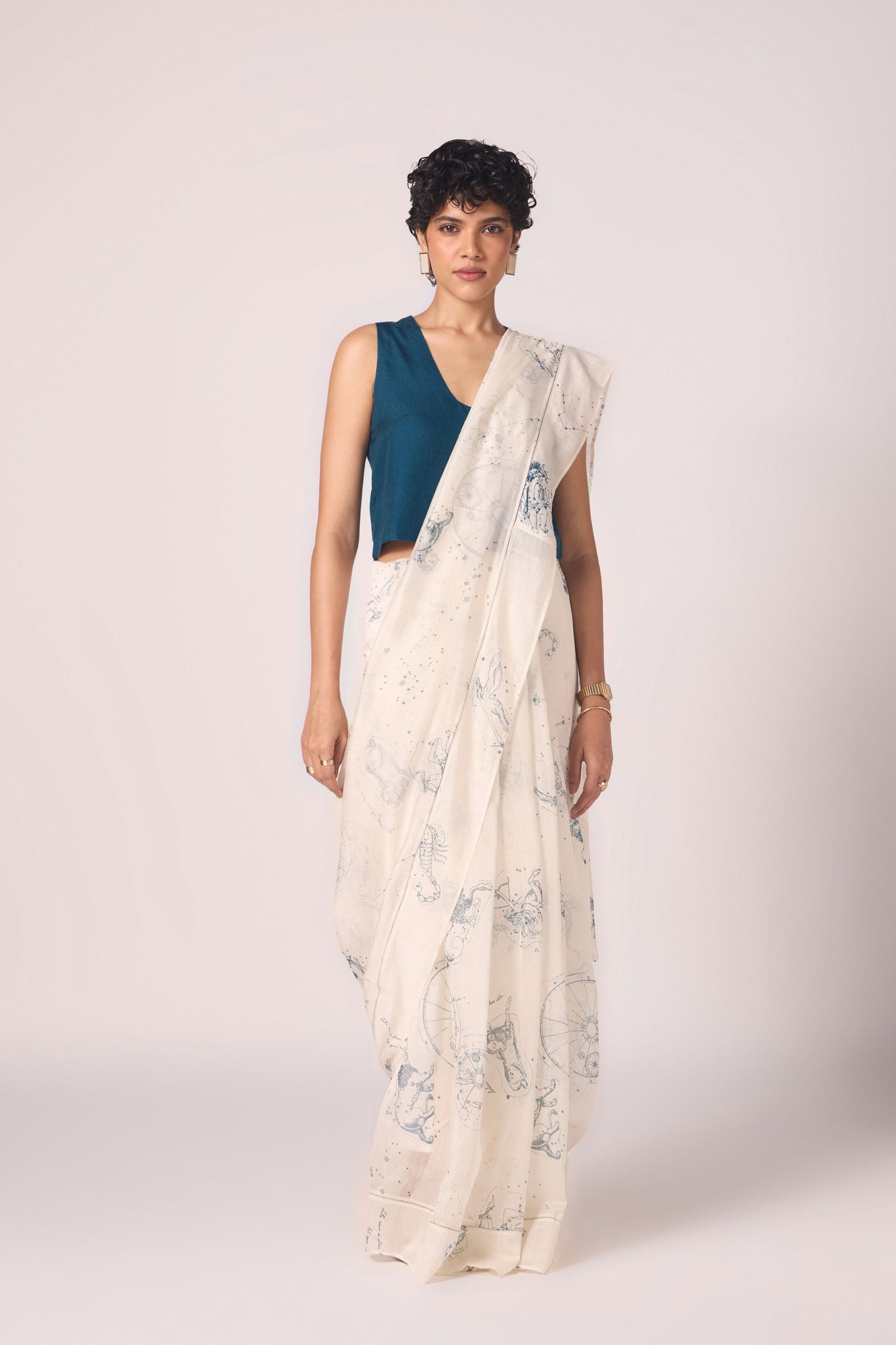 Pair with the Saiph saree for a modern festive mood — Altair’s deep blue silk anchors the saree’s celestial print with sculpted simplicity.
