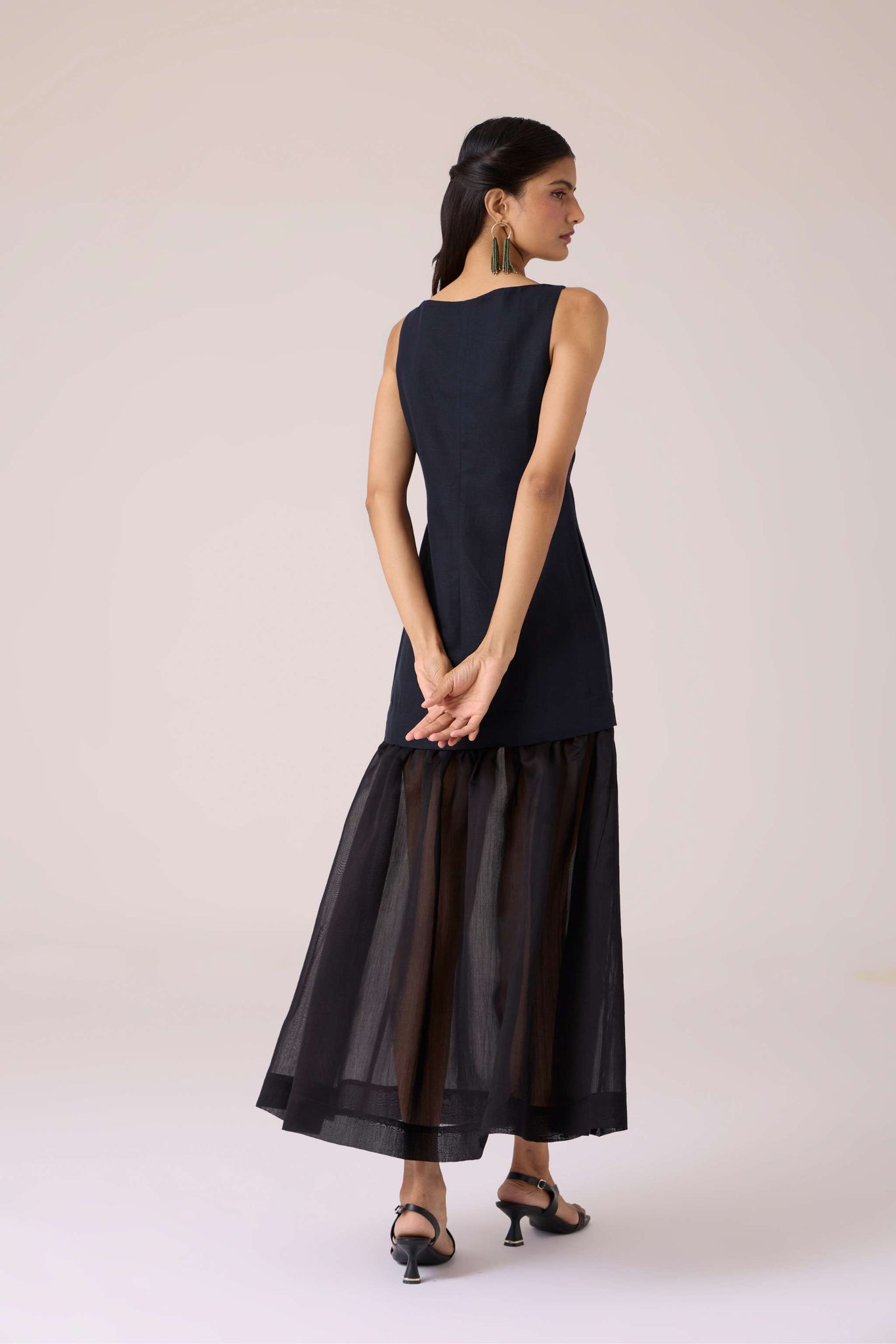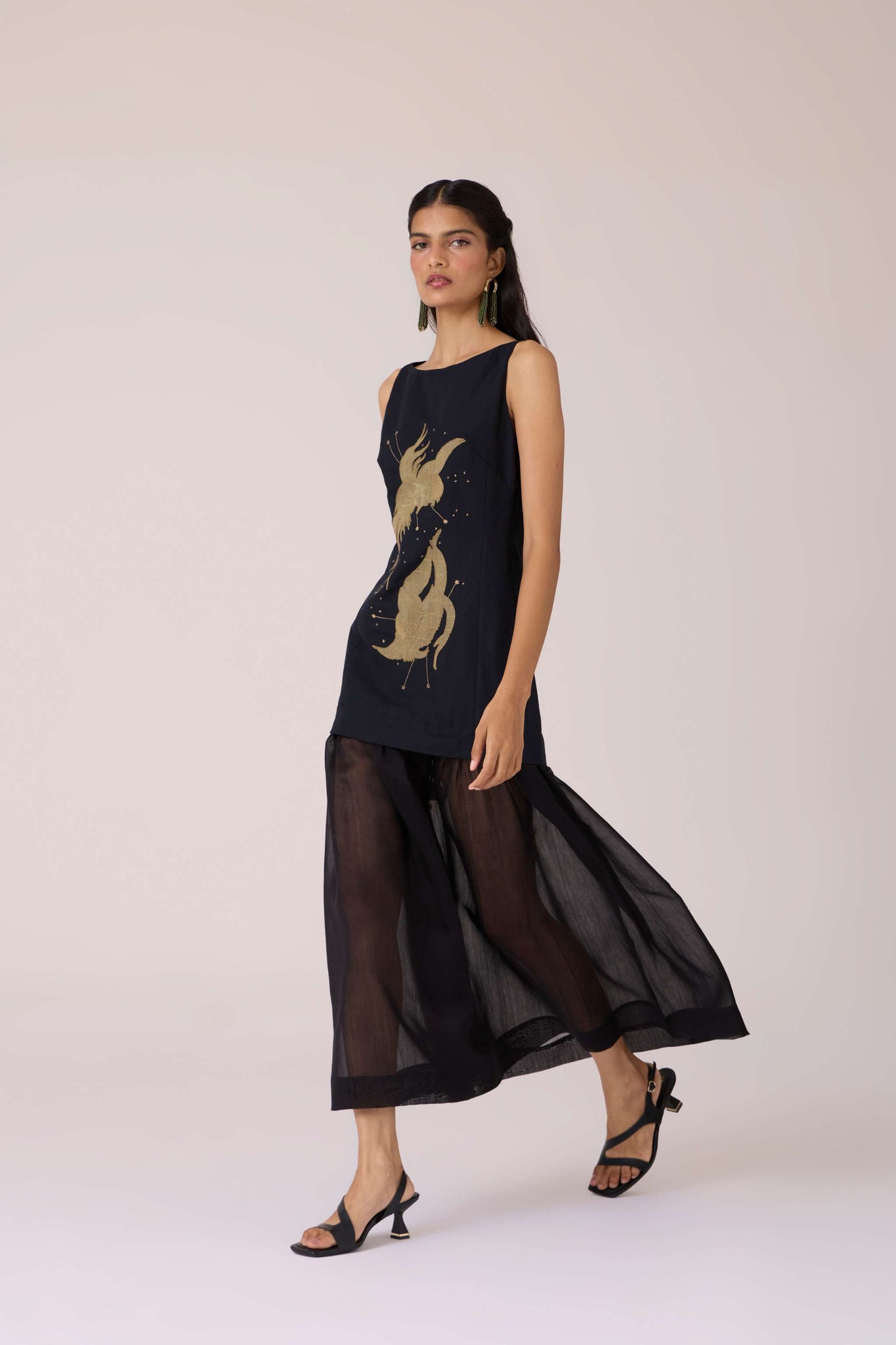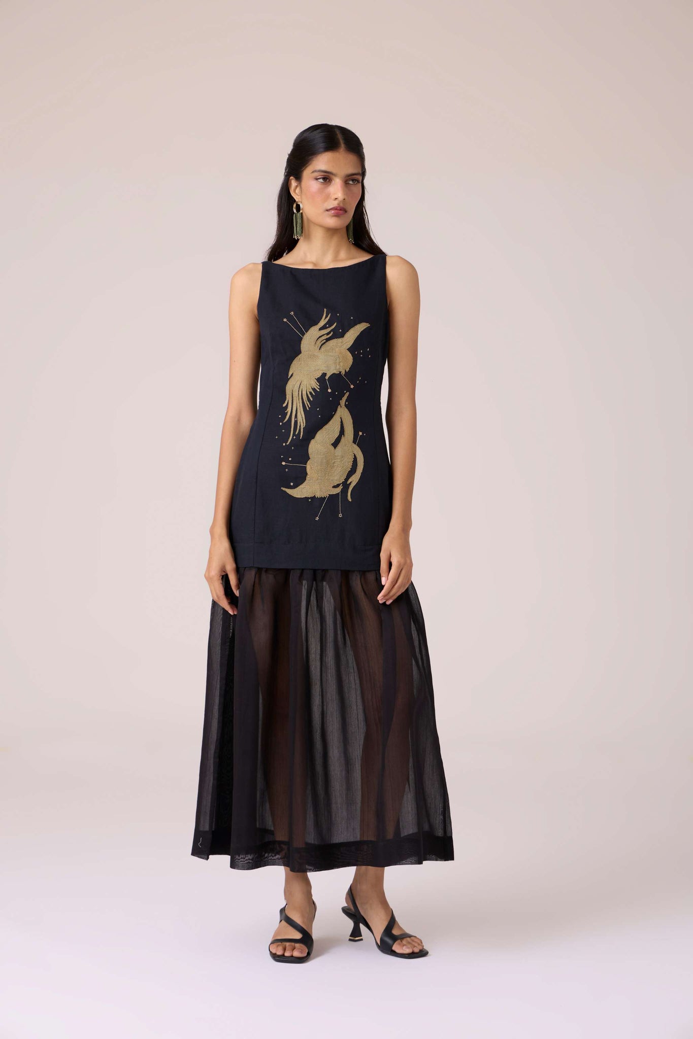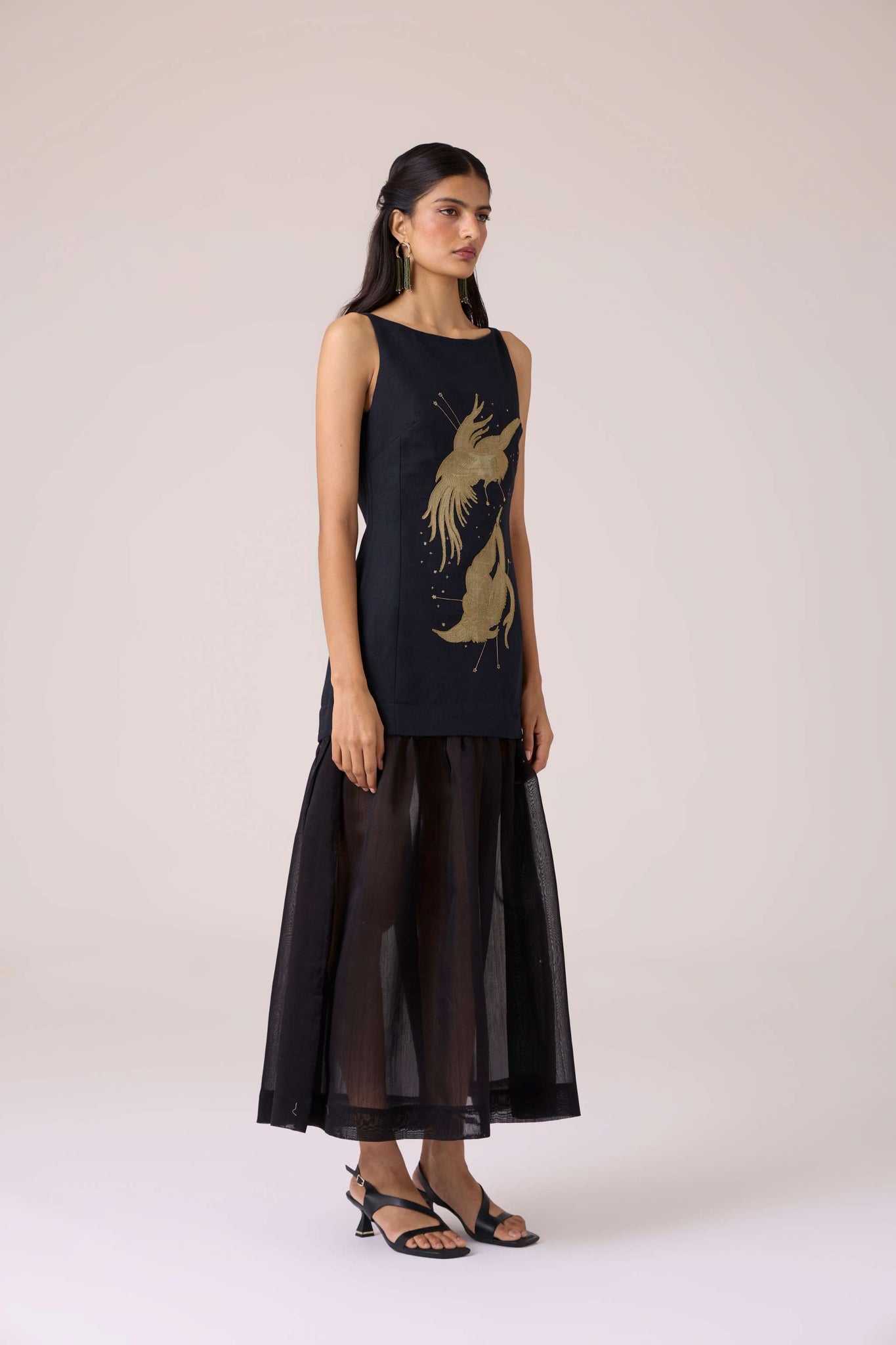 An interplay of opacity and light. A fitted embroidered bodice flows into a sheer pleated layer, creating dimension with every step.