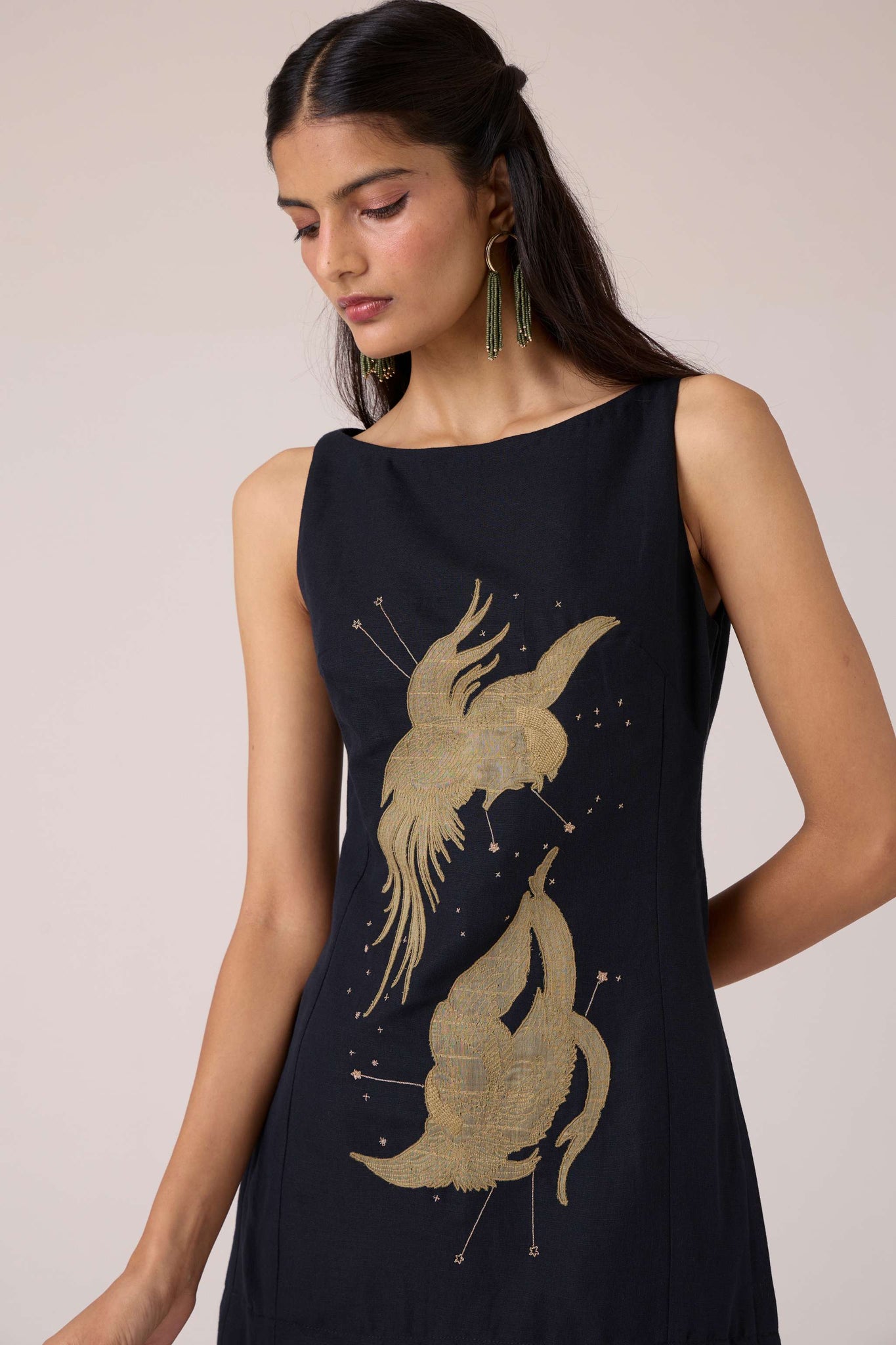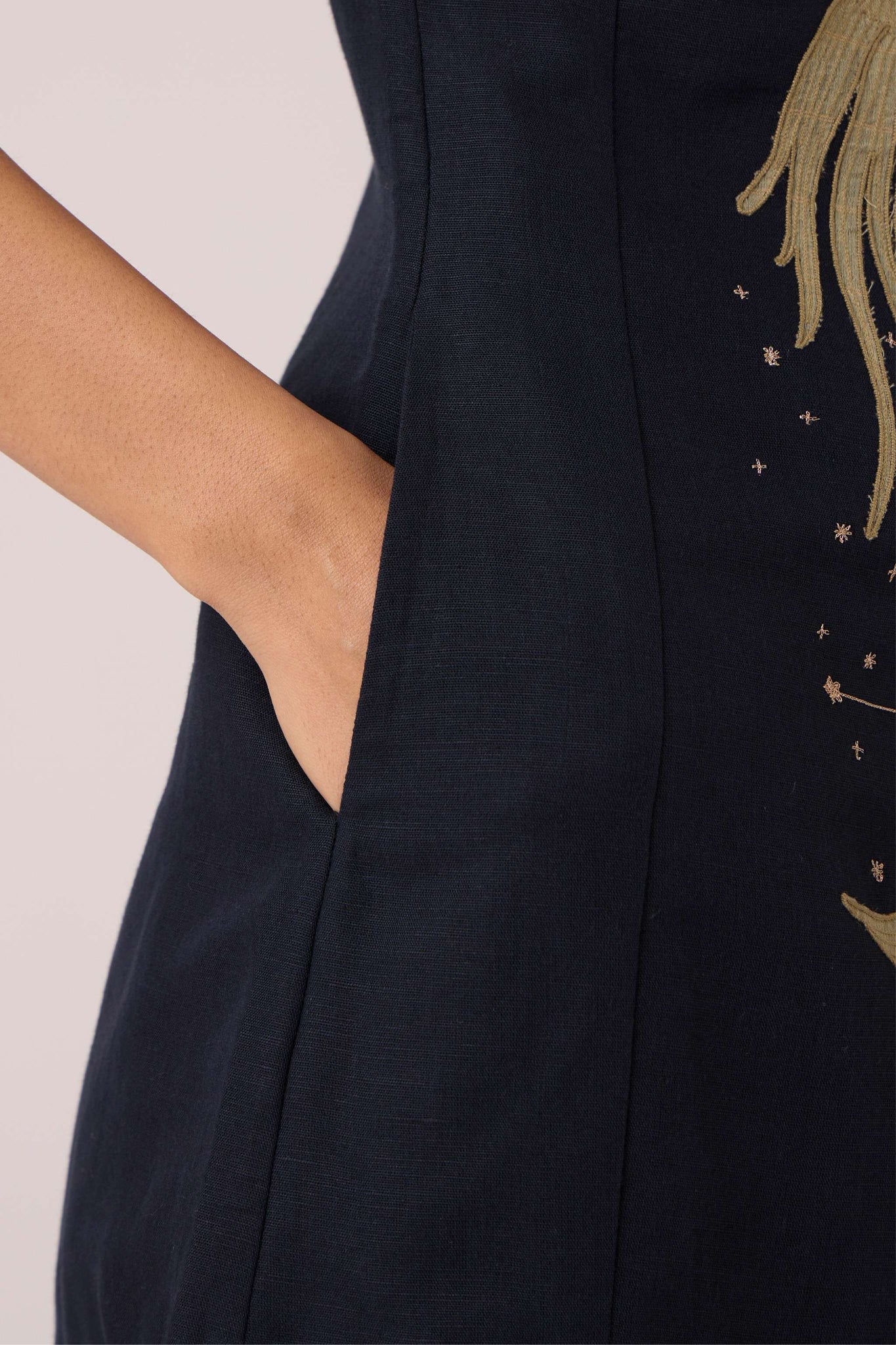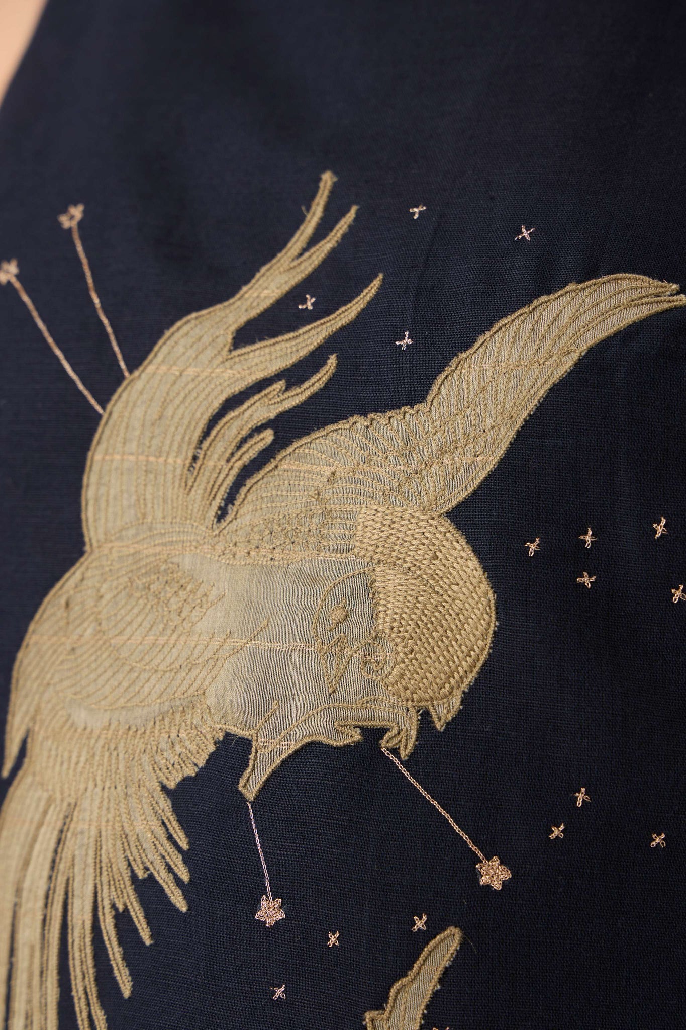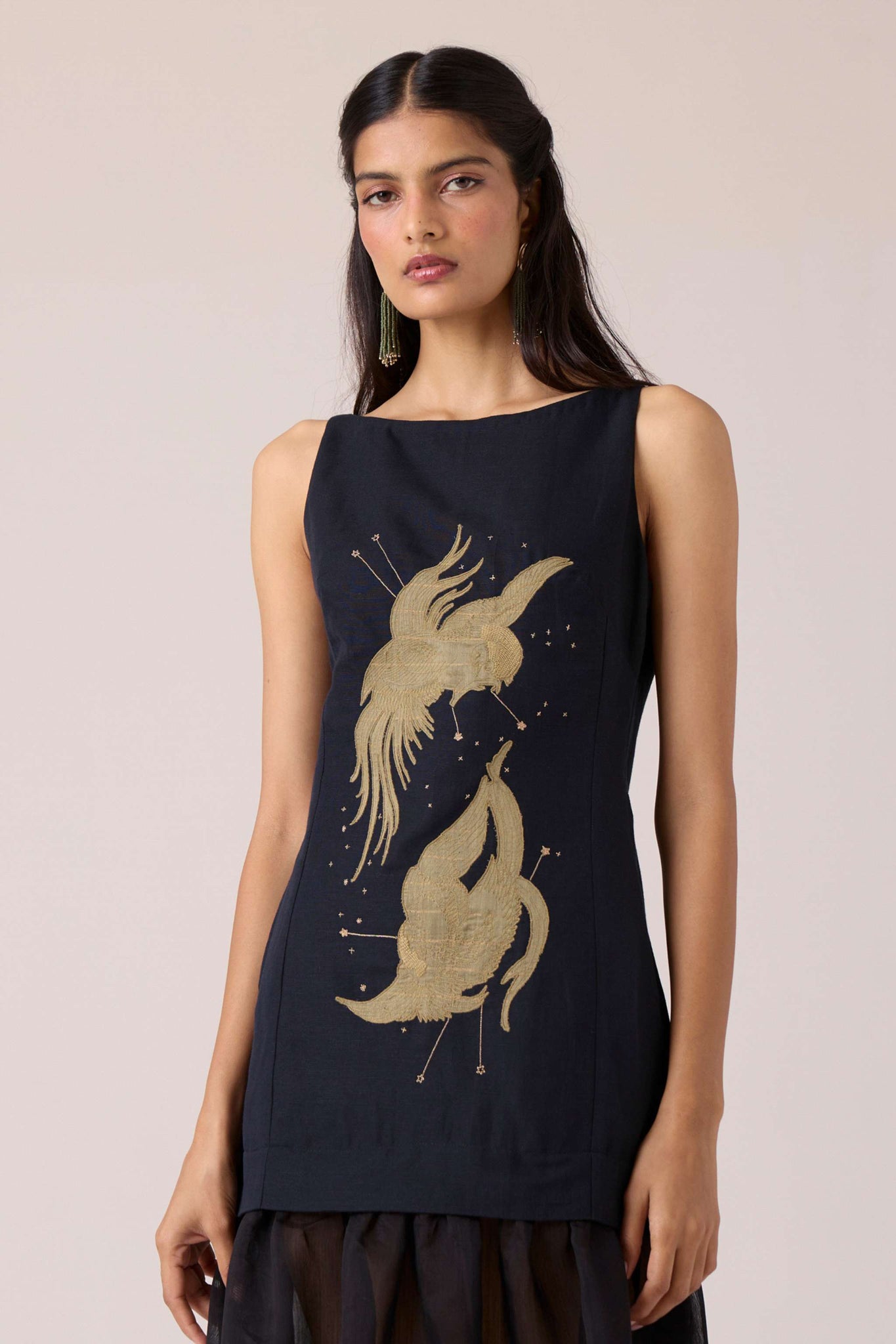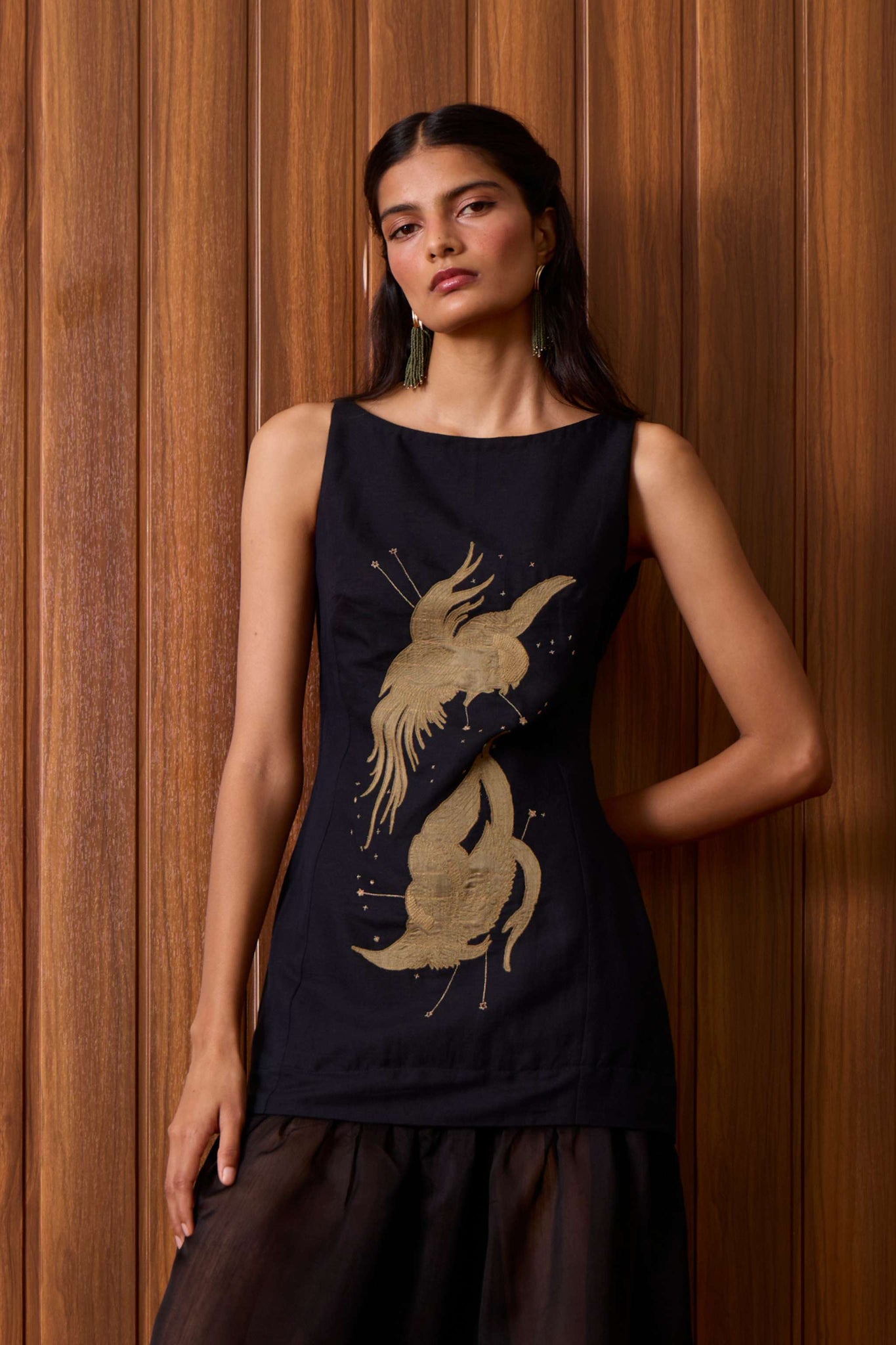 An interplay of opacity and light. A fitted embroidered bodice flows into a sheer pleated layer, creating dimension with every step.