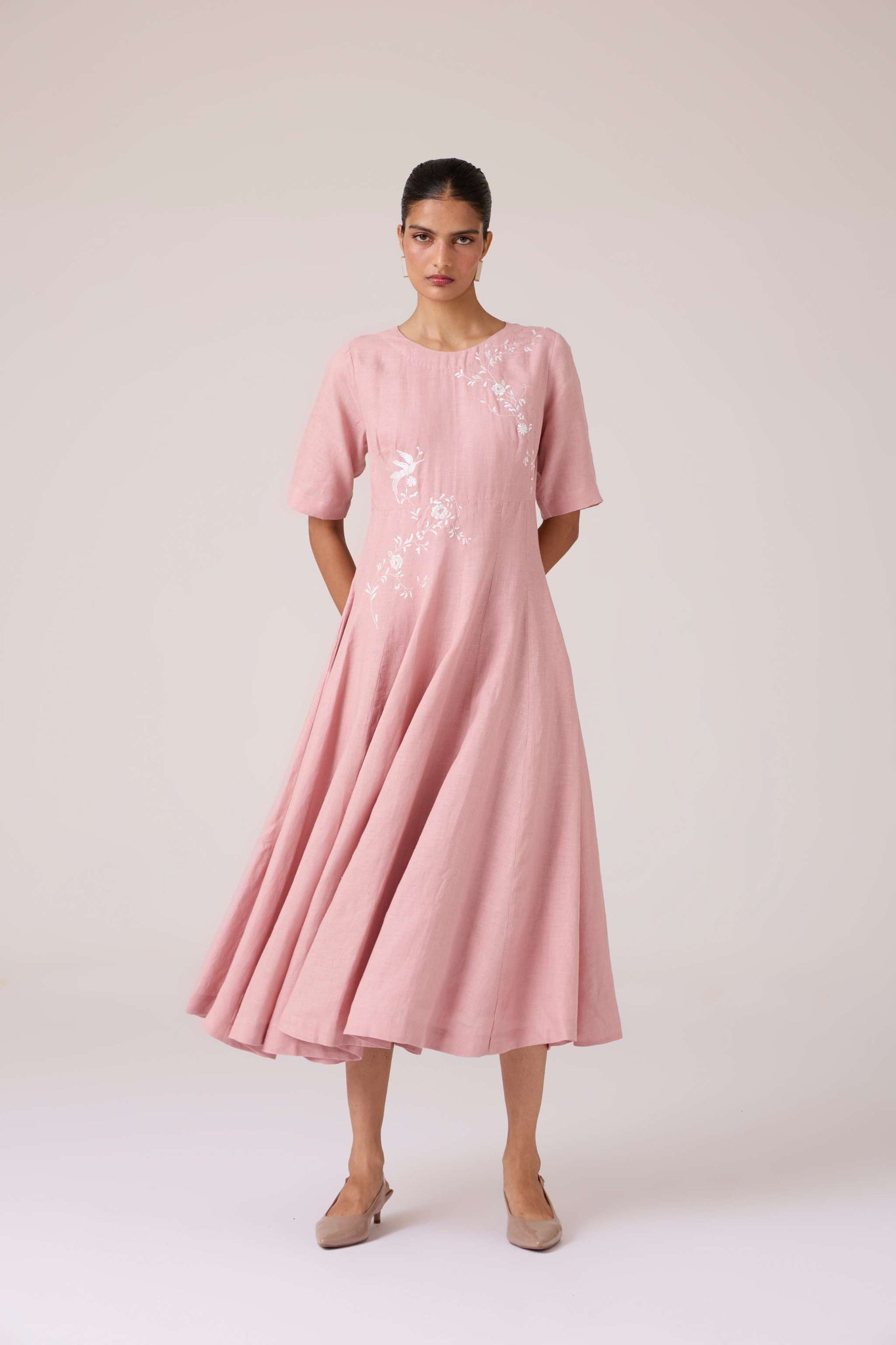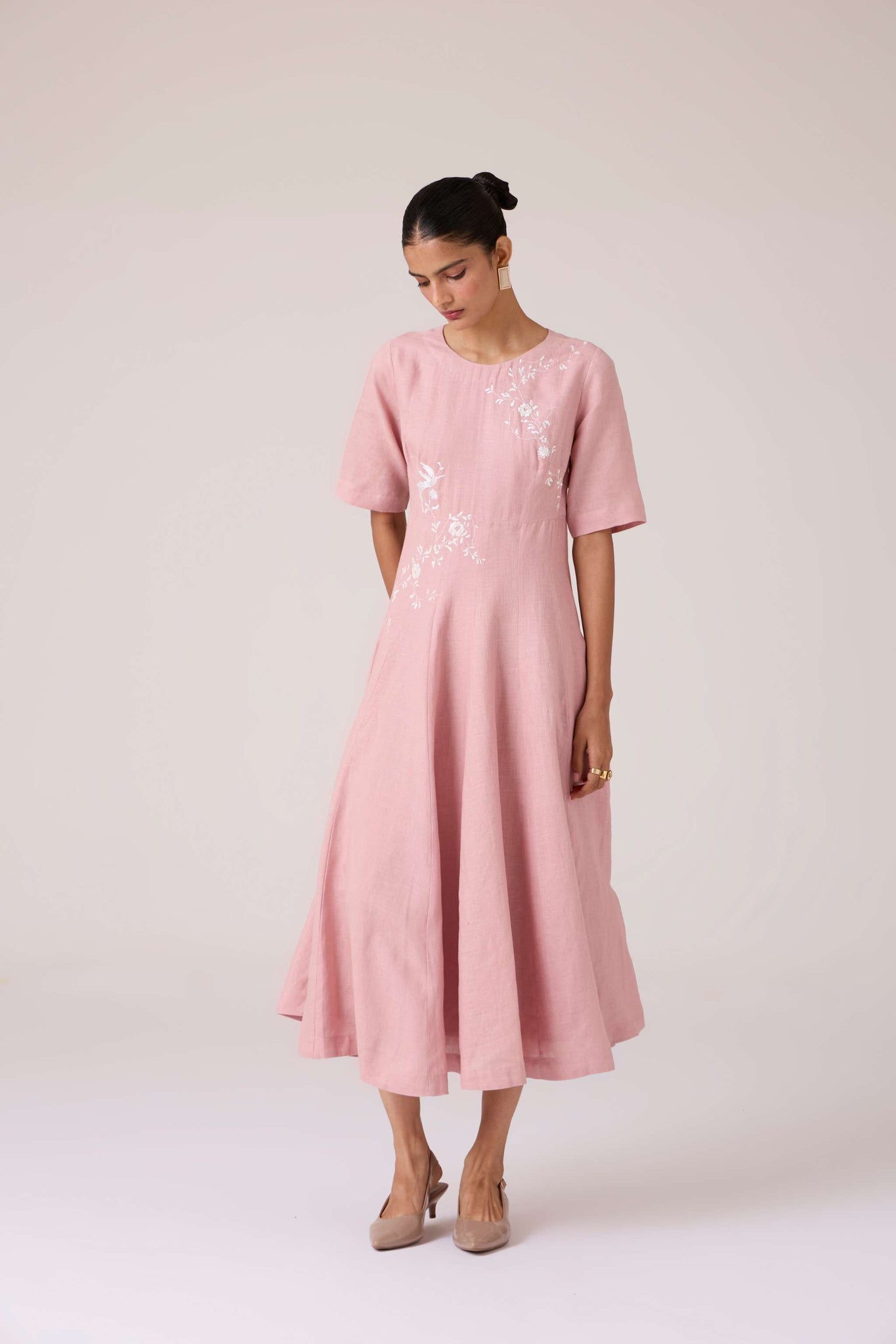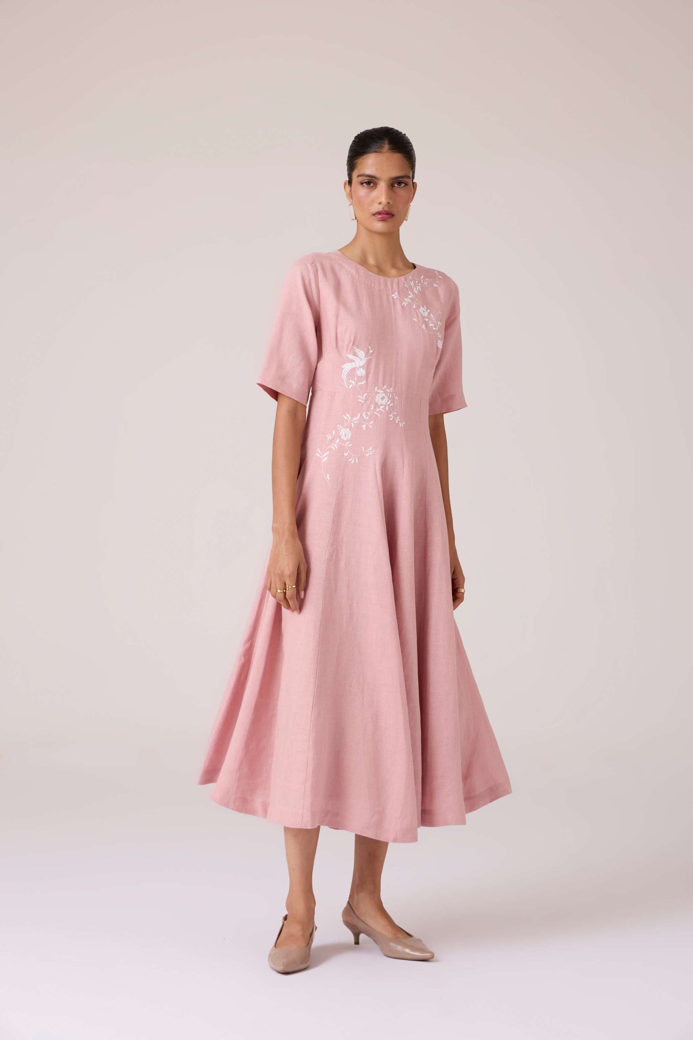Embroidery lends quiet punctuation to structure. A close neckline, fitted waist, and balanced flare carry the dress with composed elegance.