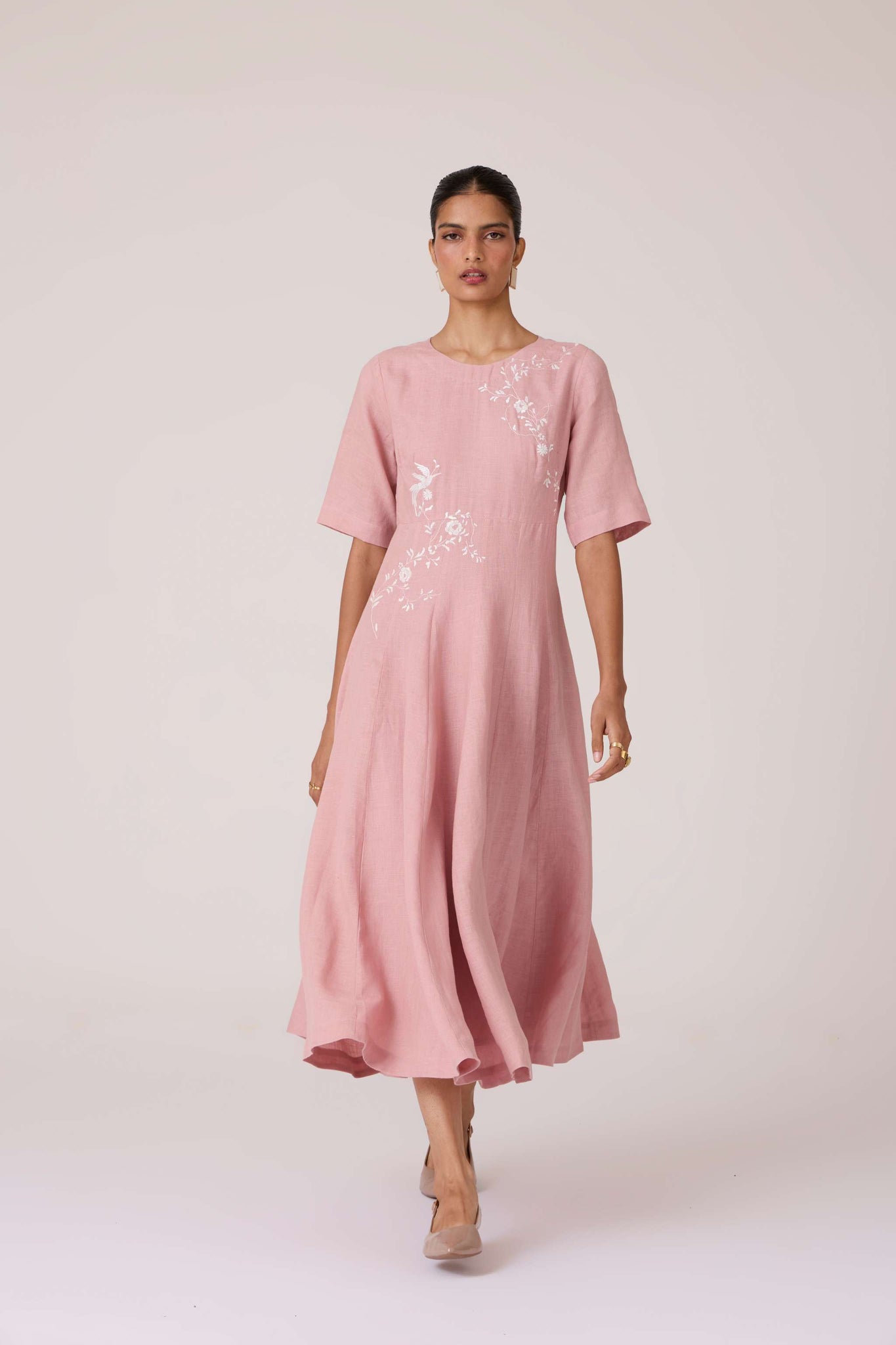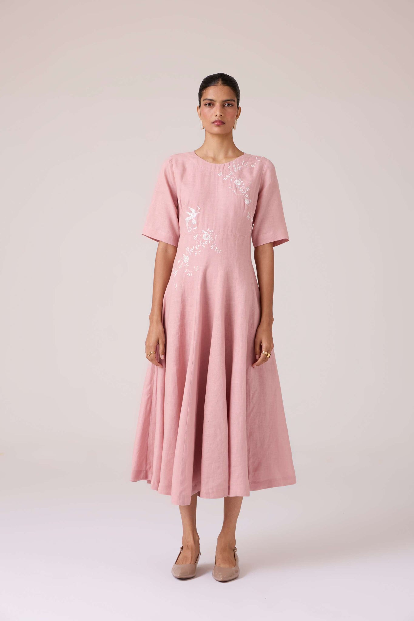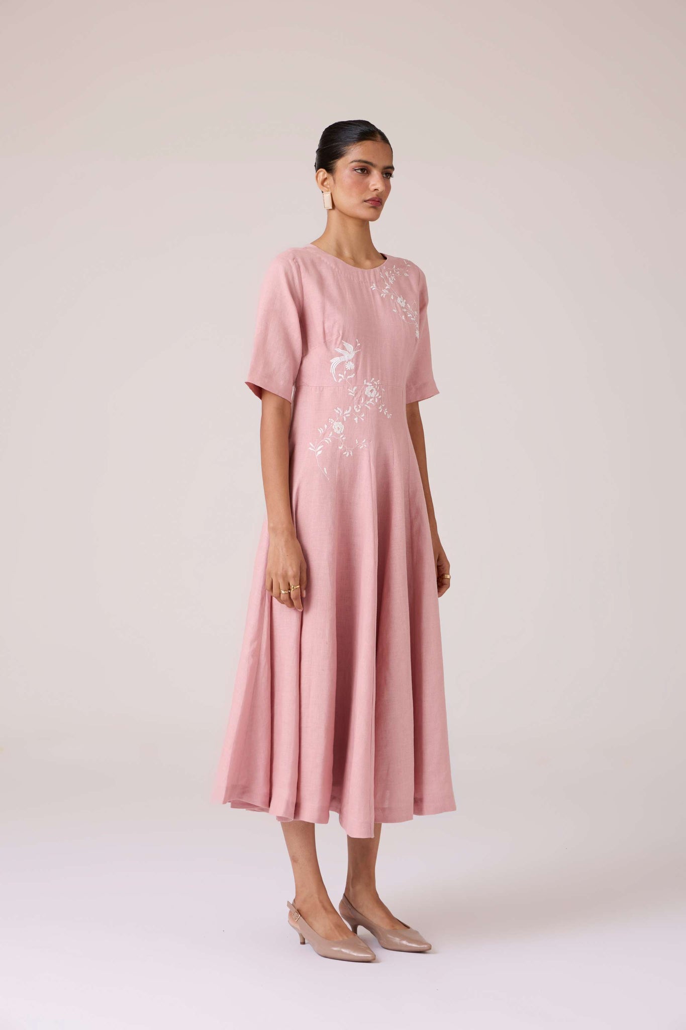 Embroidery lends quiet punctuation to structure. A close neckline, fitted waist, and balanced flare carry the dress with composed elegance.
