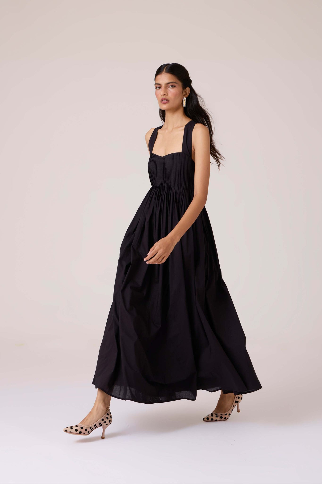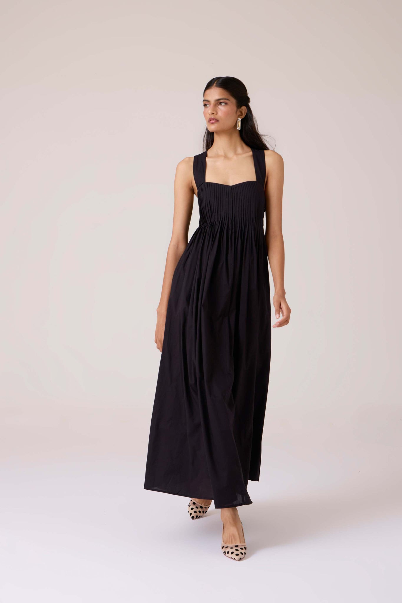 Pleats release into volume, guided from a sharp neckline. A dress that begins in order and dissolves into movement.
