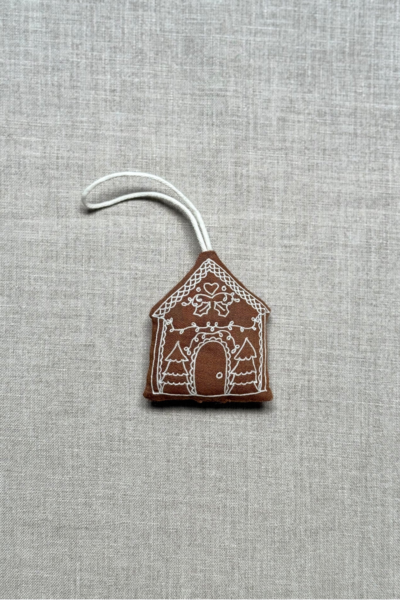 This gingerbread house ornament, adorned with delicate hand embroidery, is a timeless addition to your holiday tree.