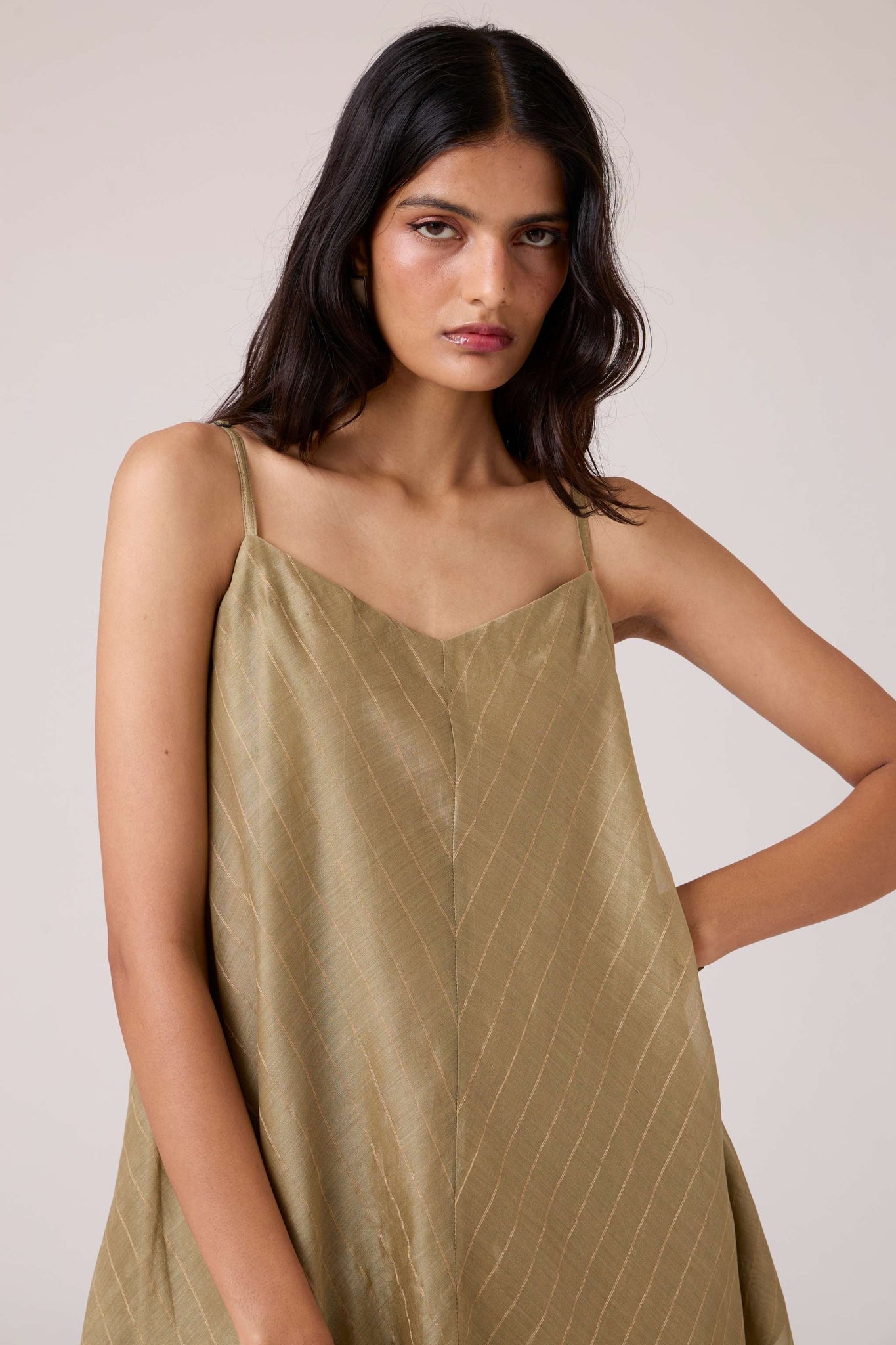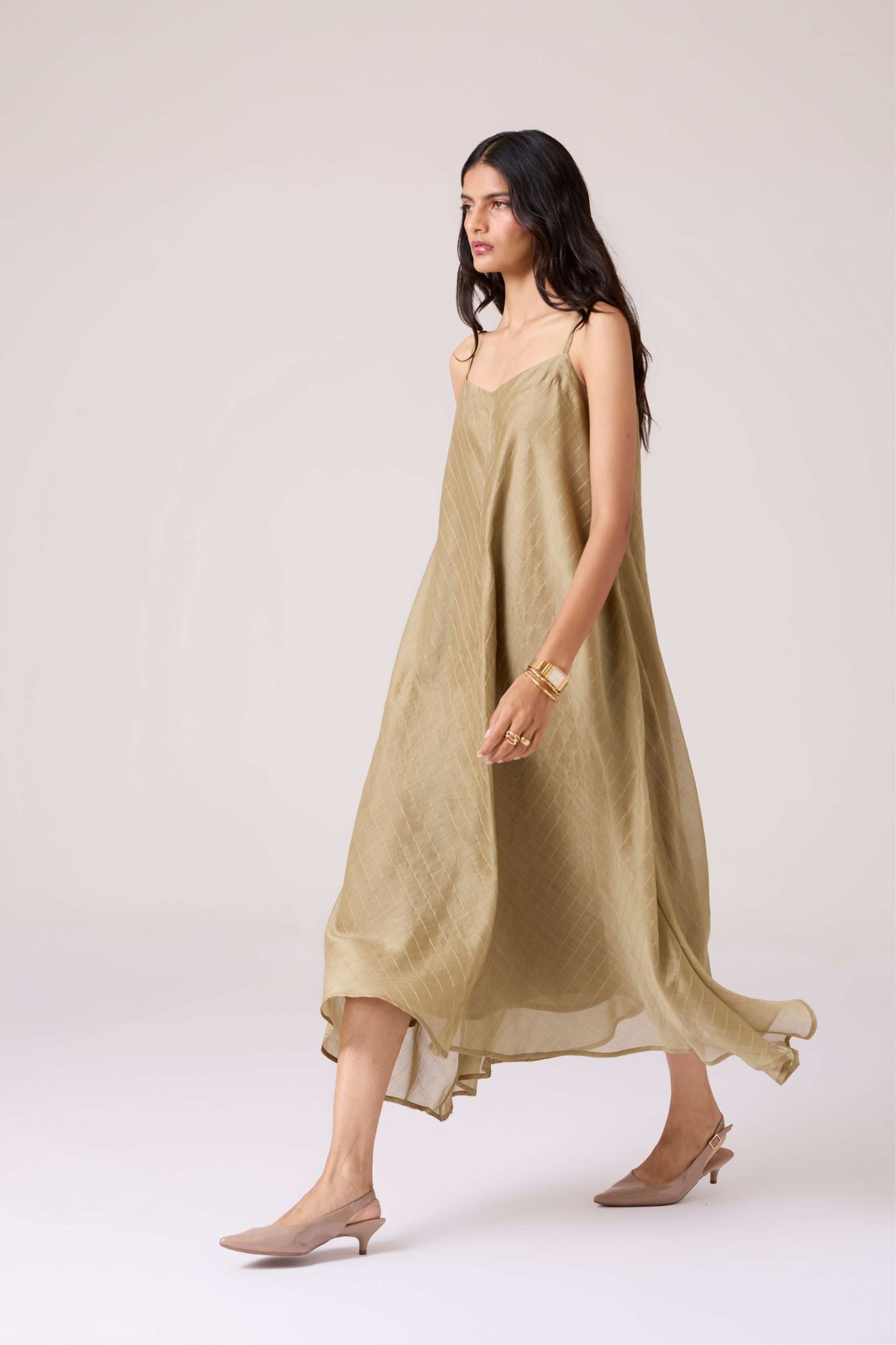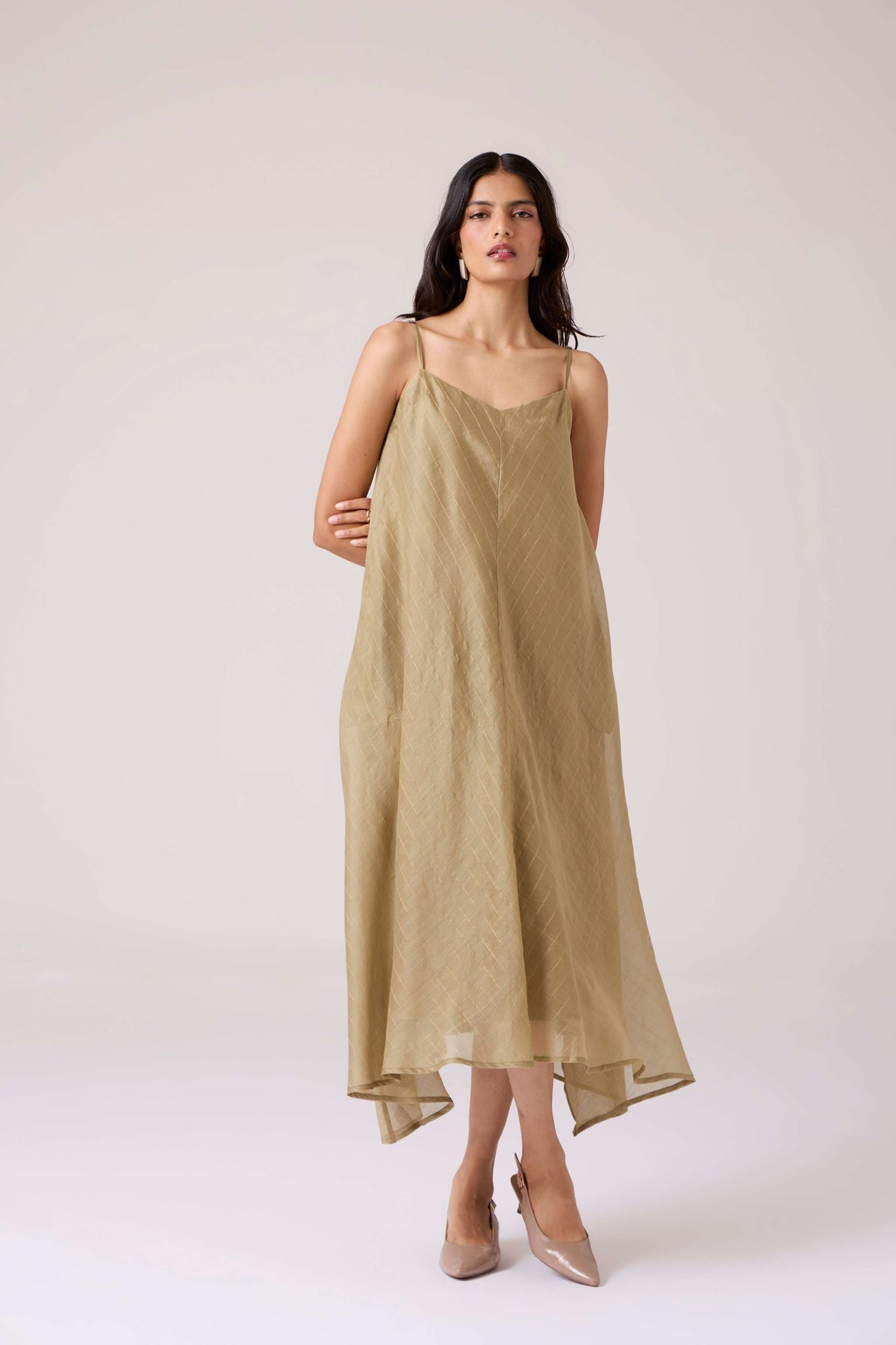 An easy sweep of fabric, cut with a handkerchief hem. Adjustable straps temper the flow with precision.
