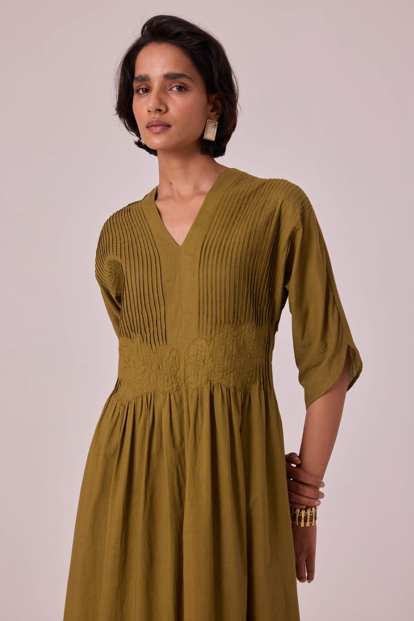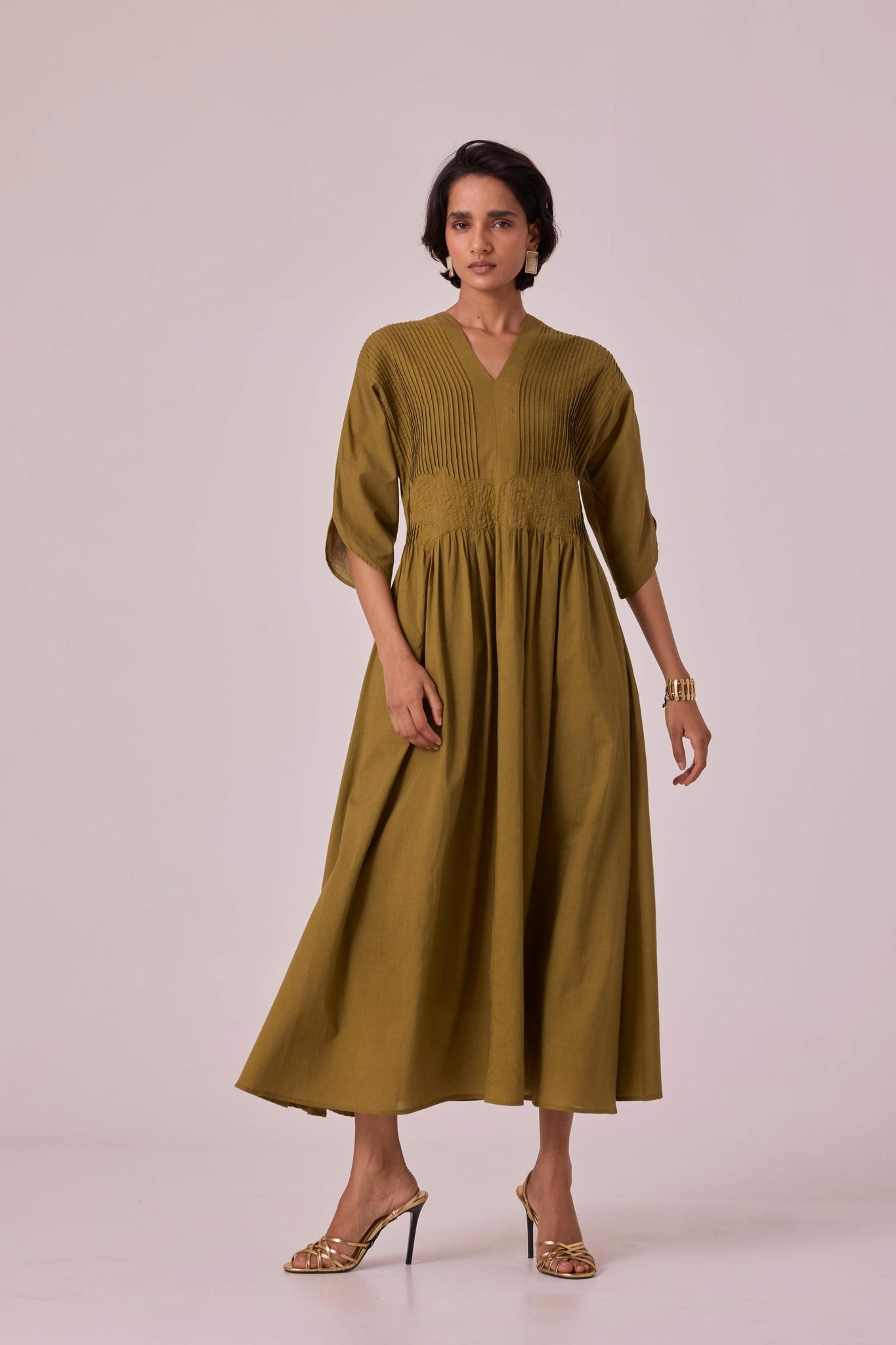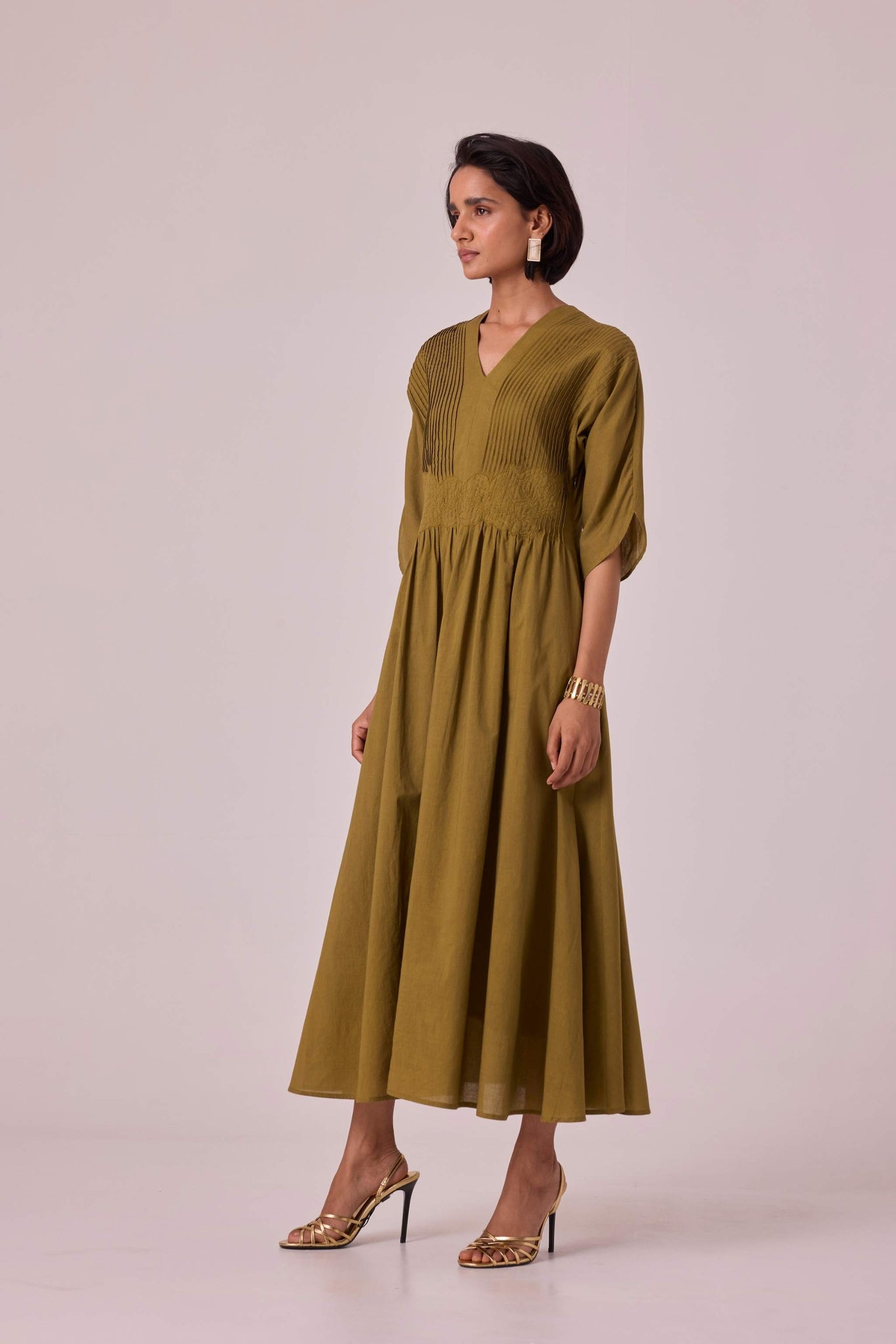 Understated elegance. V-neck with pintuck and embroidery detail. Drop sleeves. In-seam pockets. This dress is shipped with a slip.
