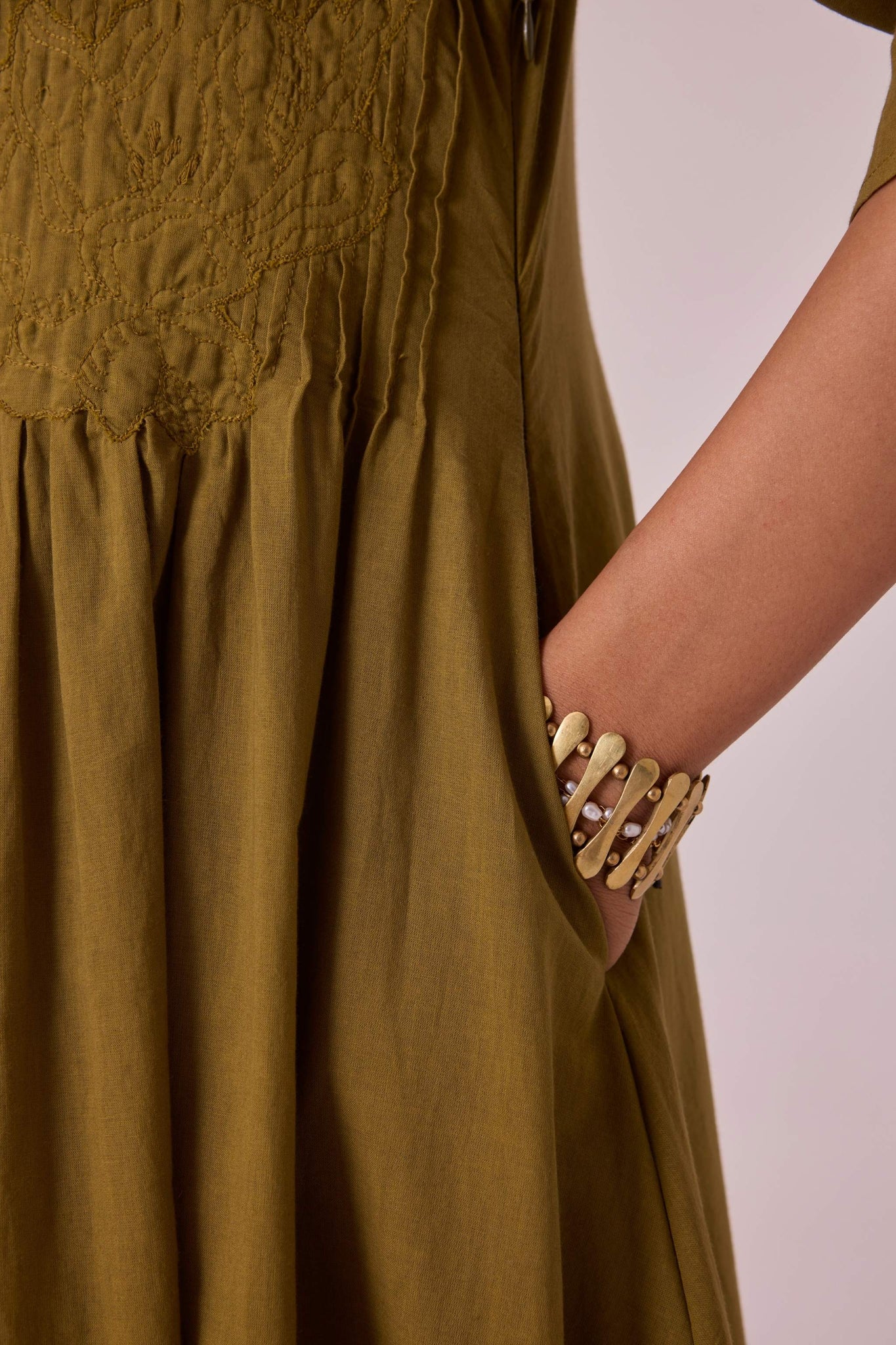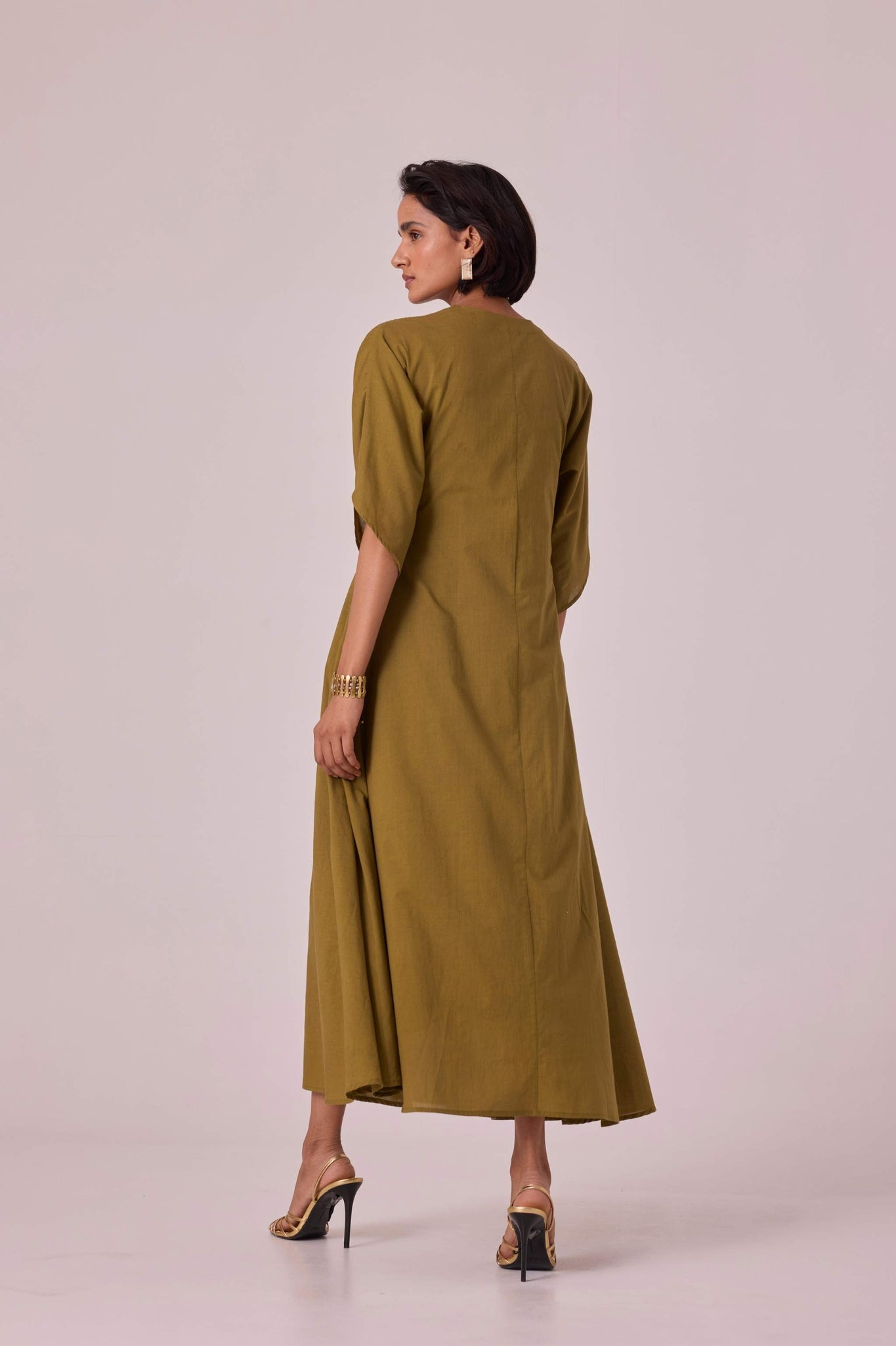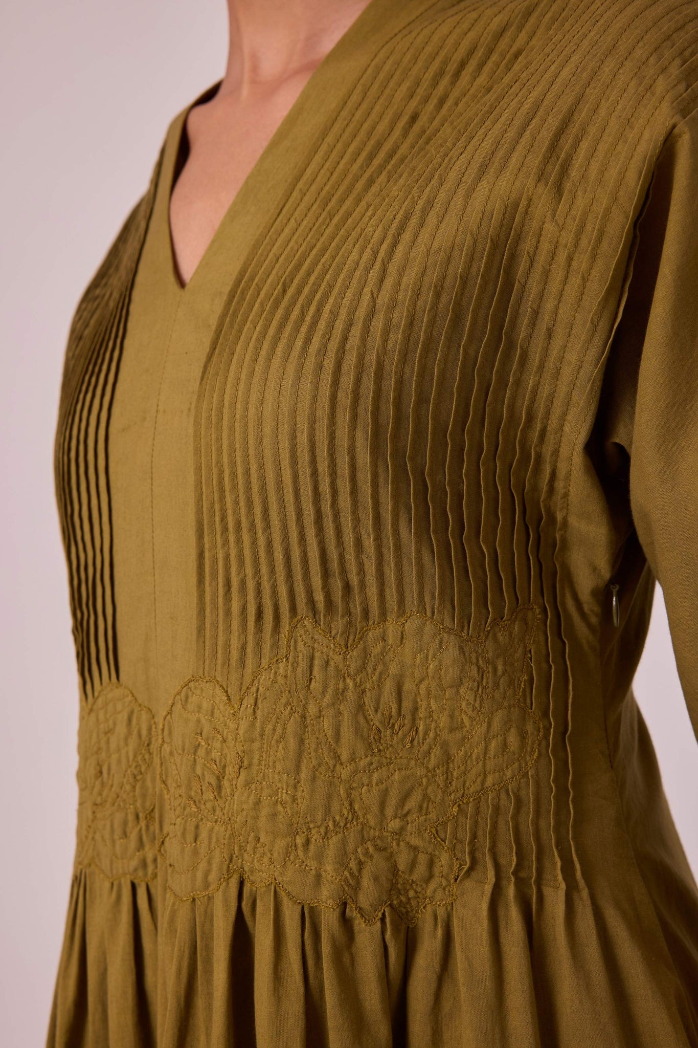 Understated elegance. V-neck with pintuck and embroidery detail. Drop sleeves. In-seam pockets. This dress is shipped with a slip.