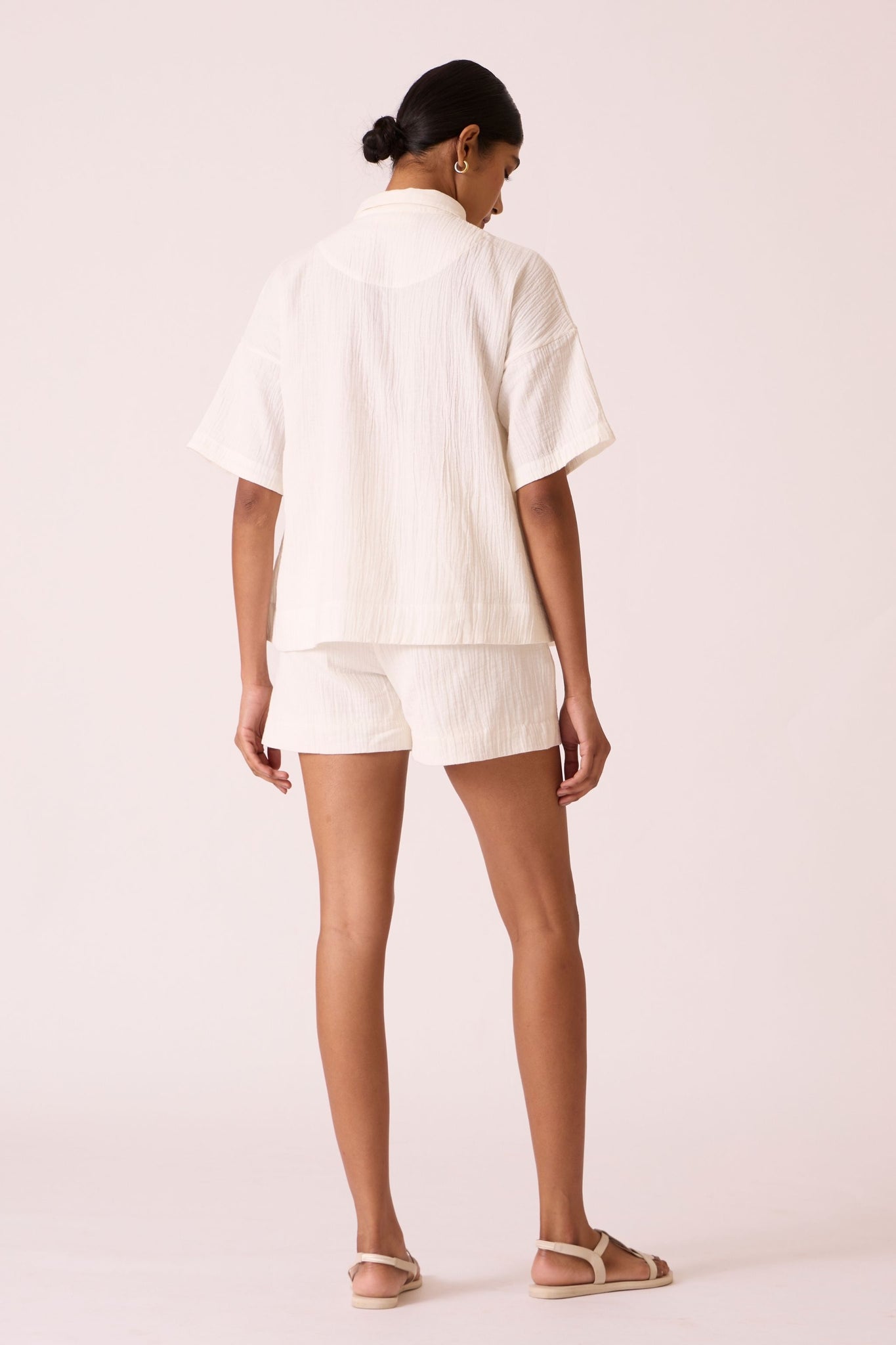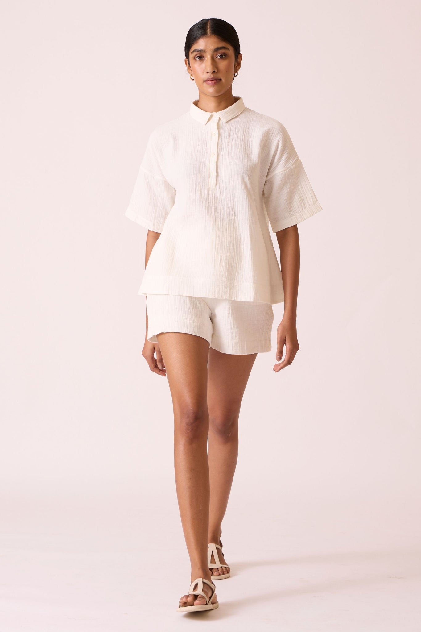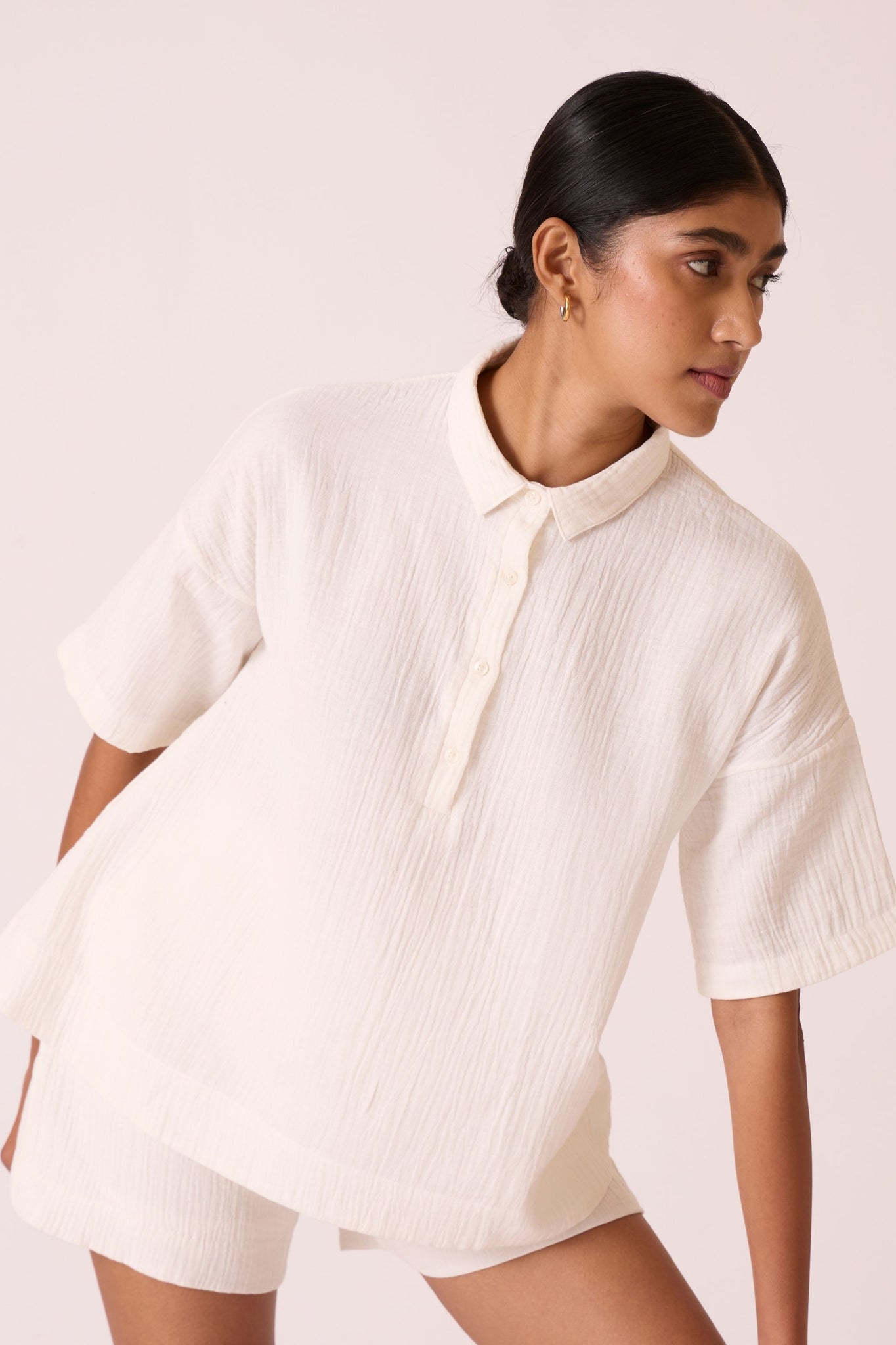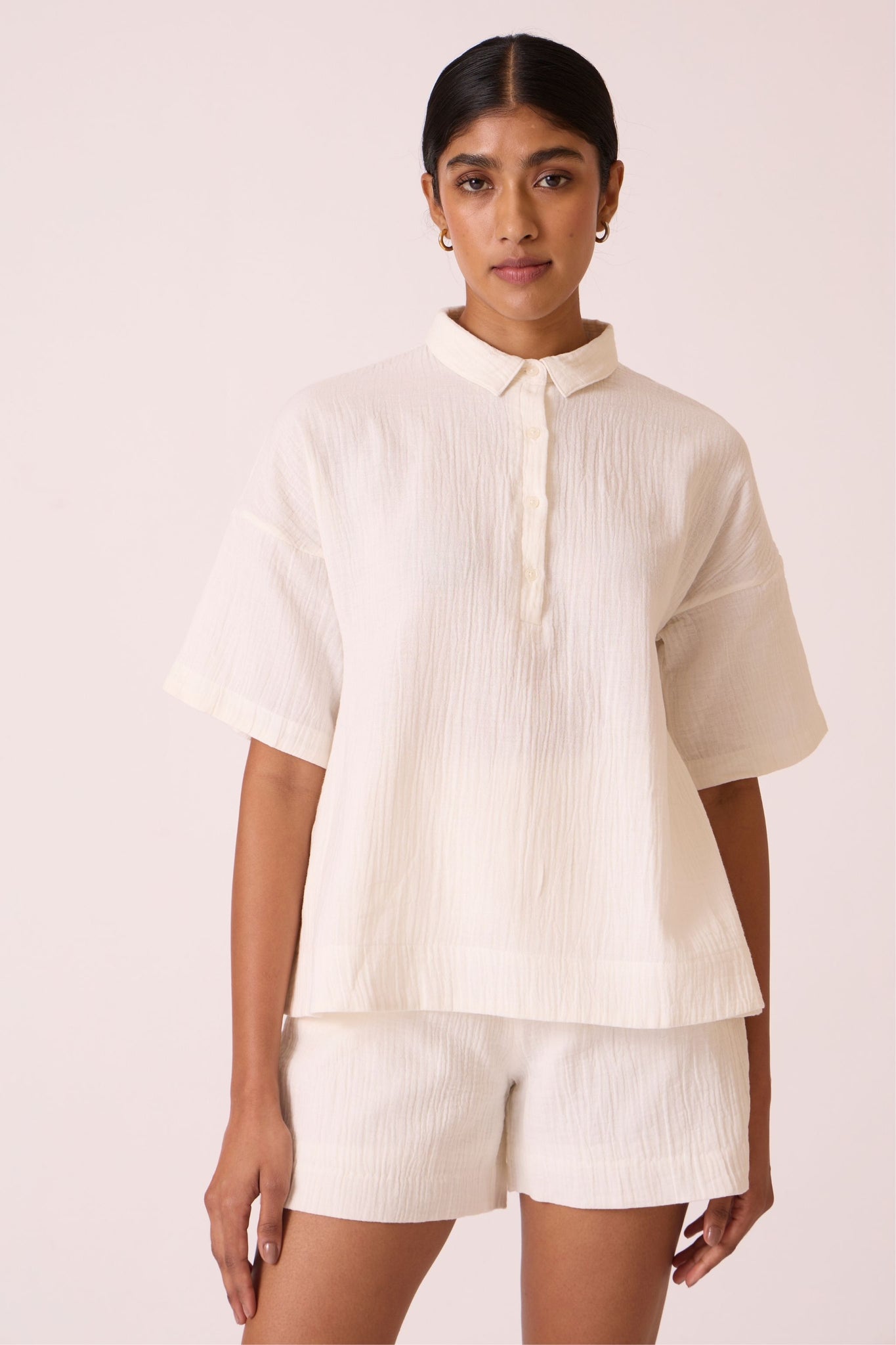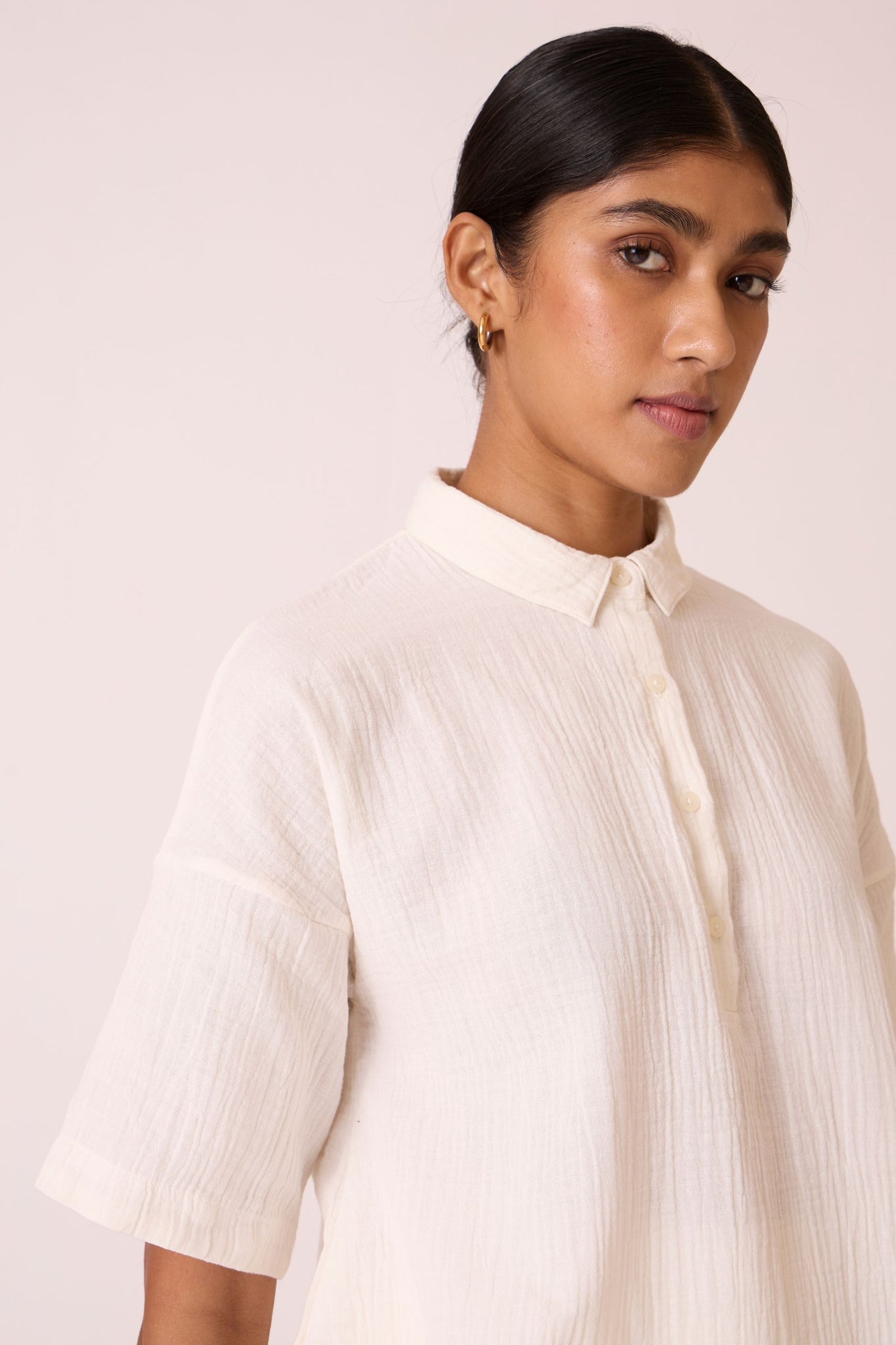 A relaxed-fit top with drop-down shoulders and summer sleeves made from crinkle cotton.