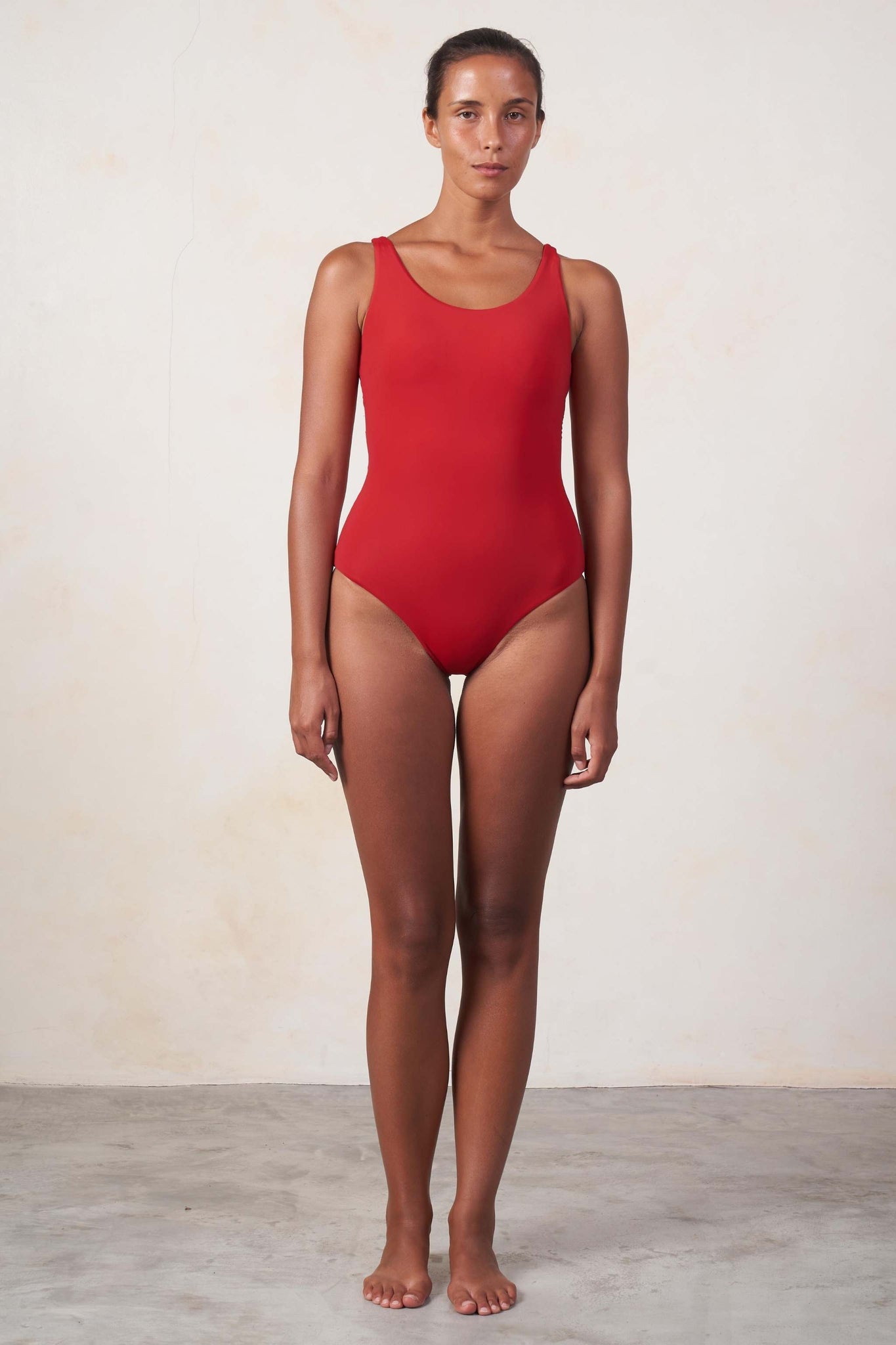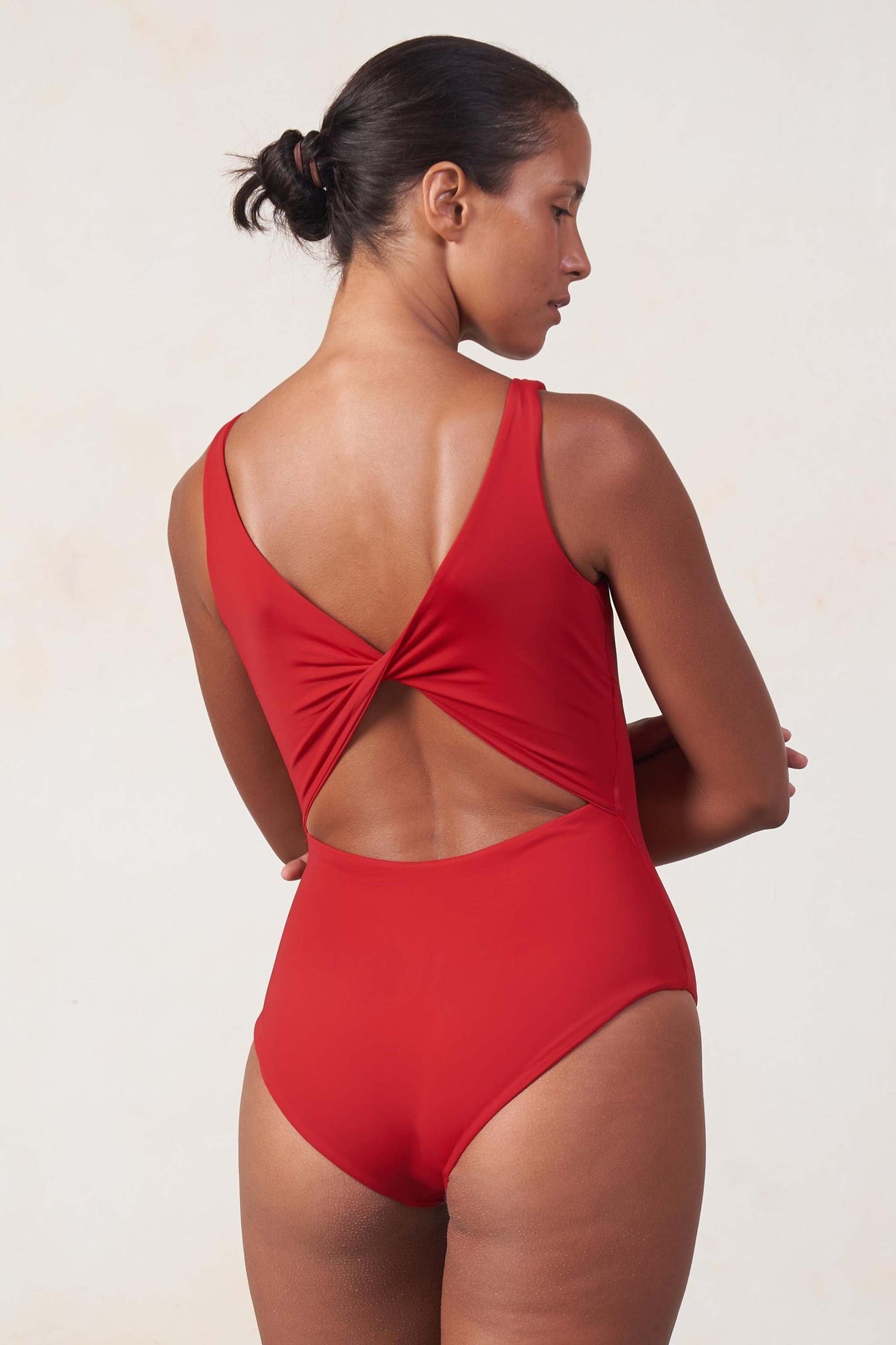 Scoop neck swimsuit with a twisted back detail. Removable padding.
