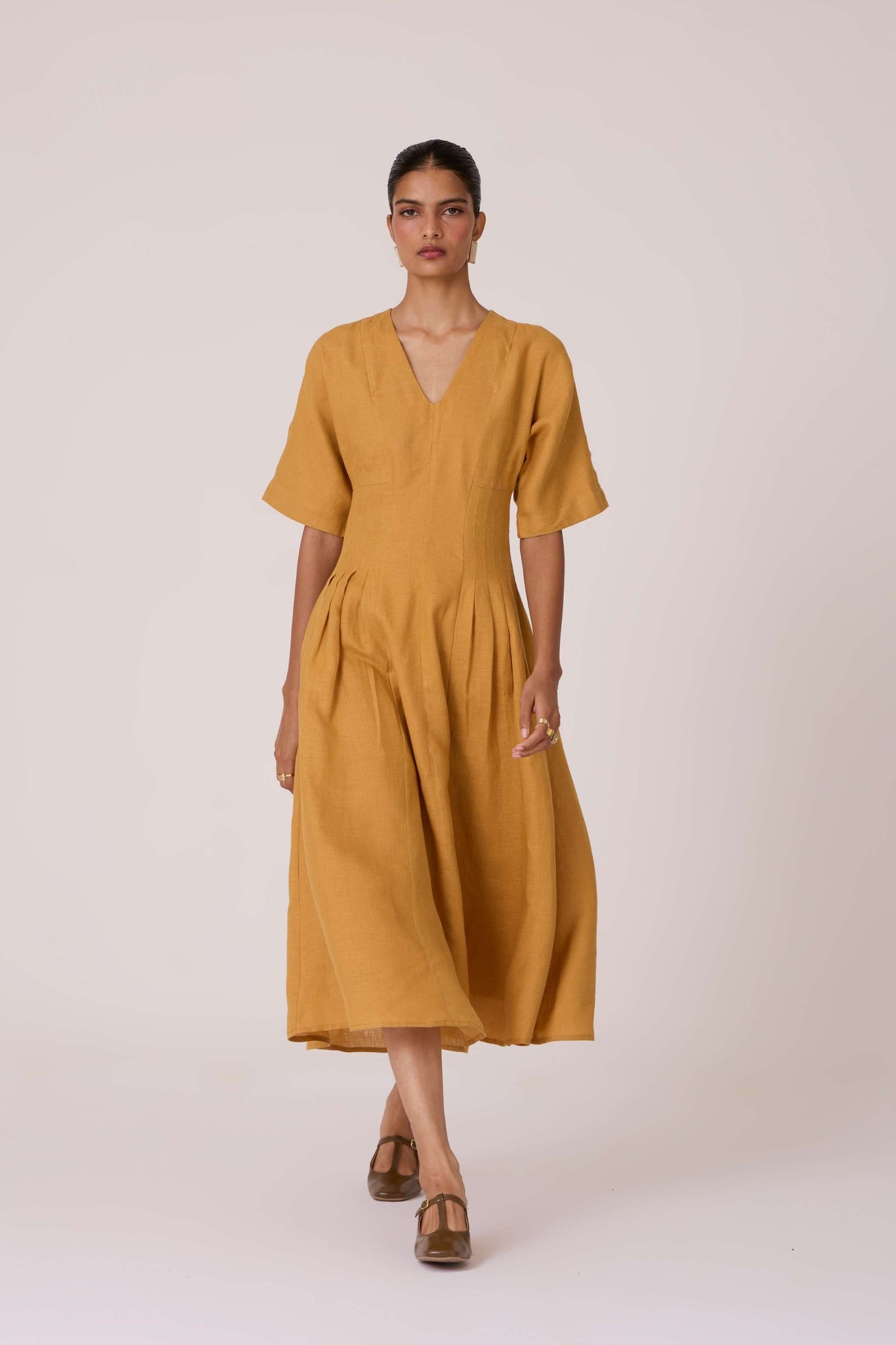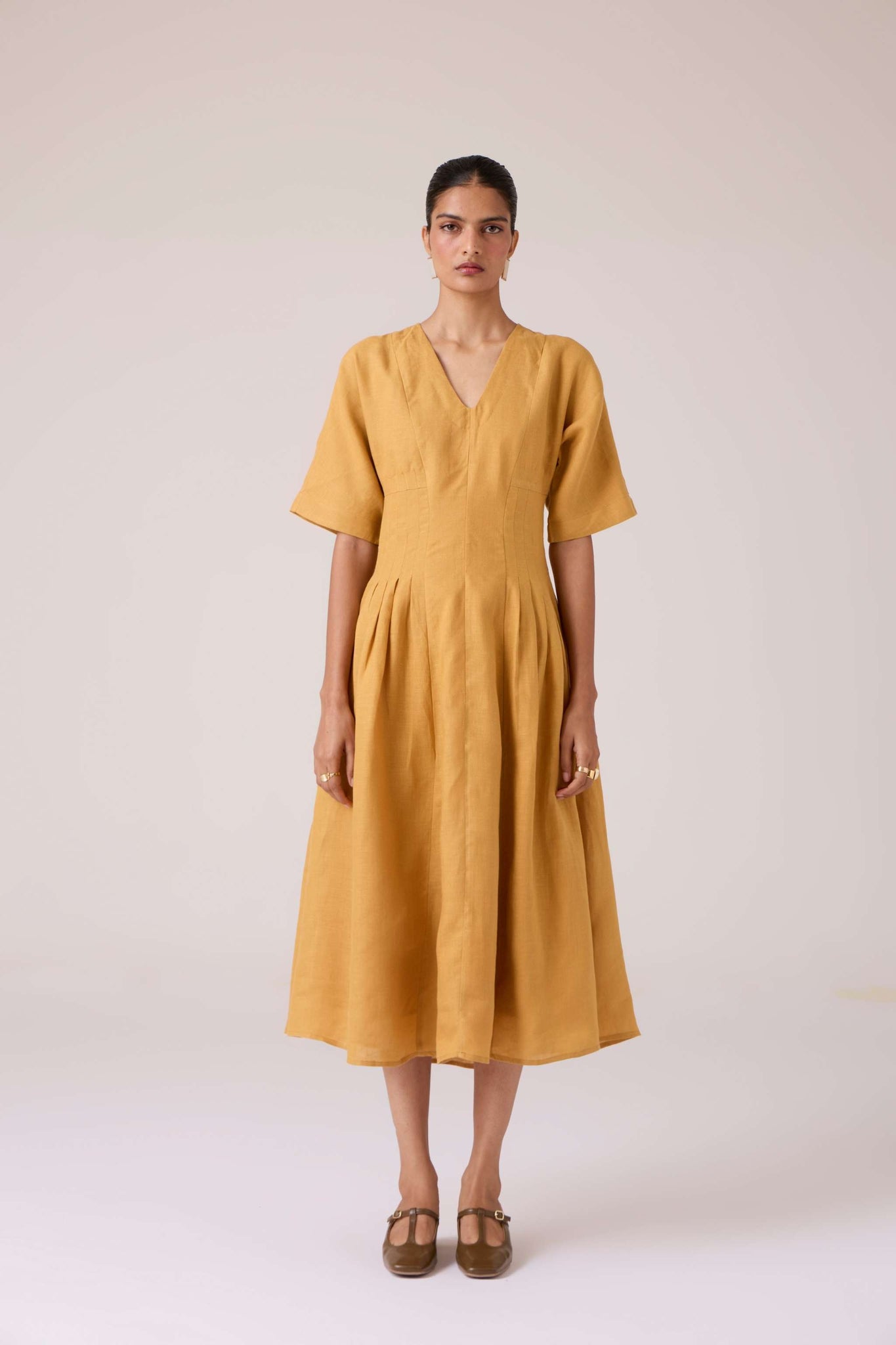A dress that shapes itself to movement. The scoop neckline and pleated panels draw the waist in, while a generous flare opens with each step.