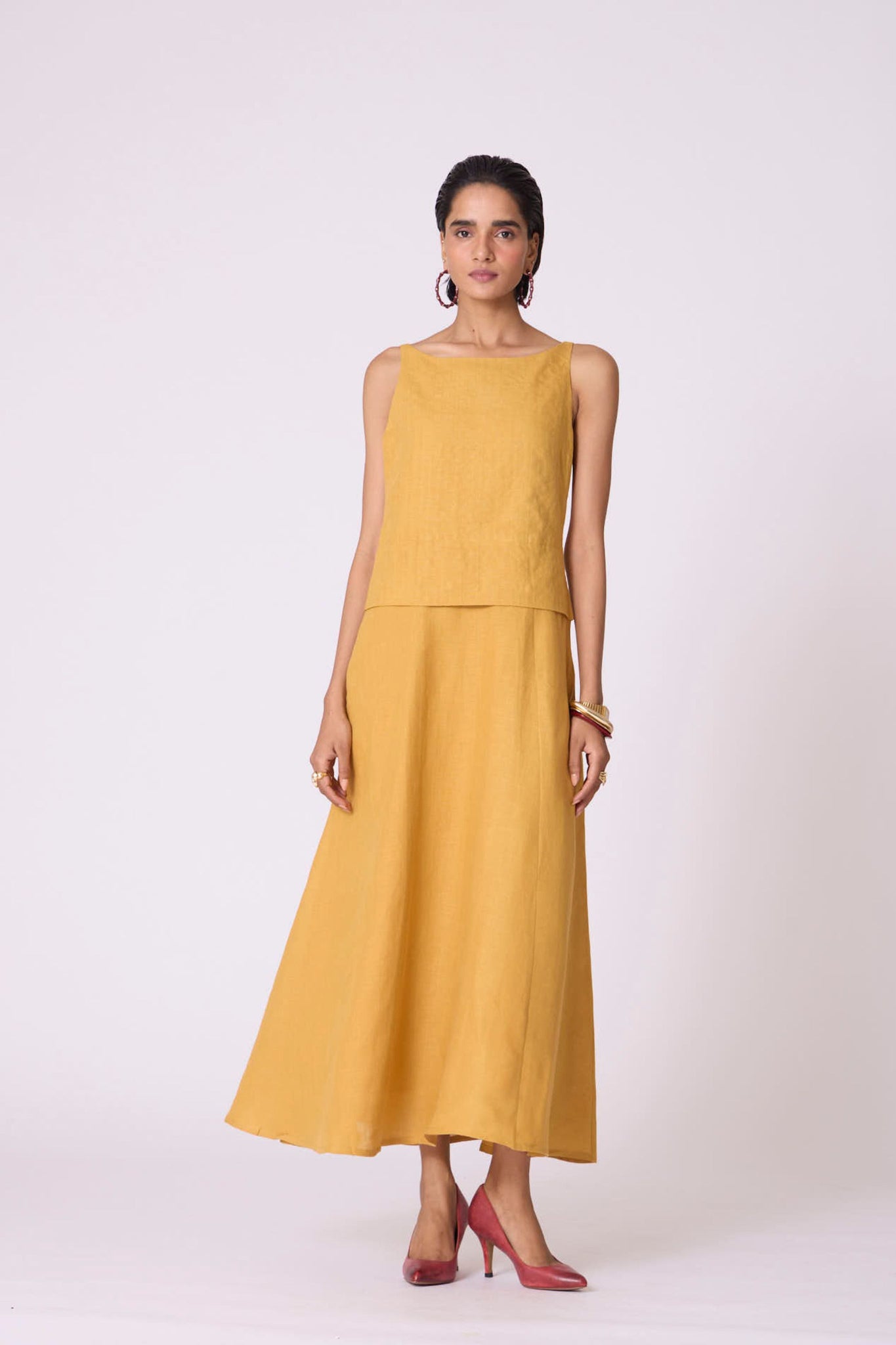 A quietly structured silhouette defined by a finely quilted low-waist yoke, the Senaka dress brings subtle dimension to linen. Its panelled hem and clean sleeveless form create an assured balance of lightness and shape.