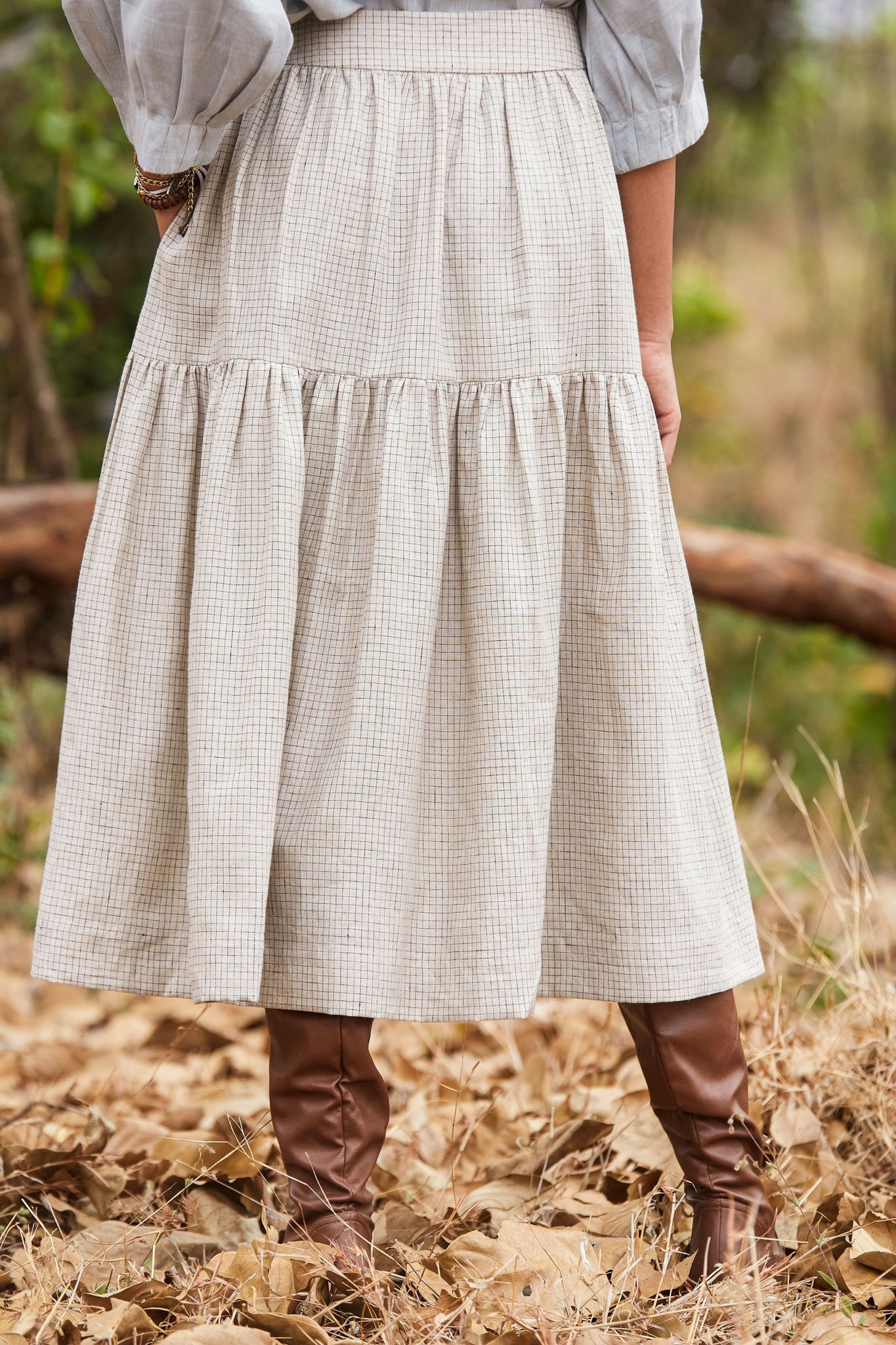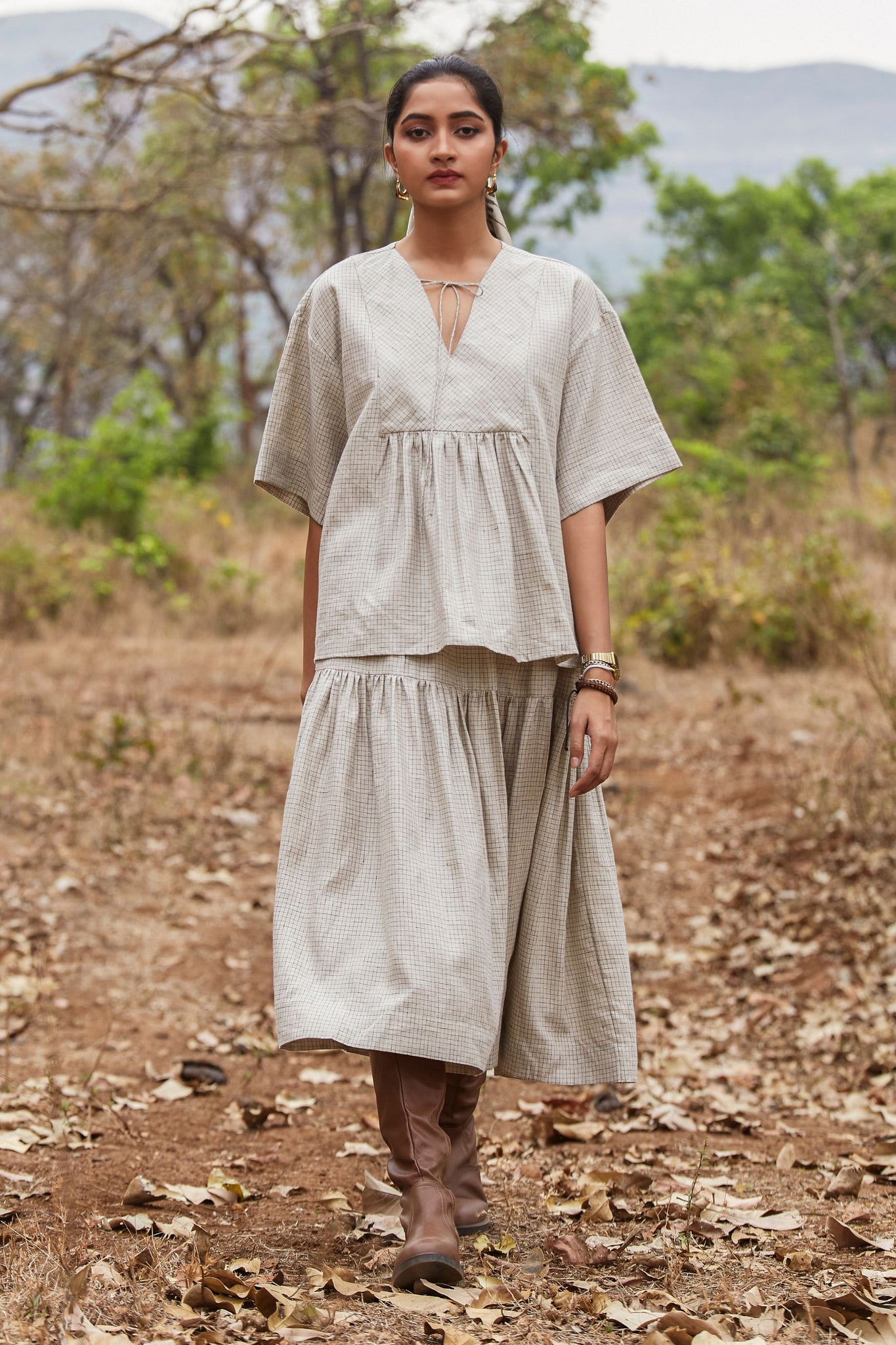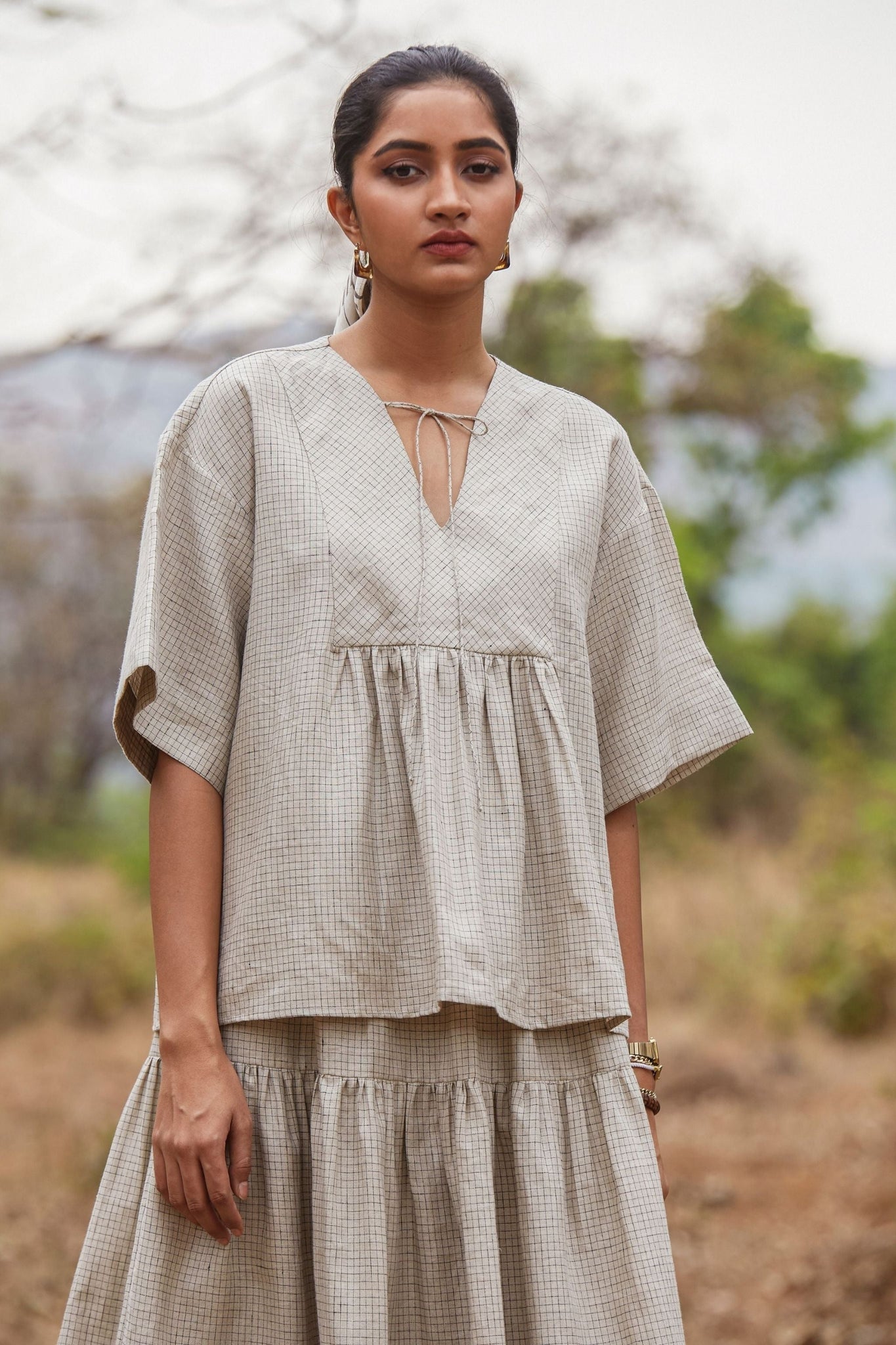 Top: Cut to an easy shape with a yoke panel. Light bohemian gathers. Summery V neck. Drop shoulder bell sleeve. Dainty checks in premium linen.