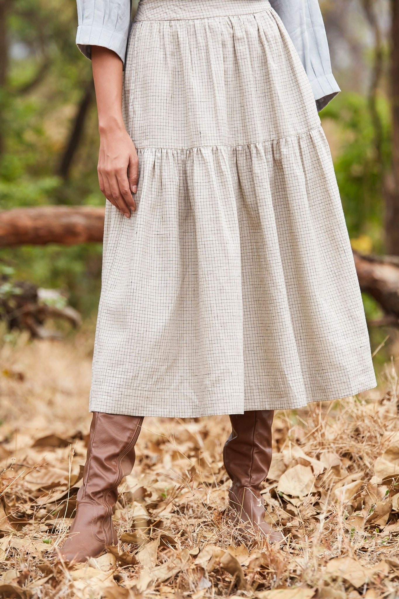Skirt: Textured intricate gathers at waist and yoke. Fitted waistband with concealed zip on the side. Lower-calf length.